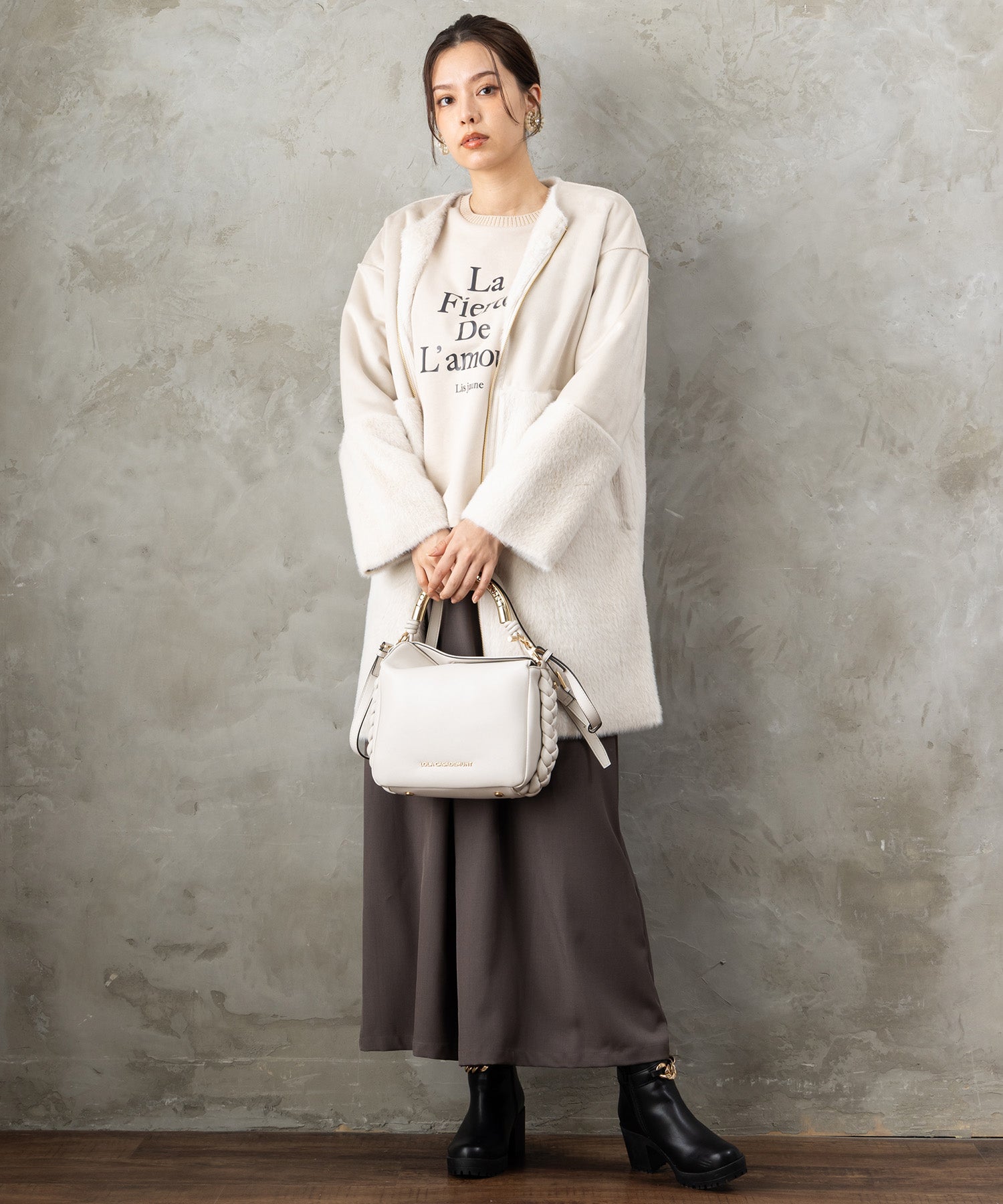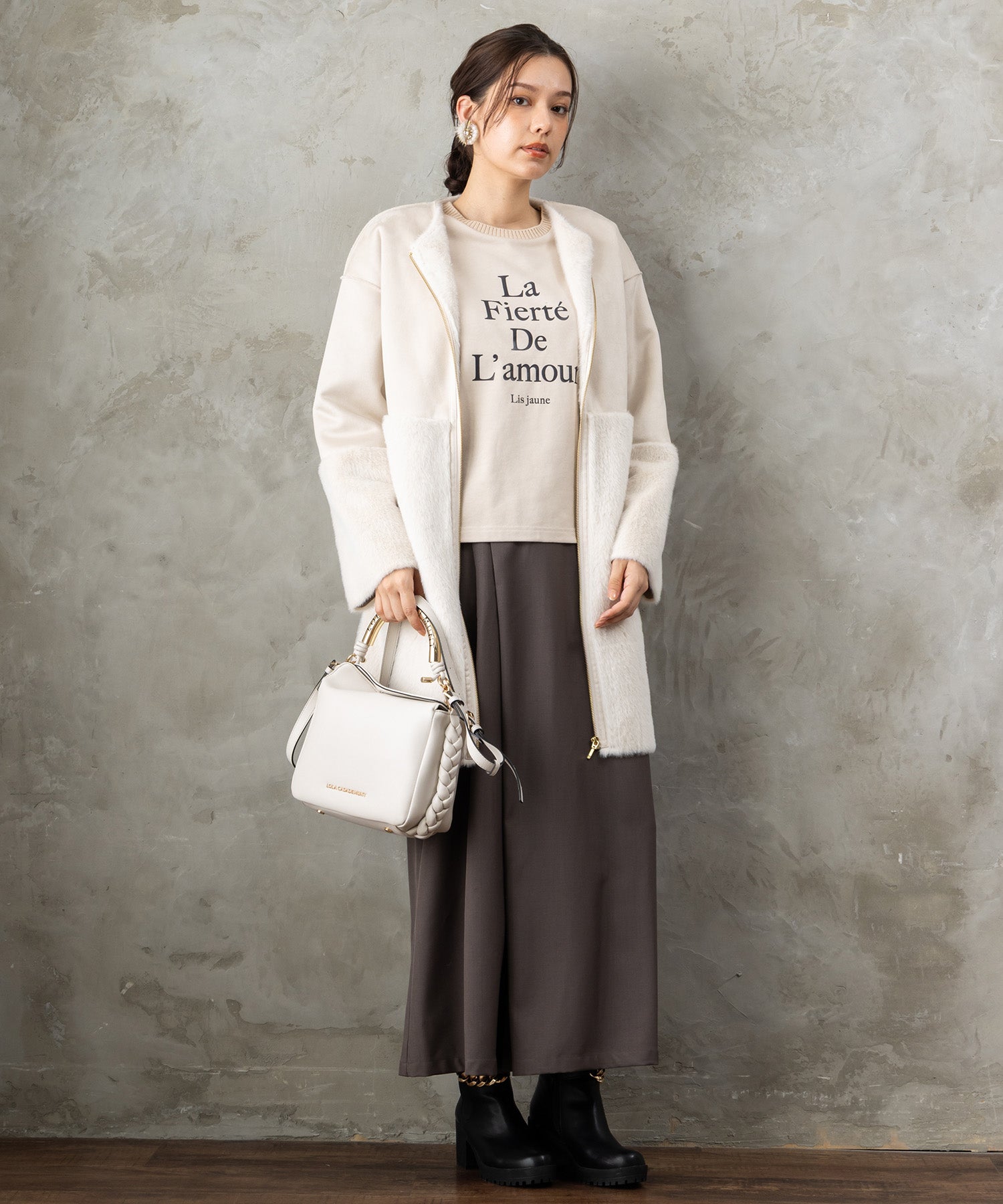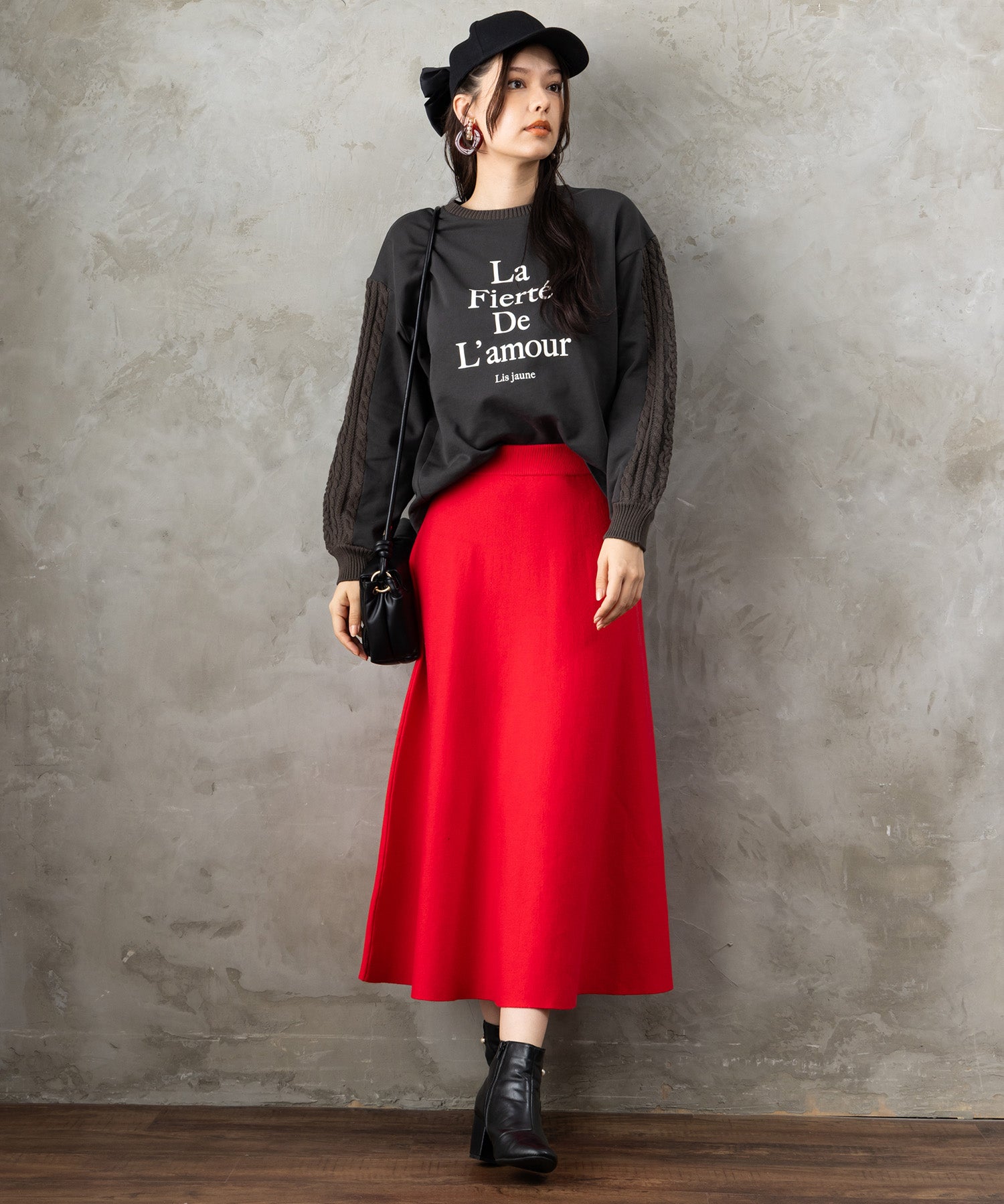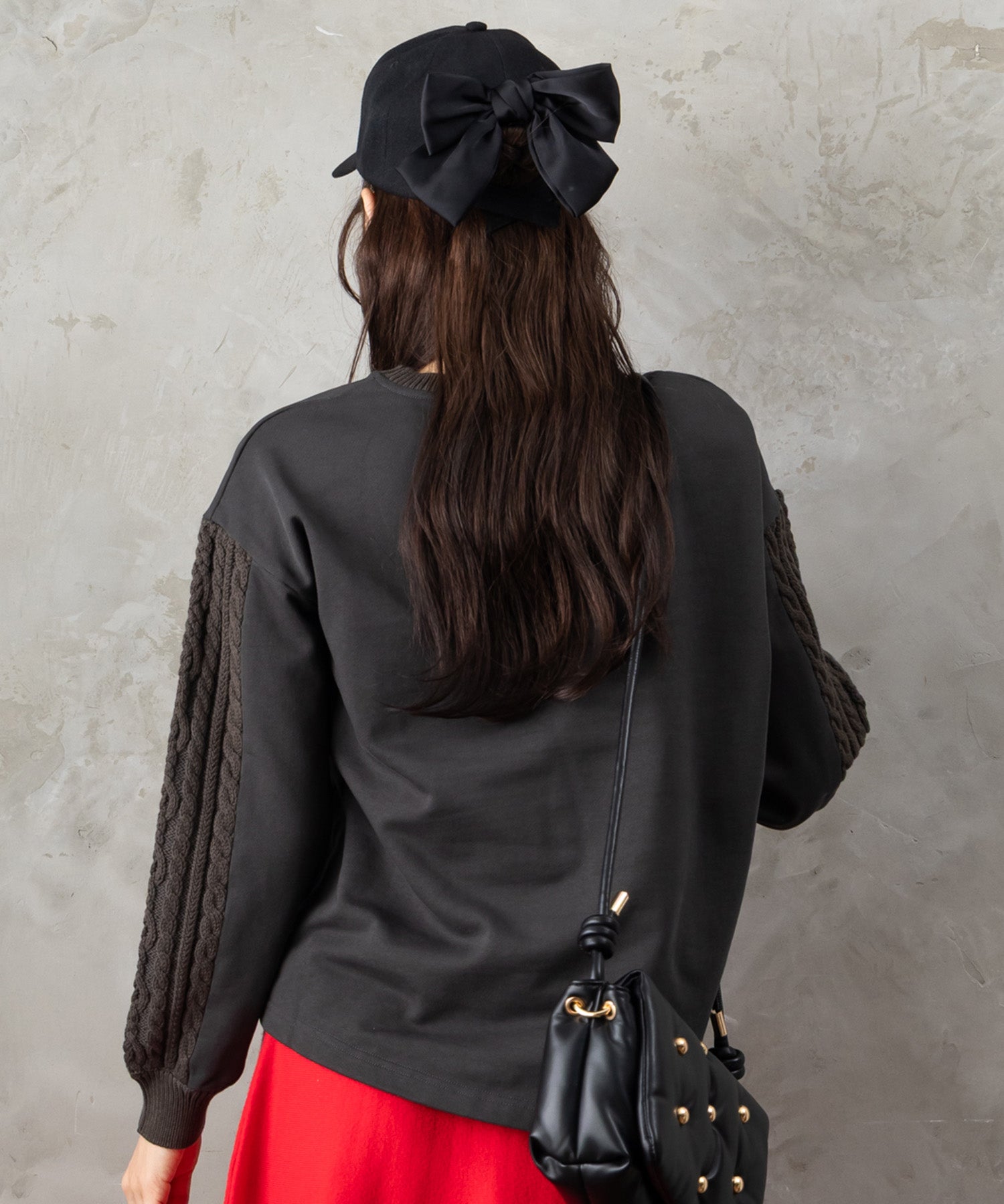 フロントに施したフレンチロゴが、シンプルながらも存在感を放つスウェット。袖や背面にさりげなくケーブル編みを組み合わせたデザインで、カジュアルな中にも女性らしい柔らかさをプラスしました。