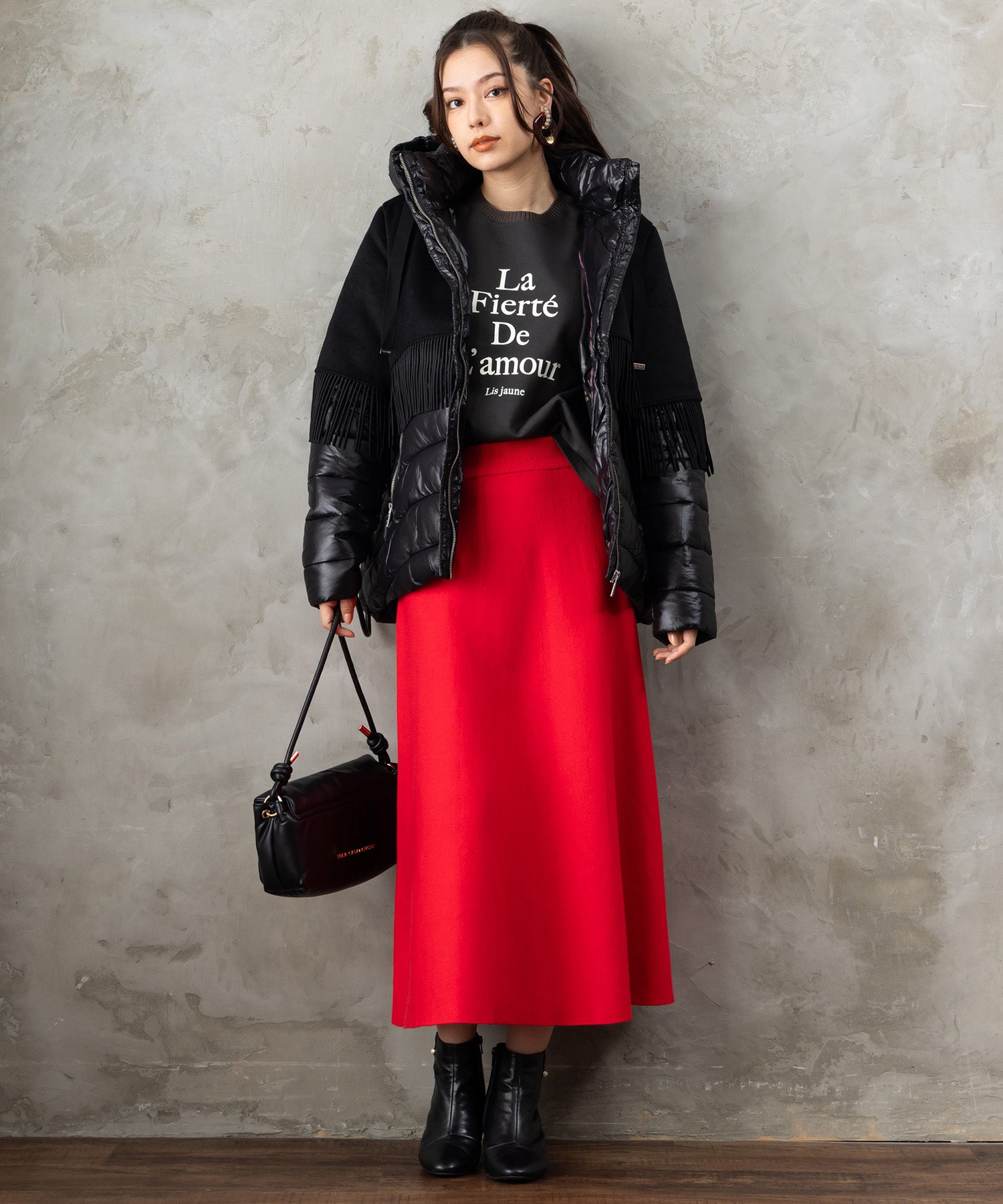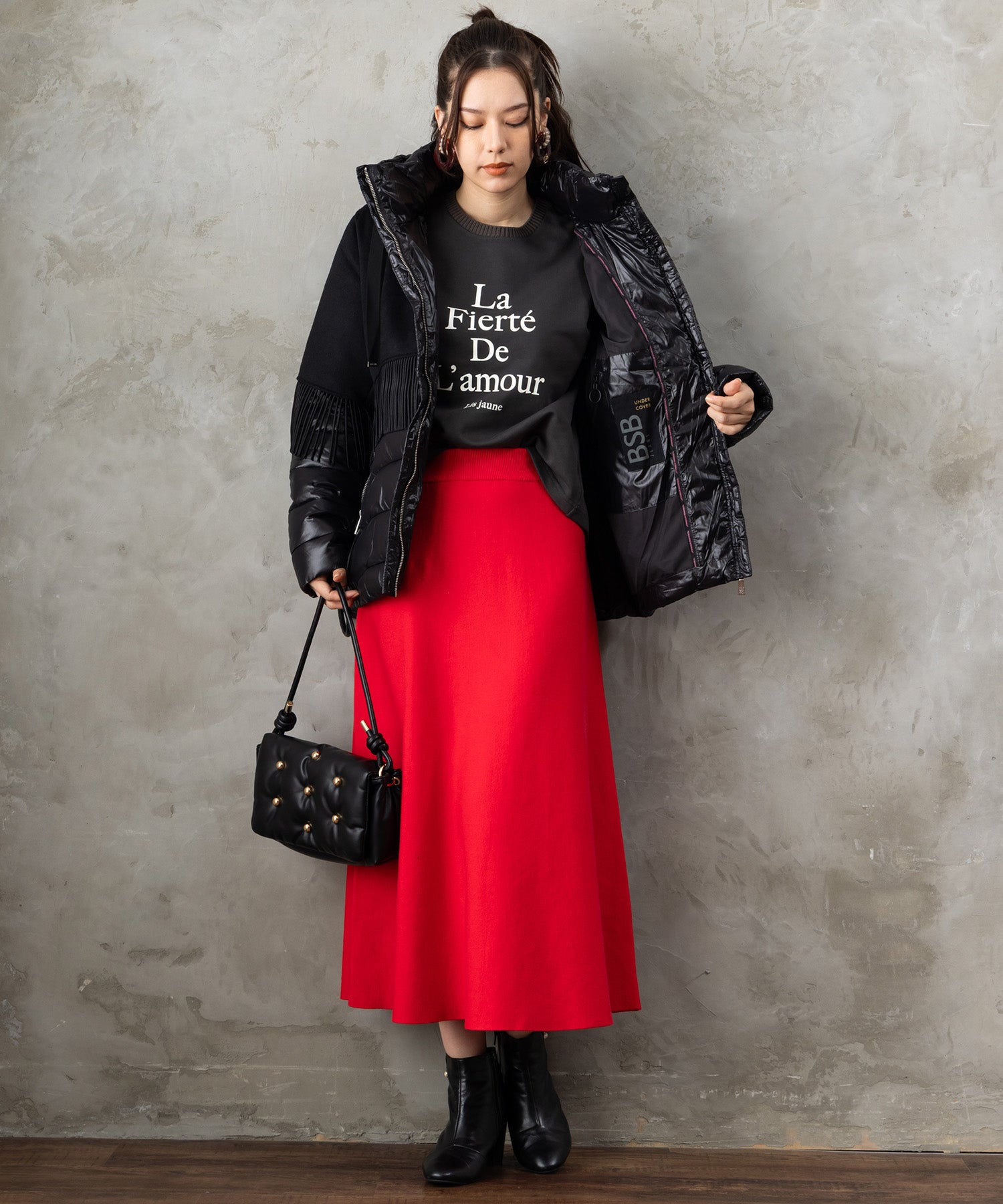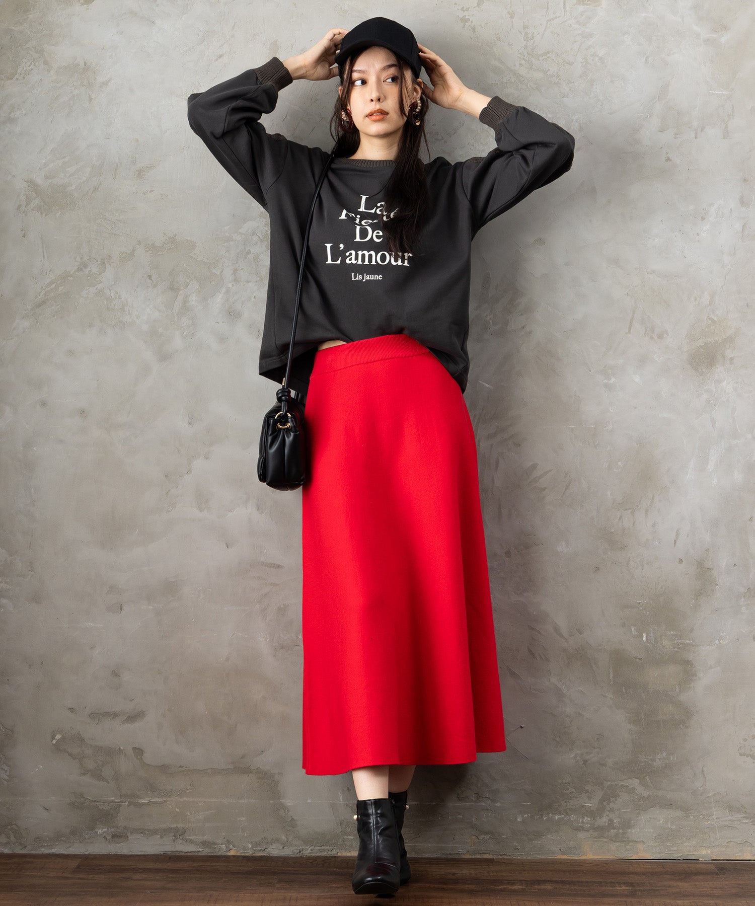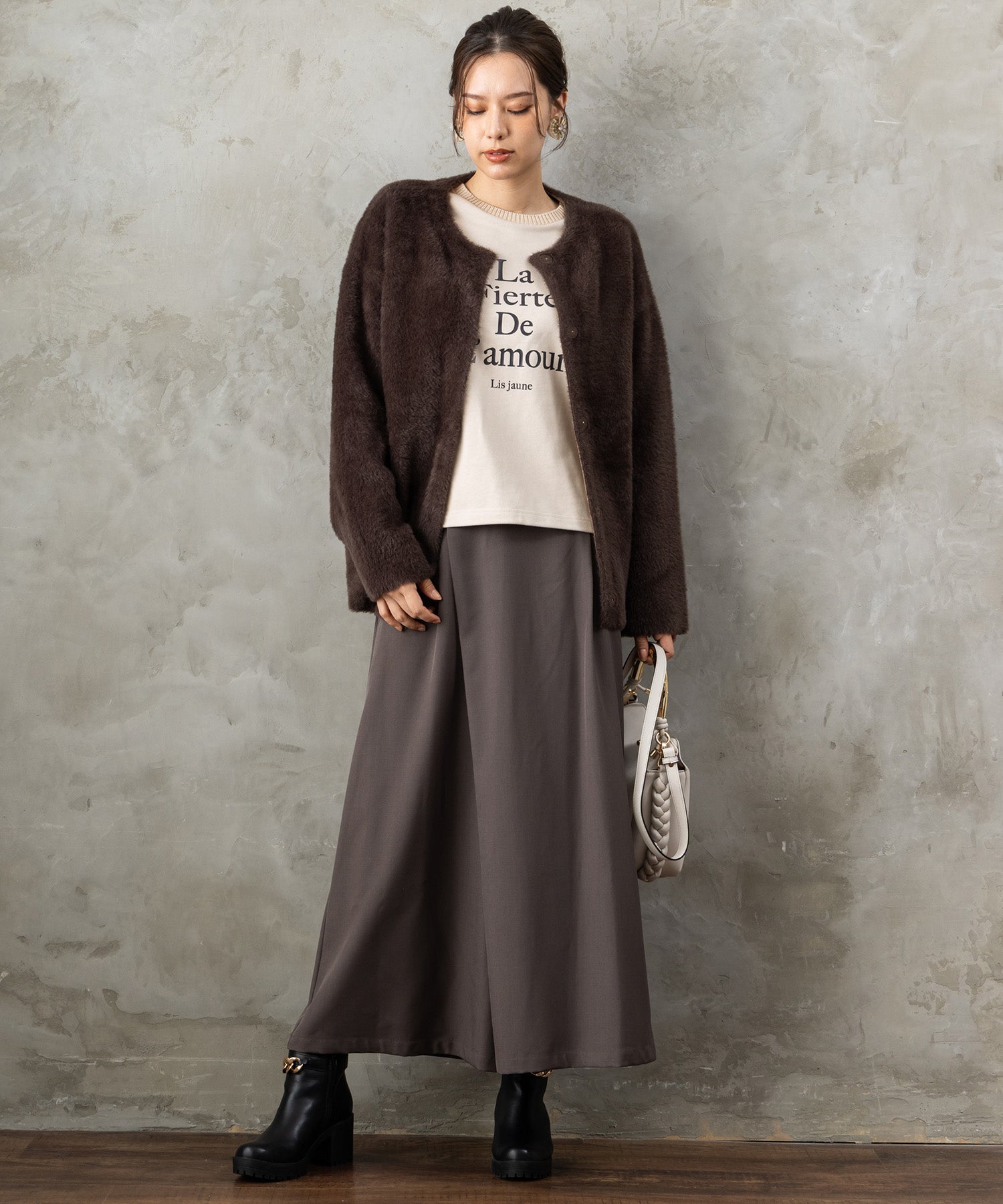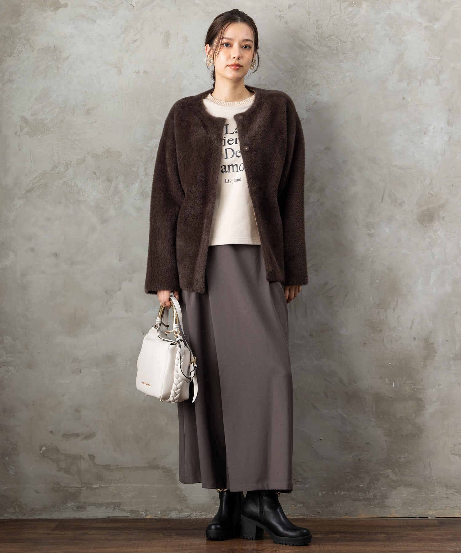 プリーツスカートを合わせてフェミニンに。デニムやワイドパンツと組み合わせれば、大人のリラックスカジュアルスタイルが完成します。ジャケットのインナーとしても◎。
