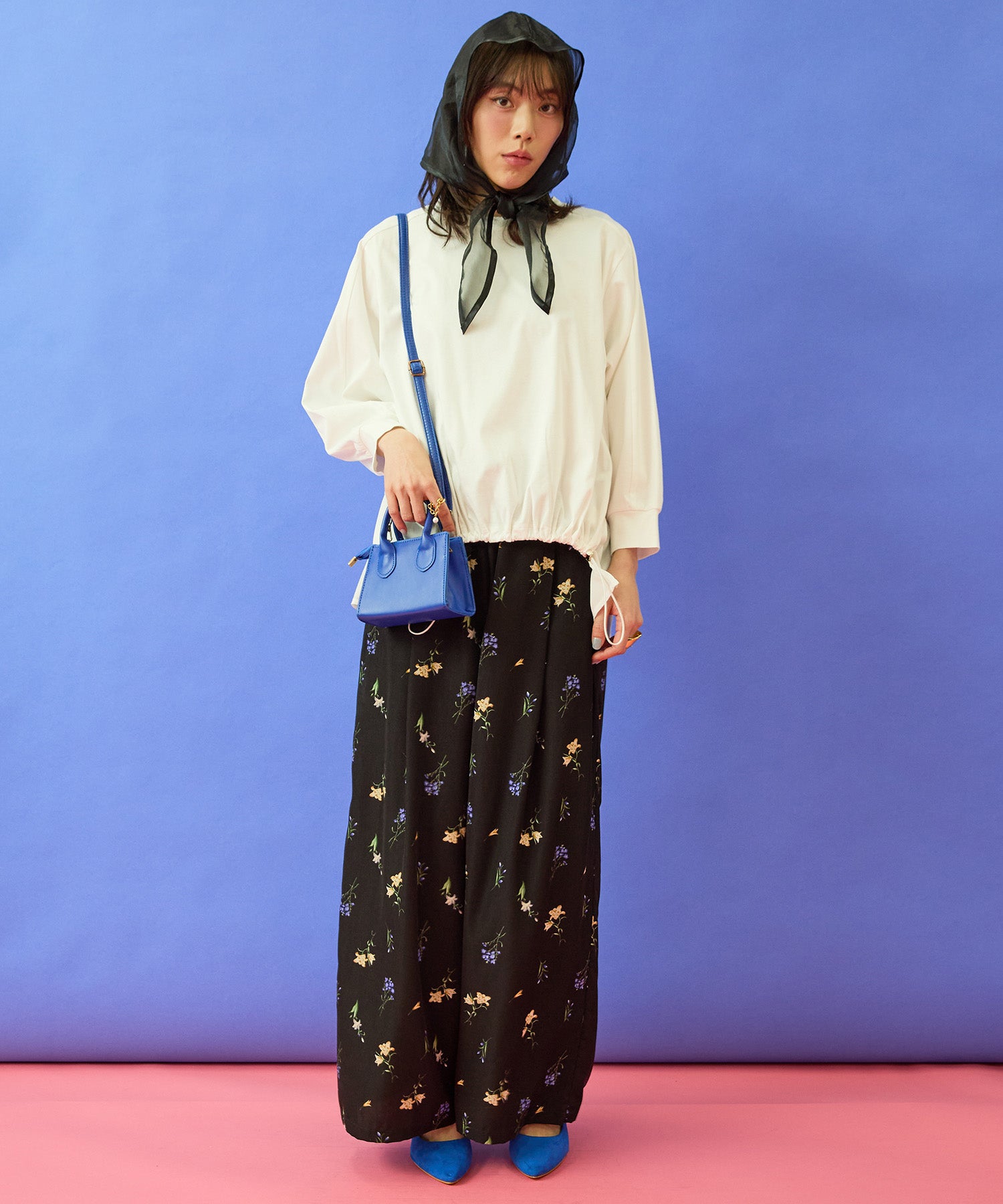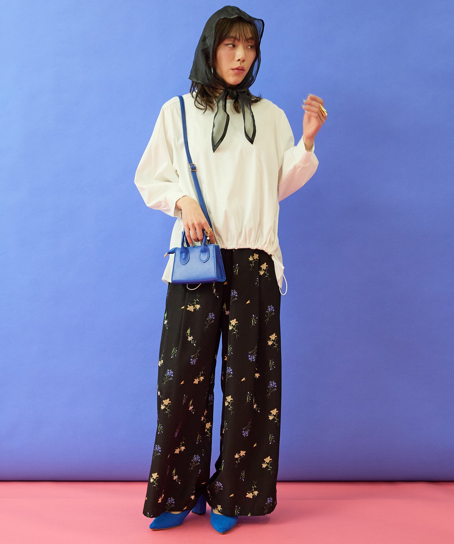 シンプルなボトムを合わせるだけで、トップスが主役のコーデが完成します。