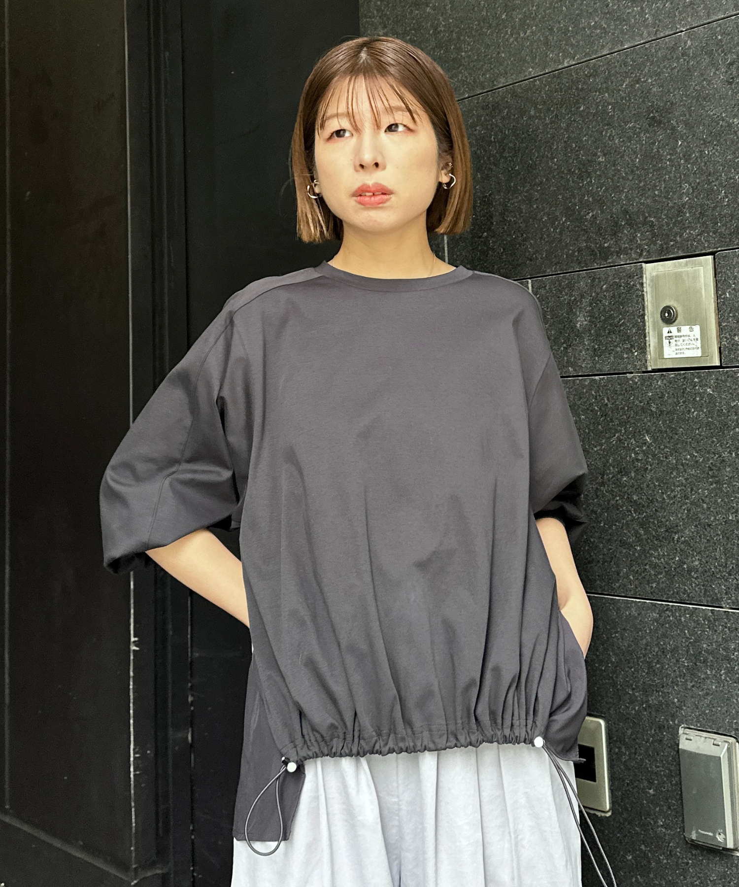 シルケットポンチのなめらかな表情に、異素材を組み合わせたデザイントップス。