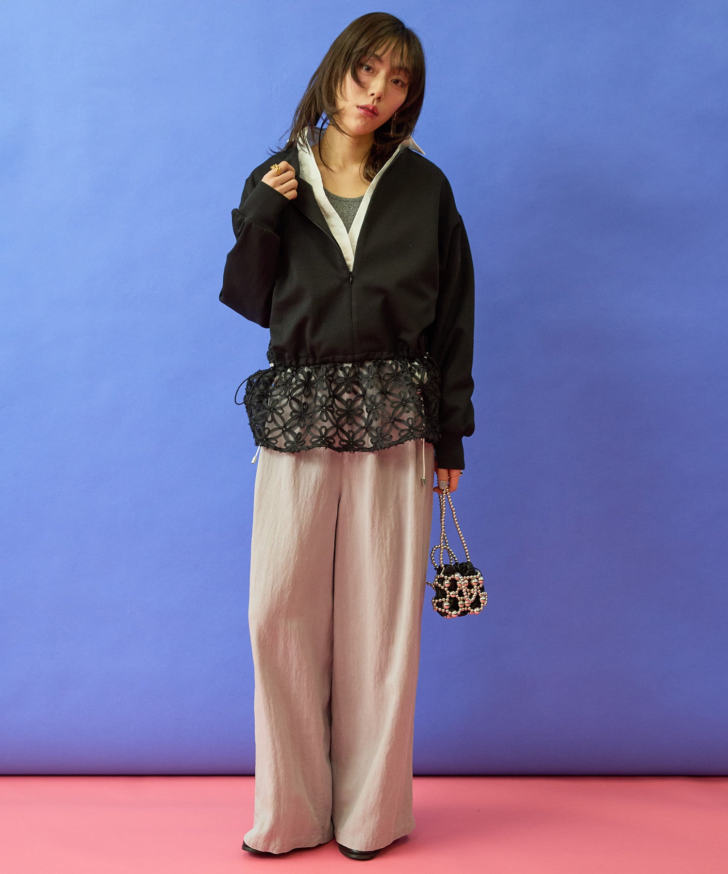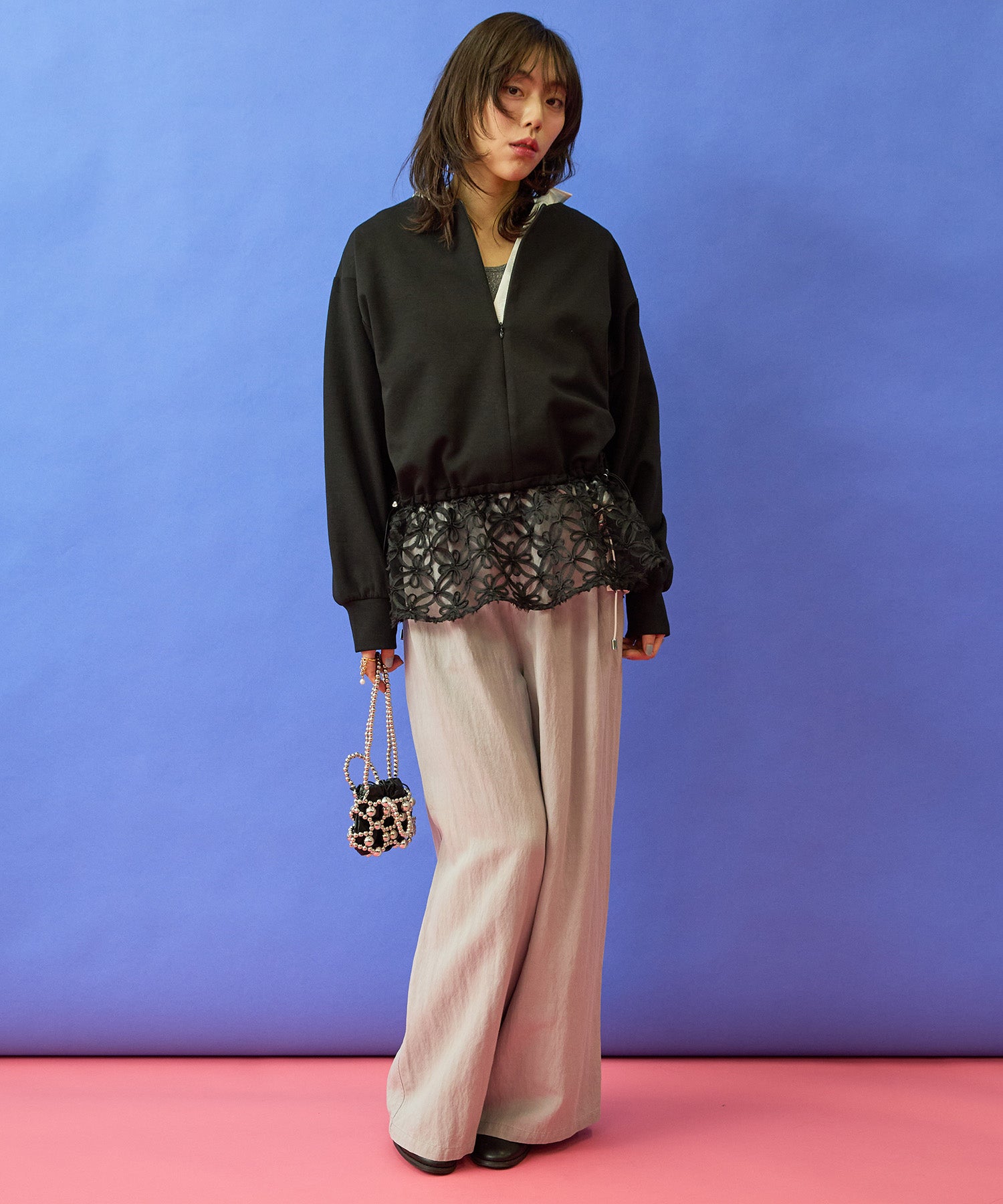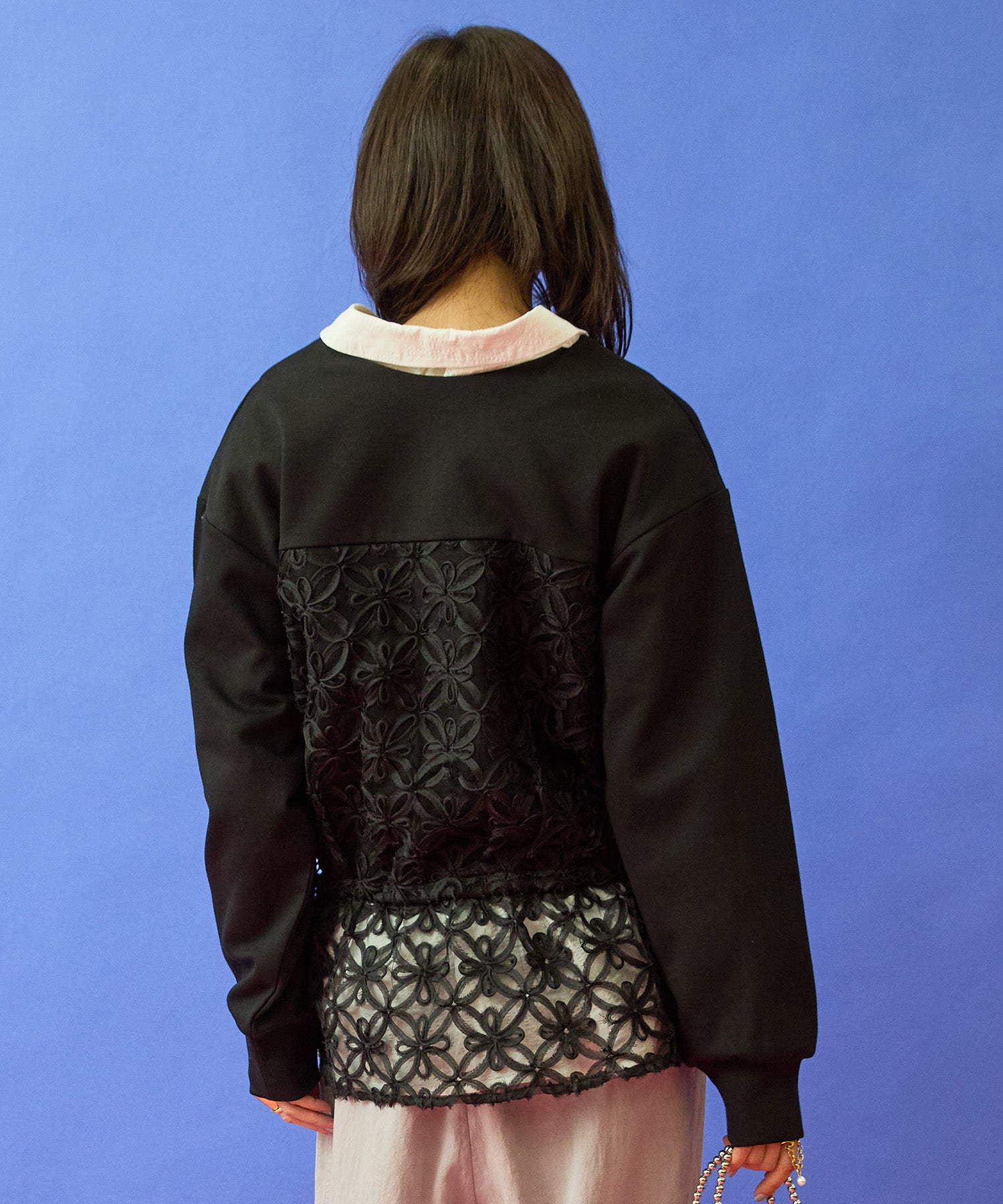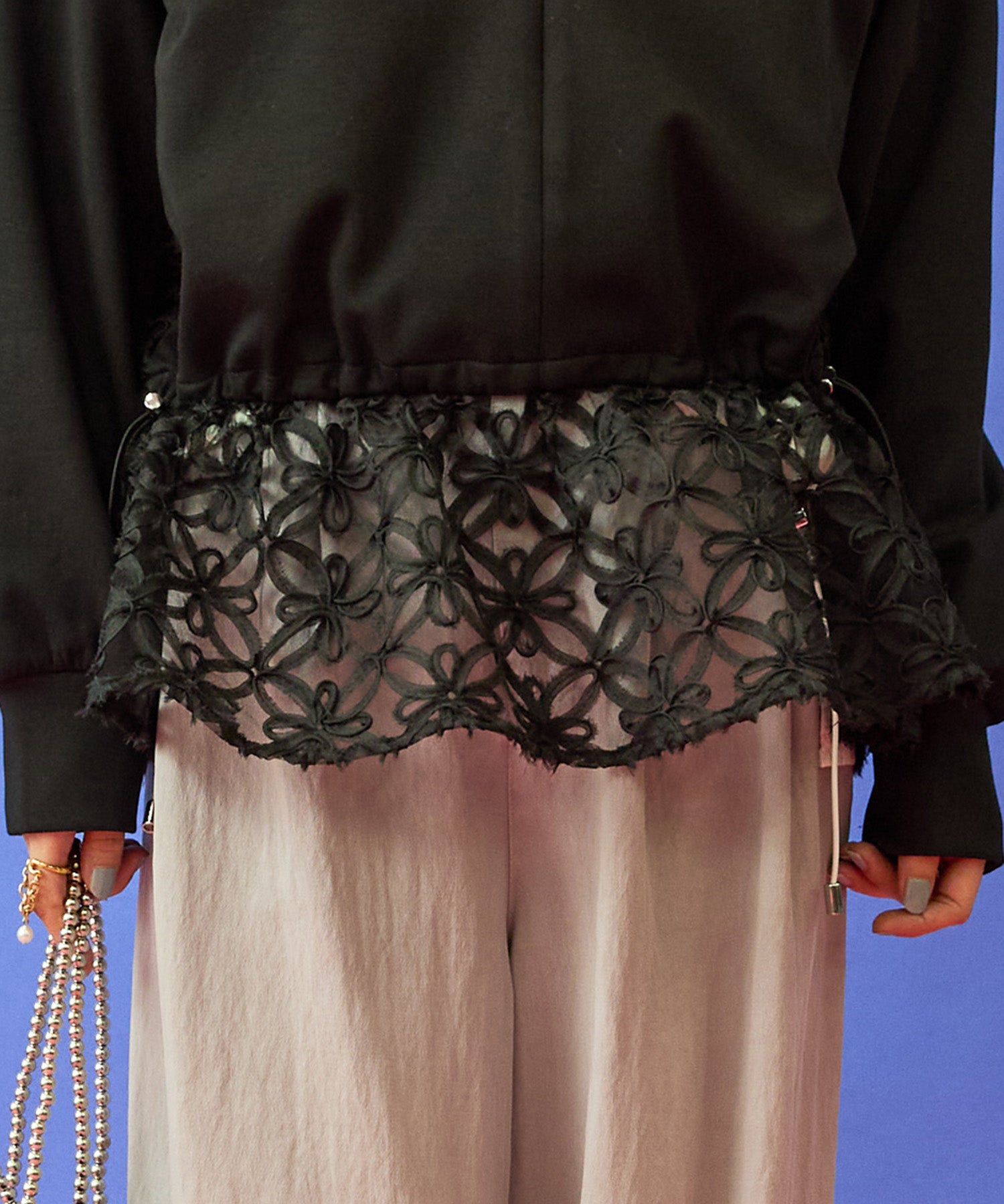 チュール刺繍を重ねた異素材コンビが、装いに奥行きと華やかさをもたらすトップス。