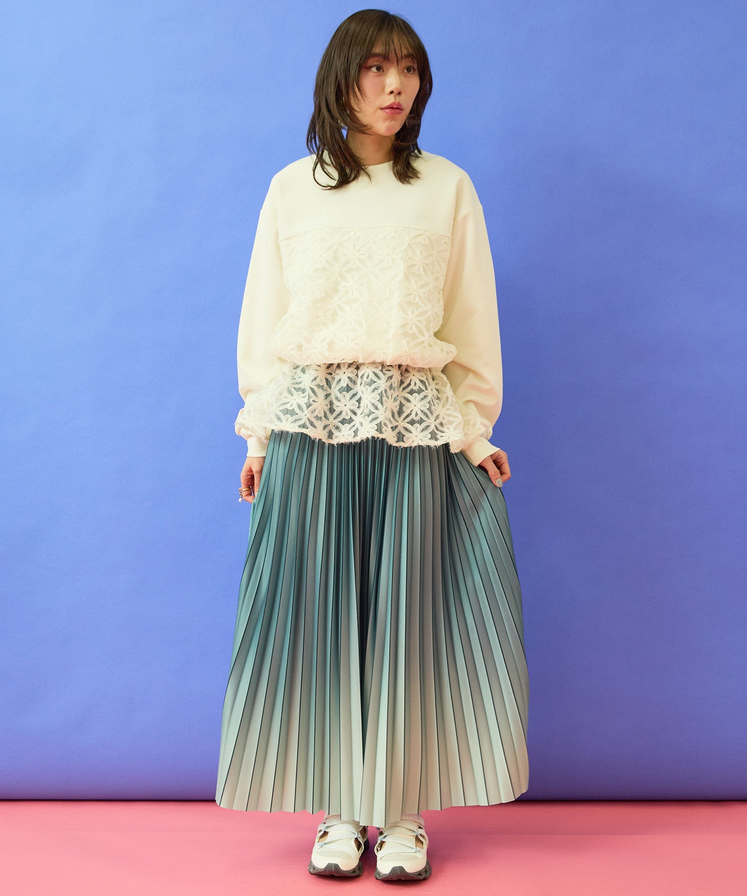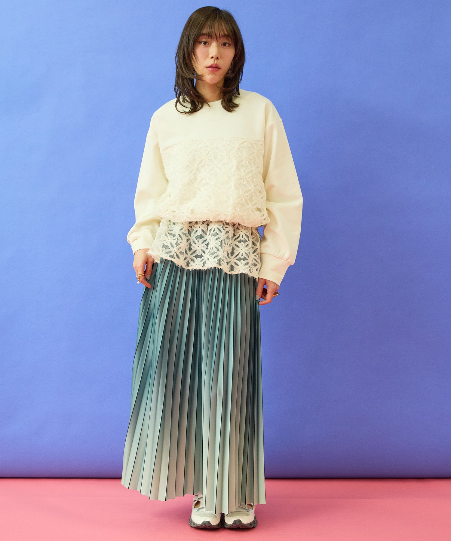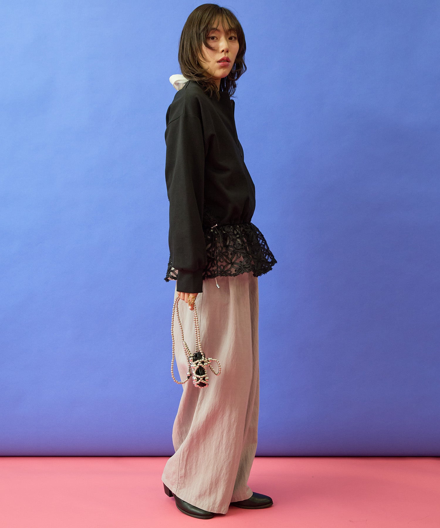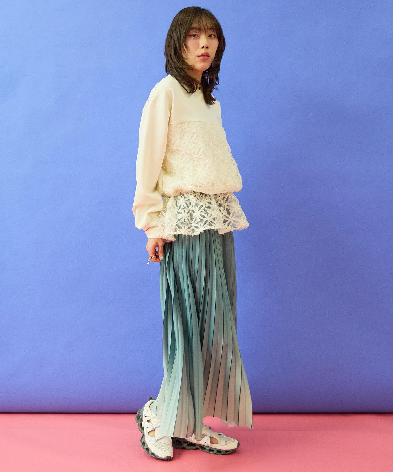 チュール刺繍を重ねた異素材コンビが、装いに奥行きと華やかさをもたらすトップス。