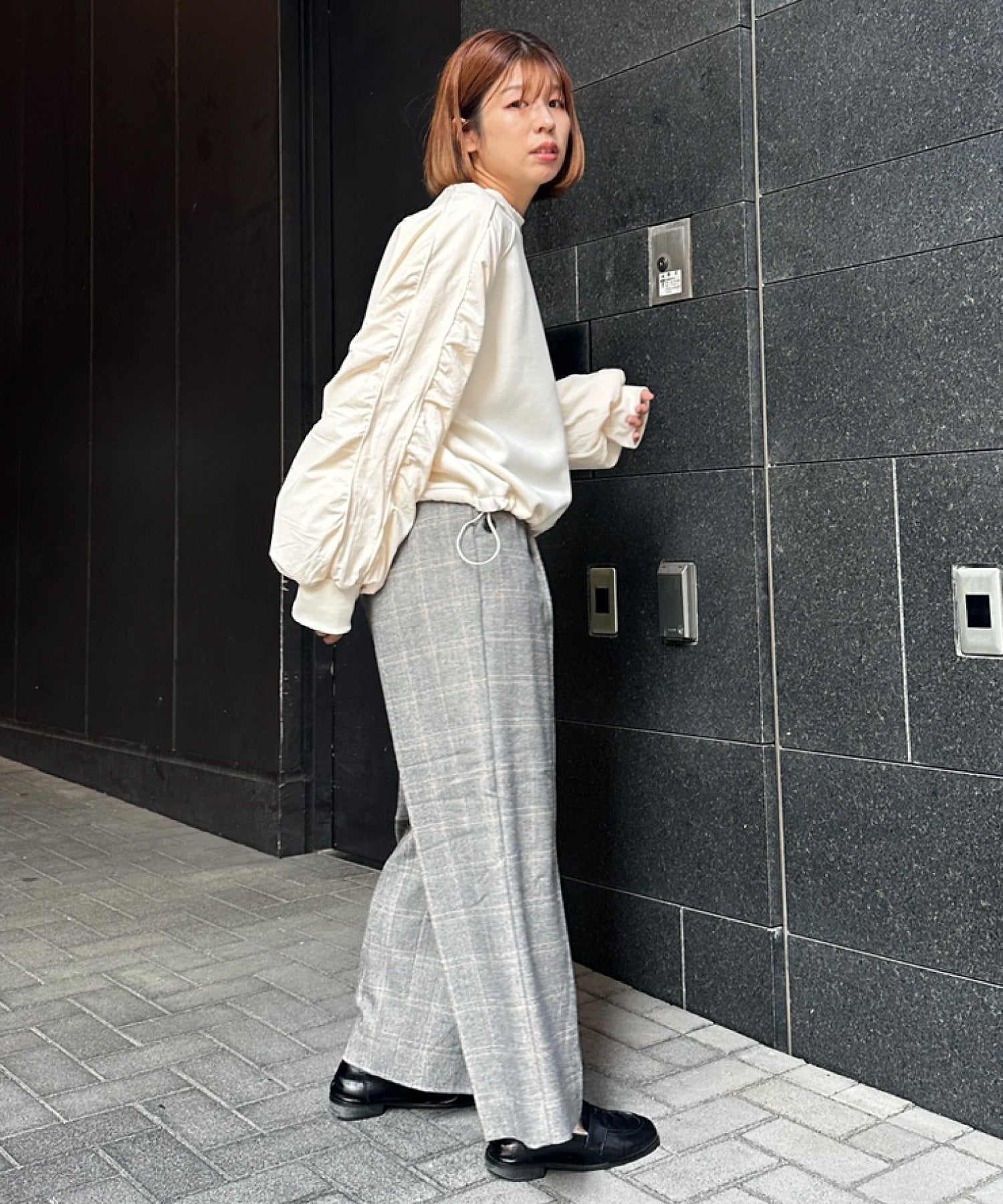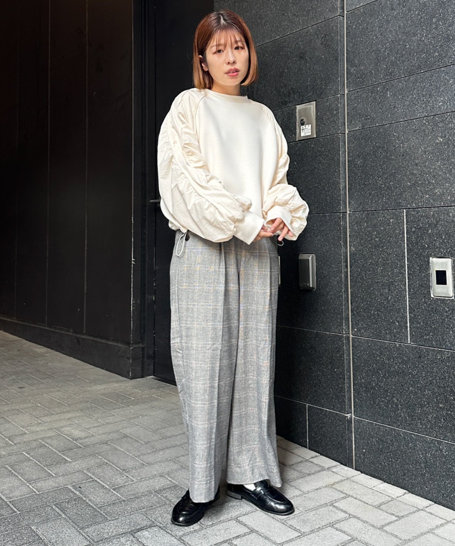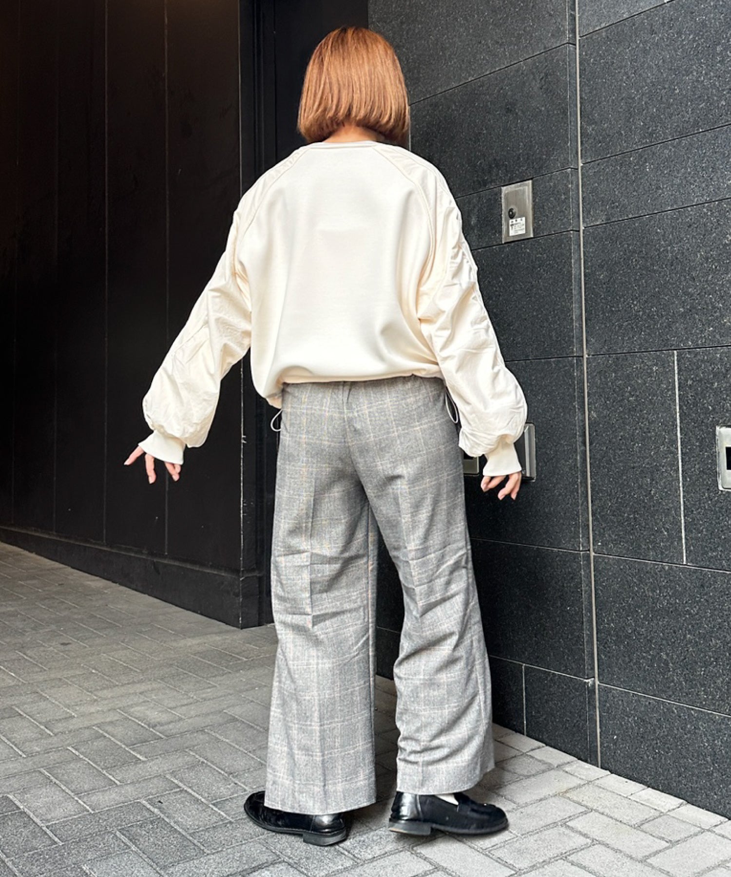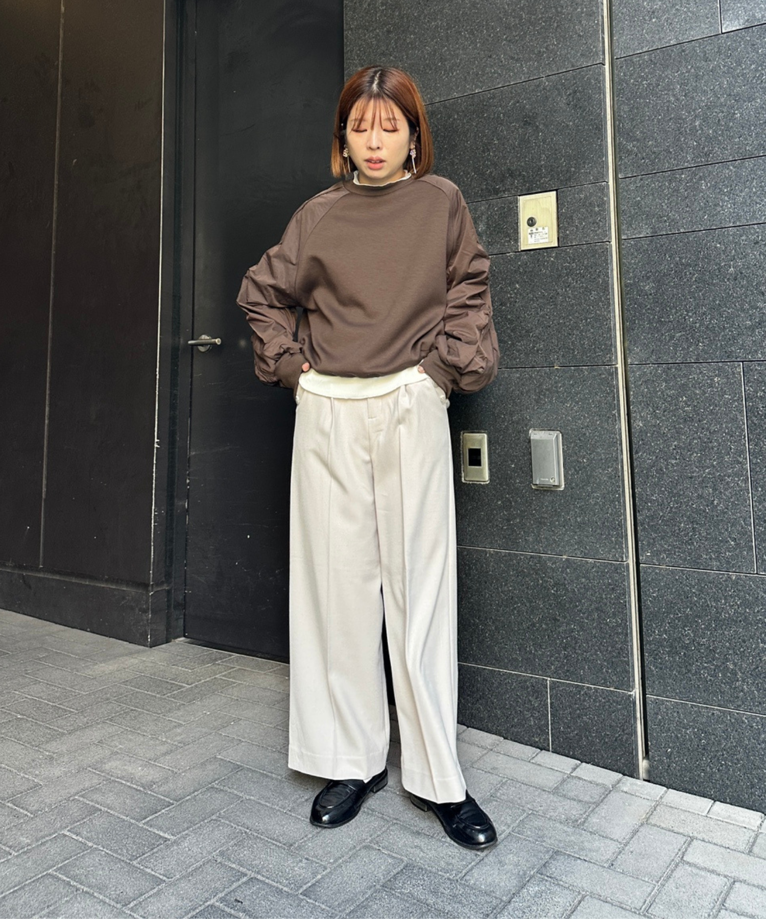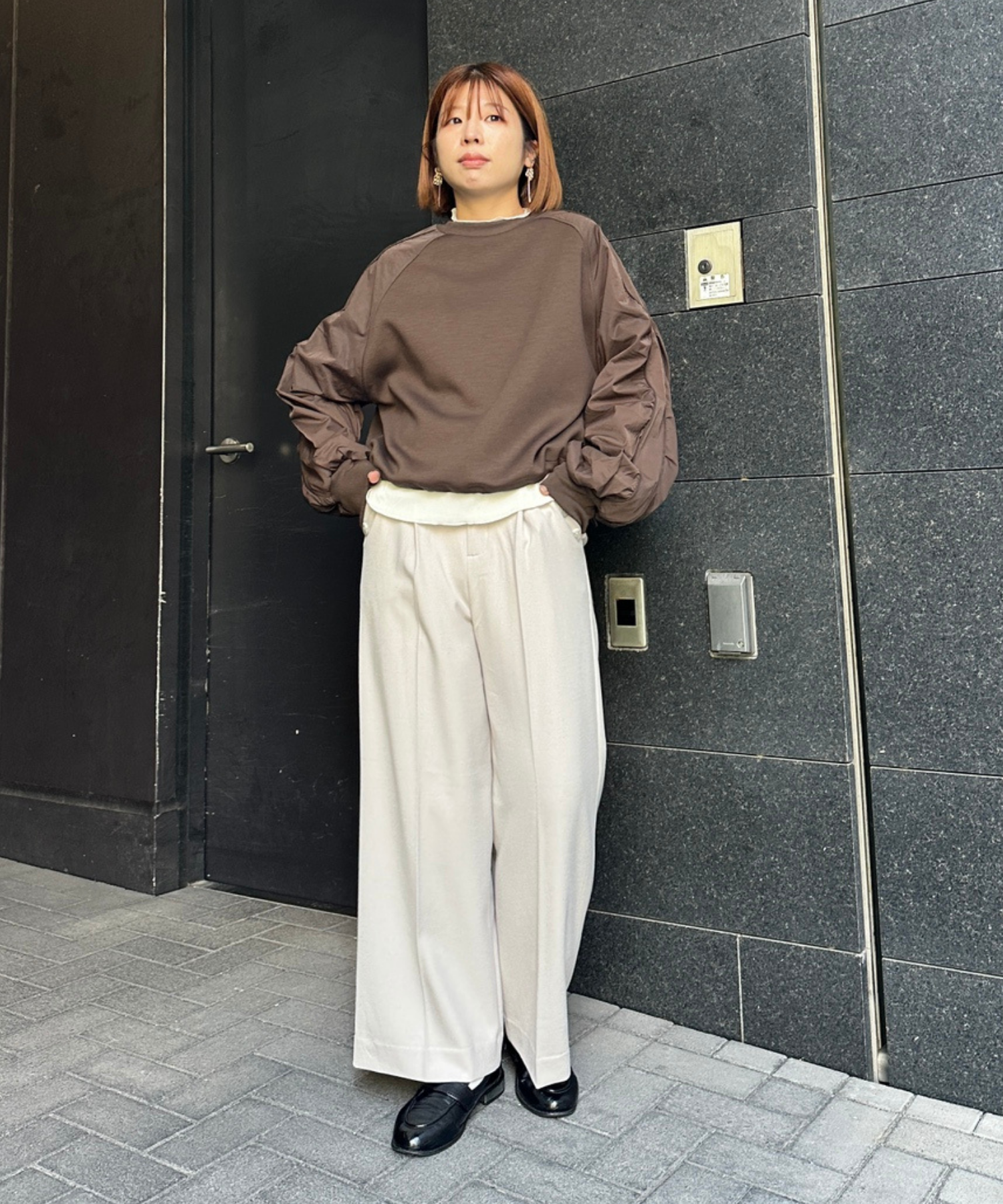 ワイドパンツやスラックスを合わせて、抜け感のあるスタイルに。