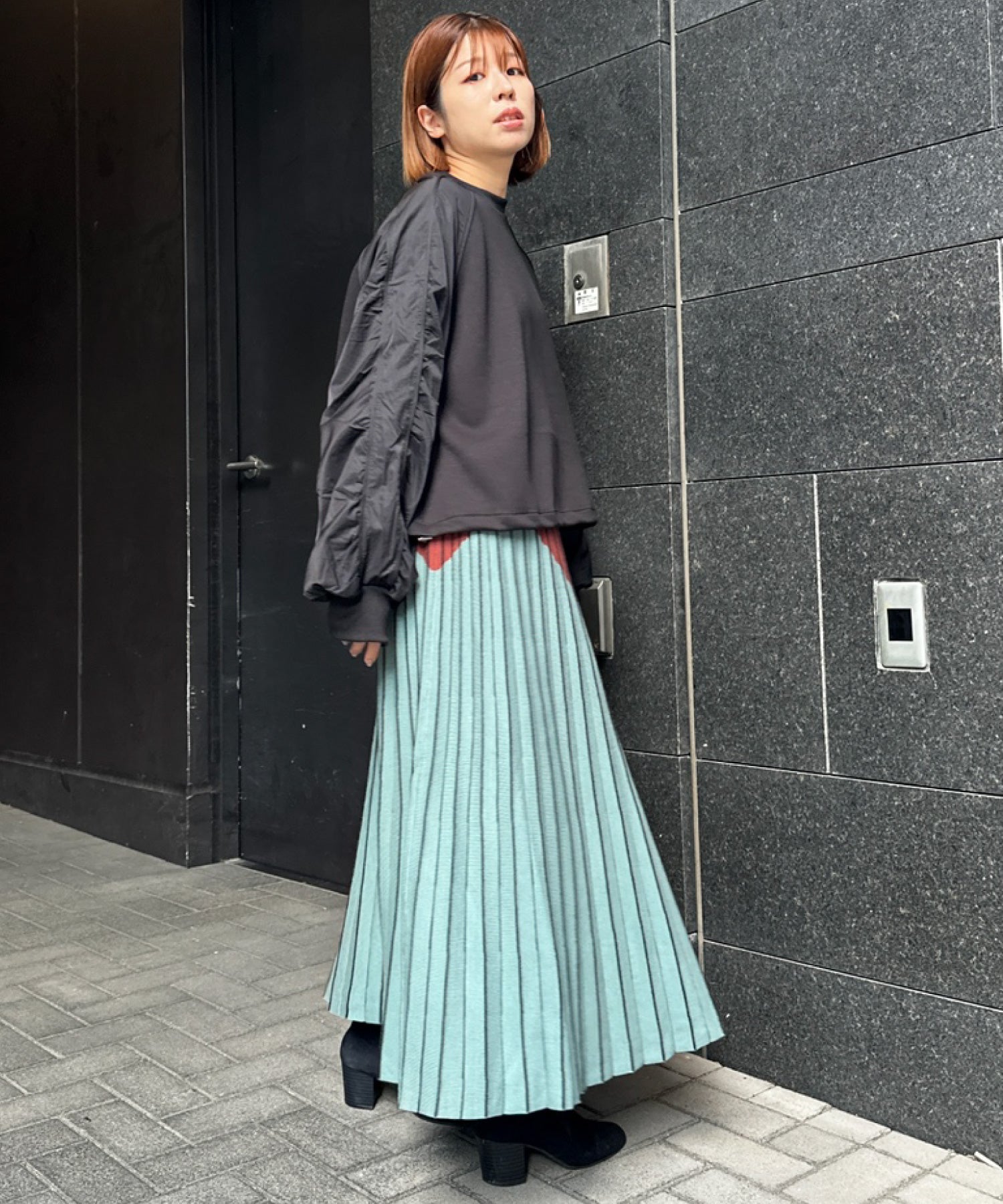 プリーツスカートやタイトスカートで女性らしさをプラスしても◎。