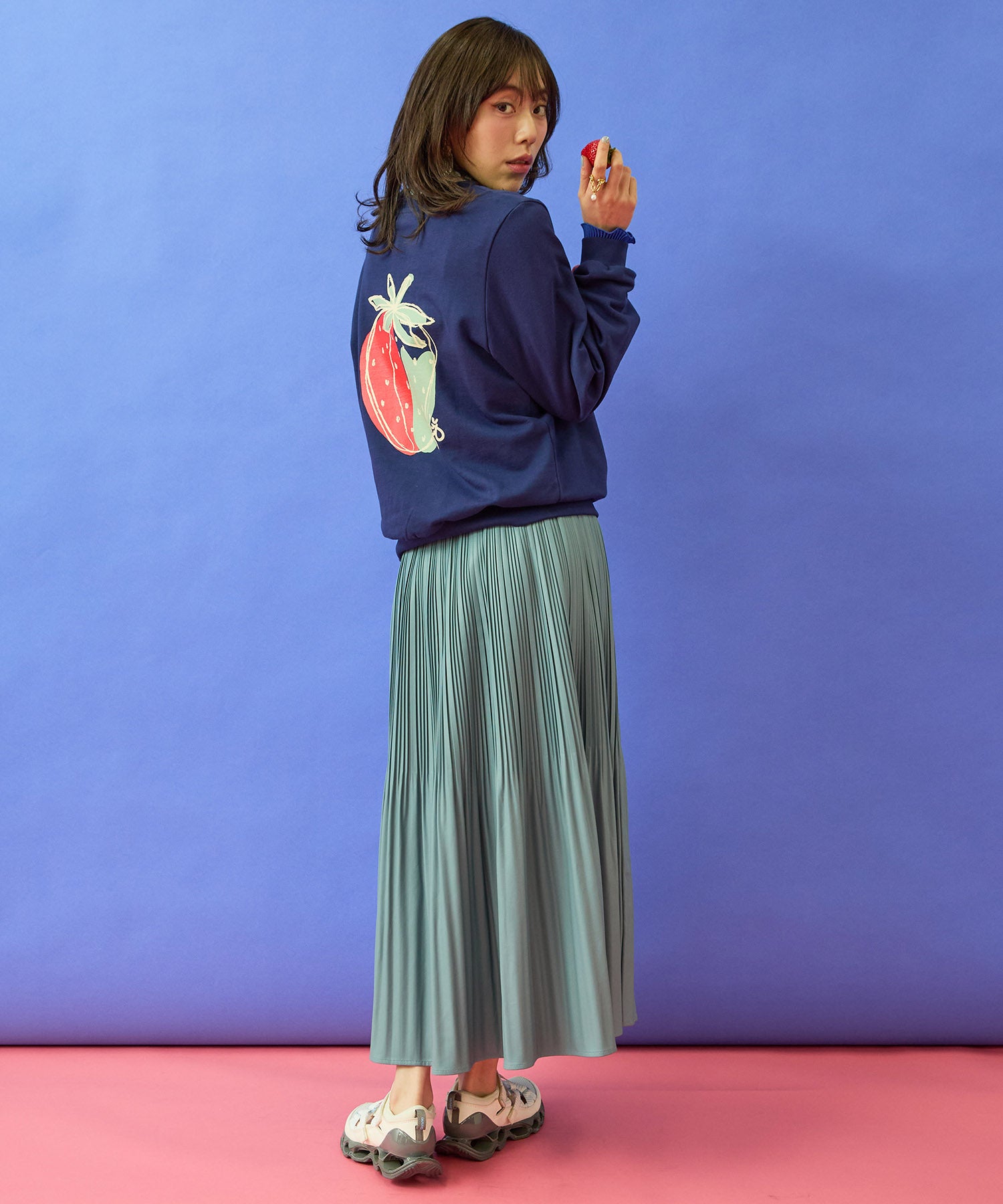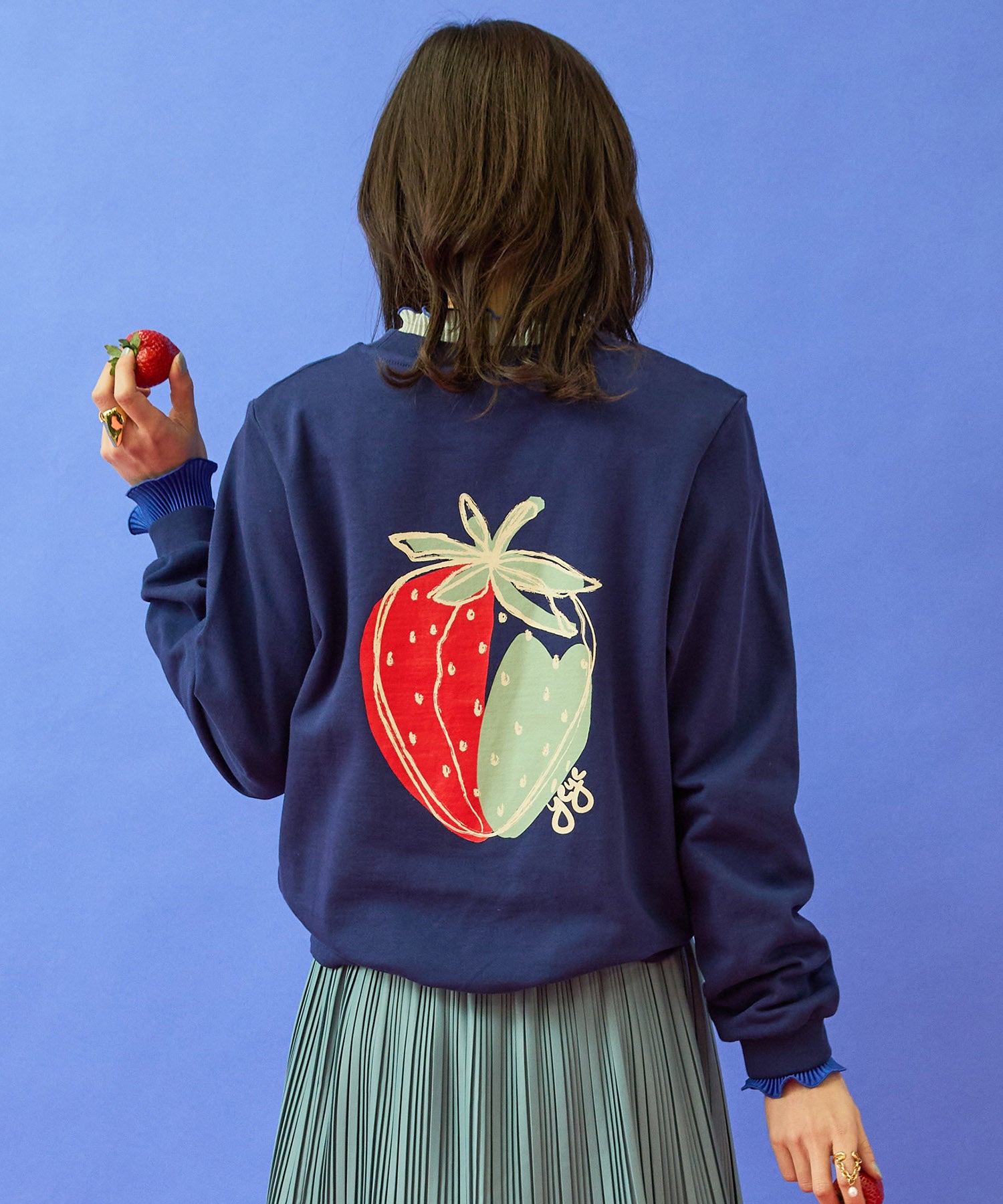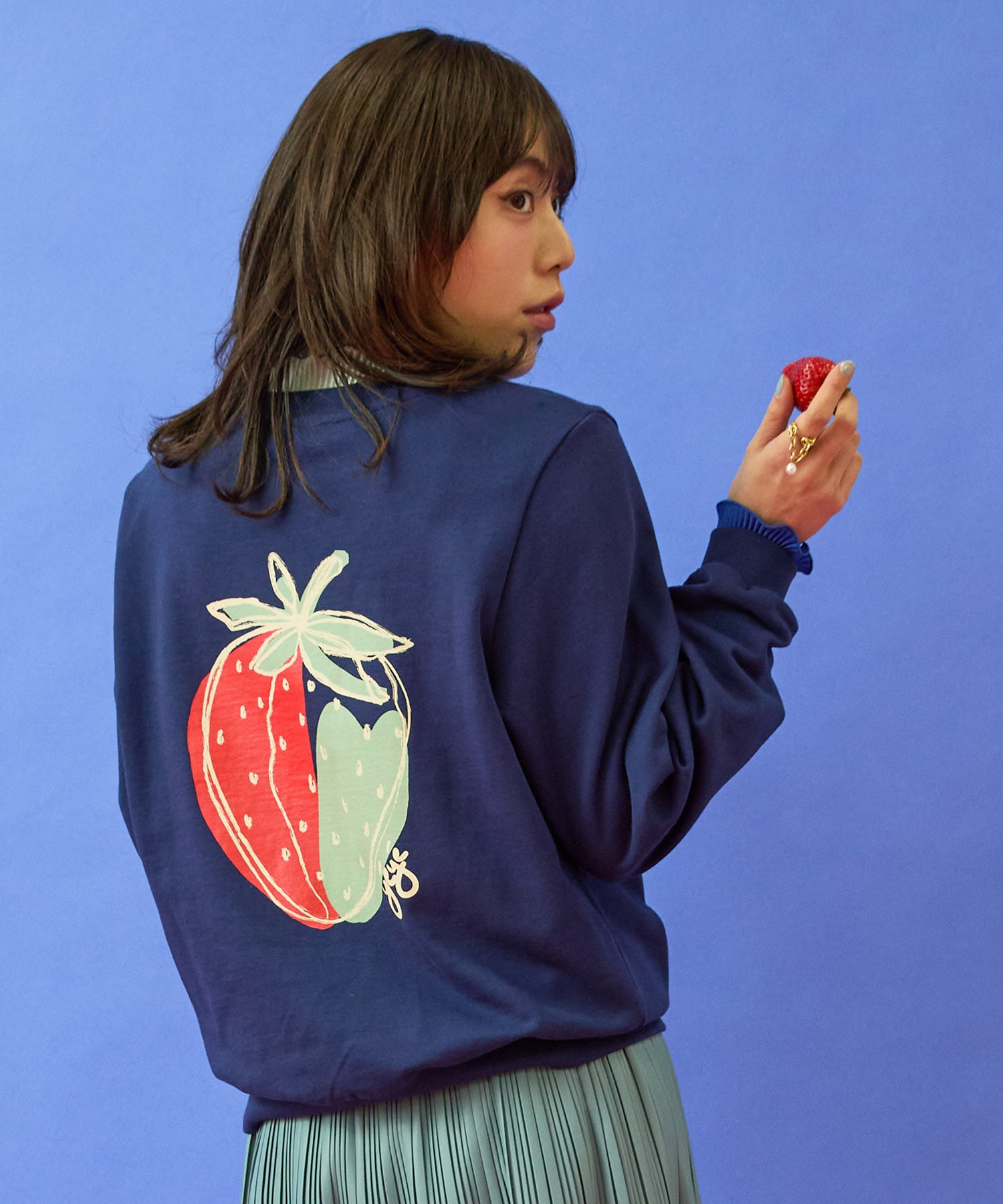 フロントは控えめに、バックに描かれたストロベリーアートが印象的なスウェット。