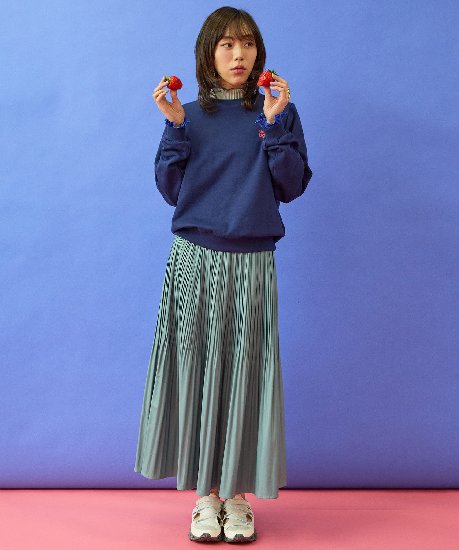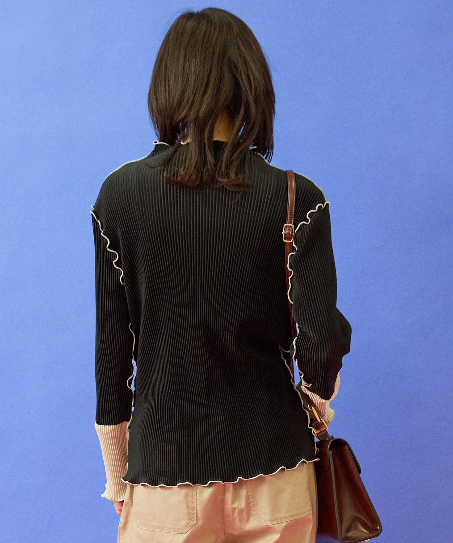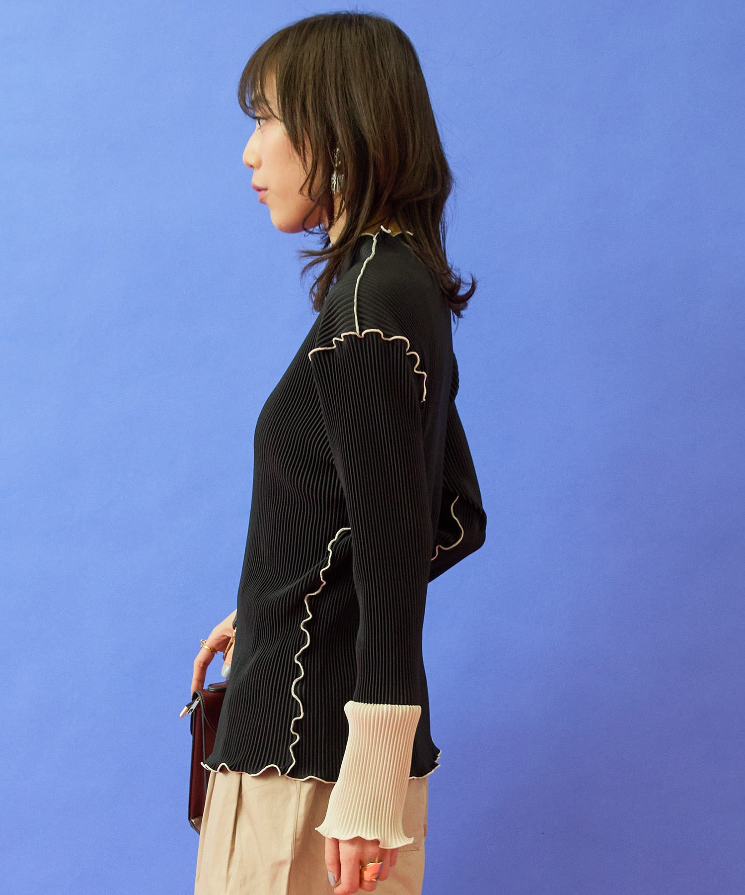 細やかなプリーツが縦のラインを美しく引き立てる、ちびハイネックのカットソー。