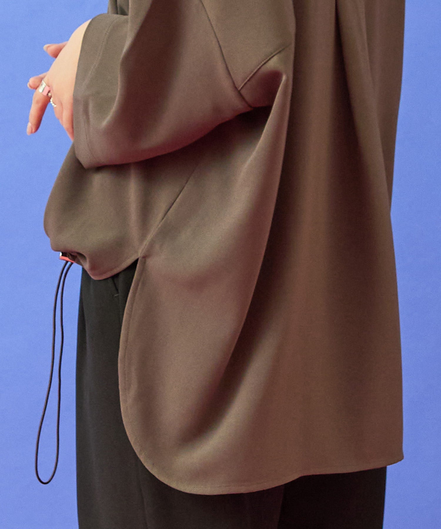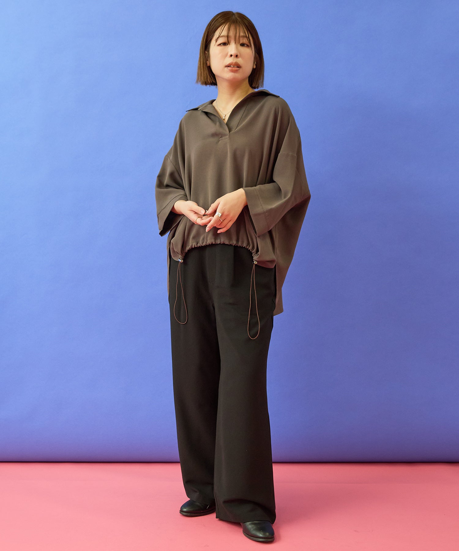 首元のほどよい開きと、ドロストで調整できるシルエットが、ラフになりすぎない印象に。