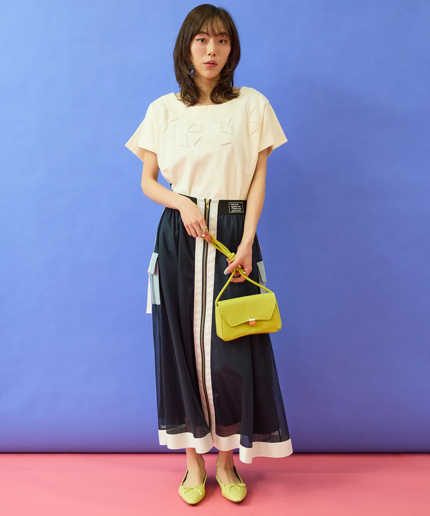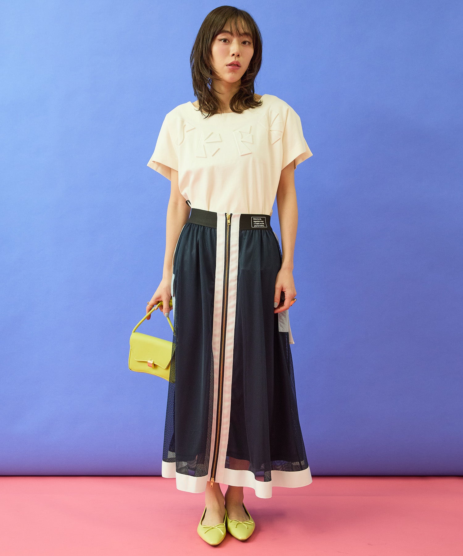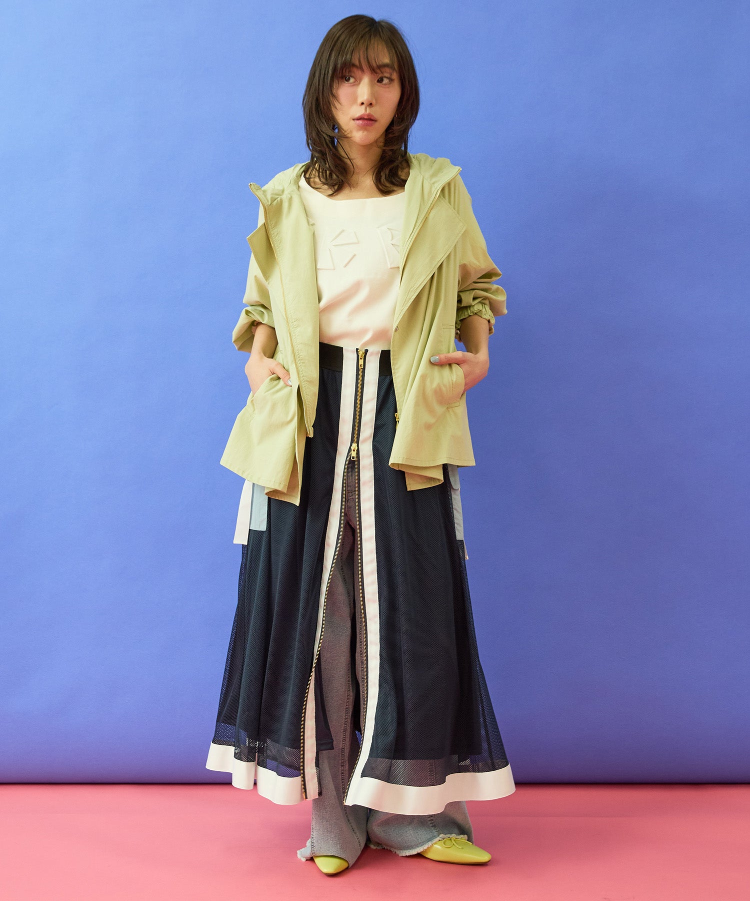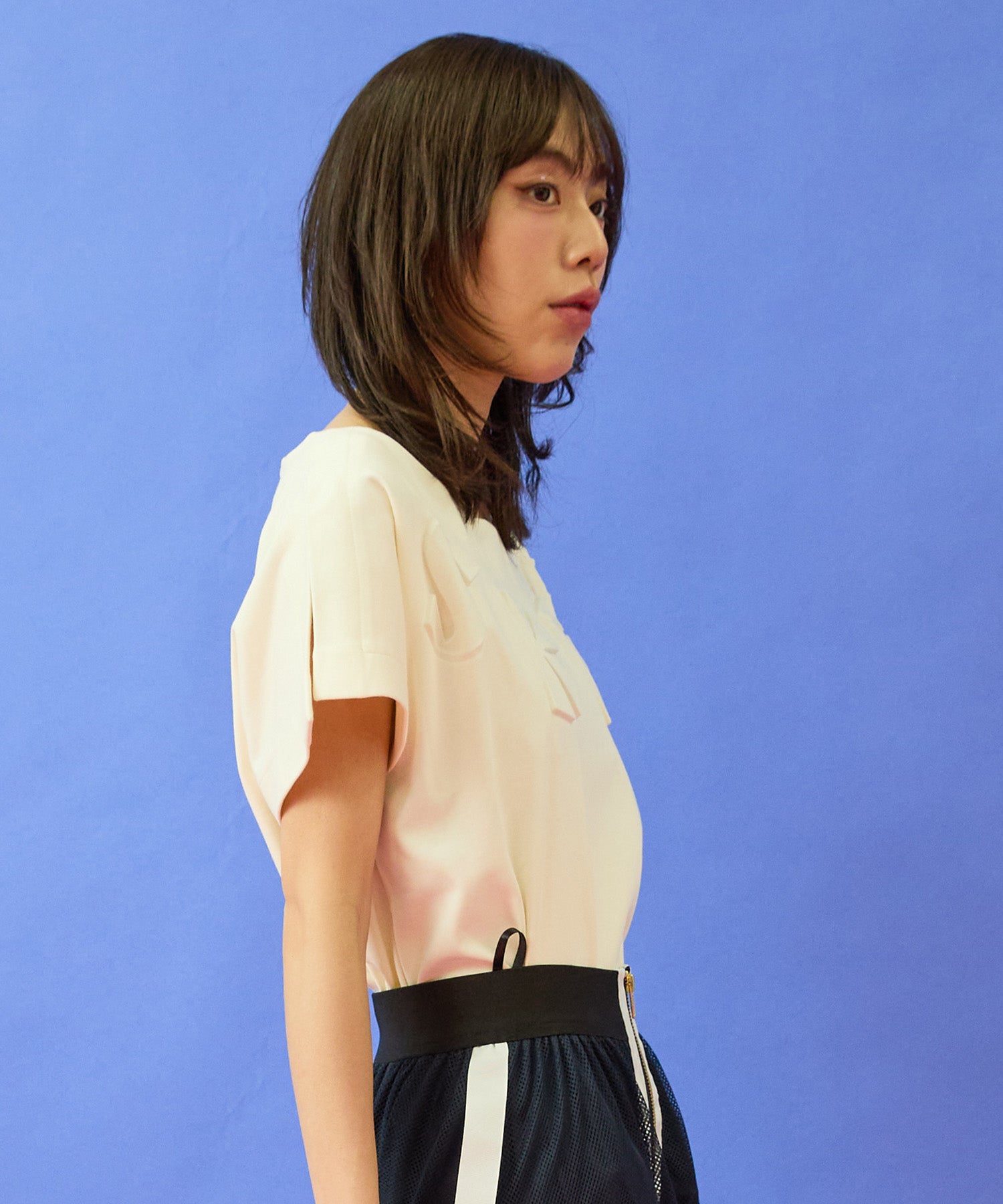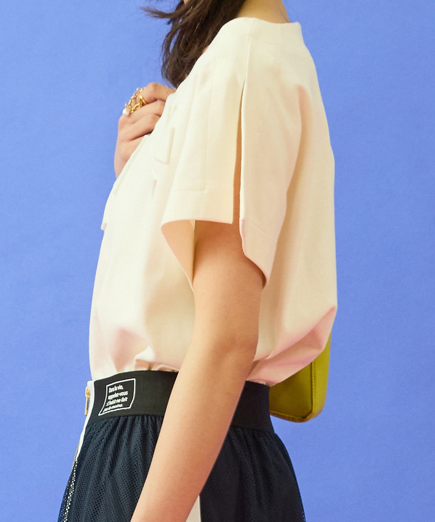 テーパードパンツやフレアスカートと合わせて、すっきりとしたきれいめスタイルに。