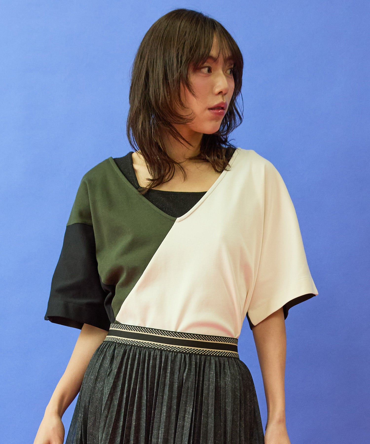 大胆なカラーブロックが目を引く、深VネックデザインのTシャツ。