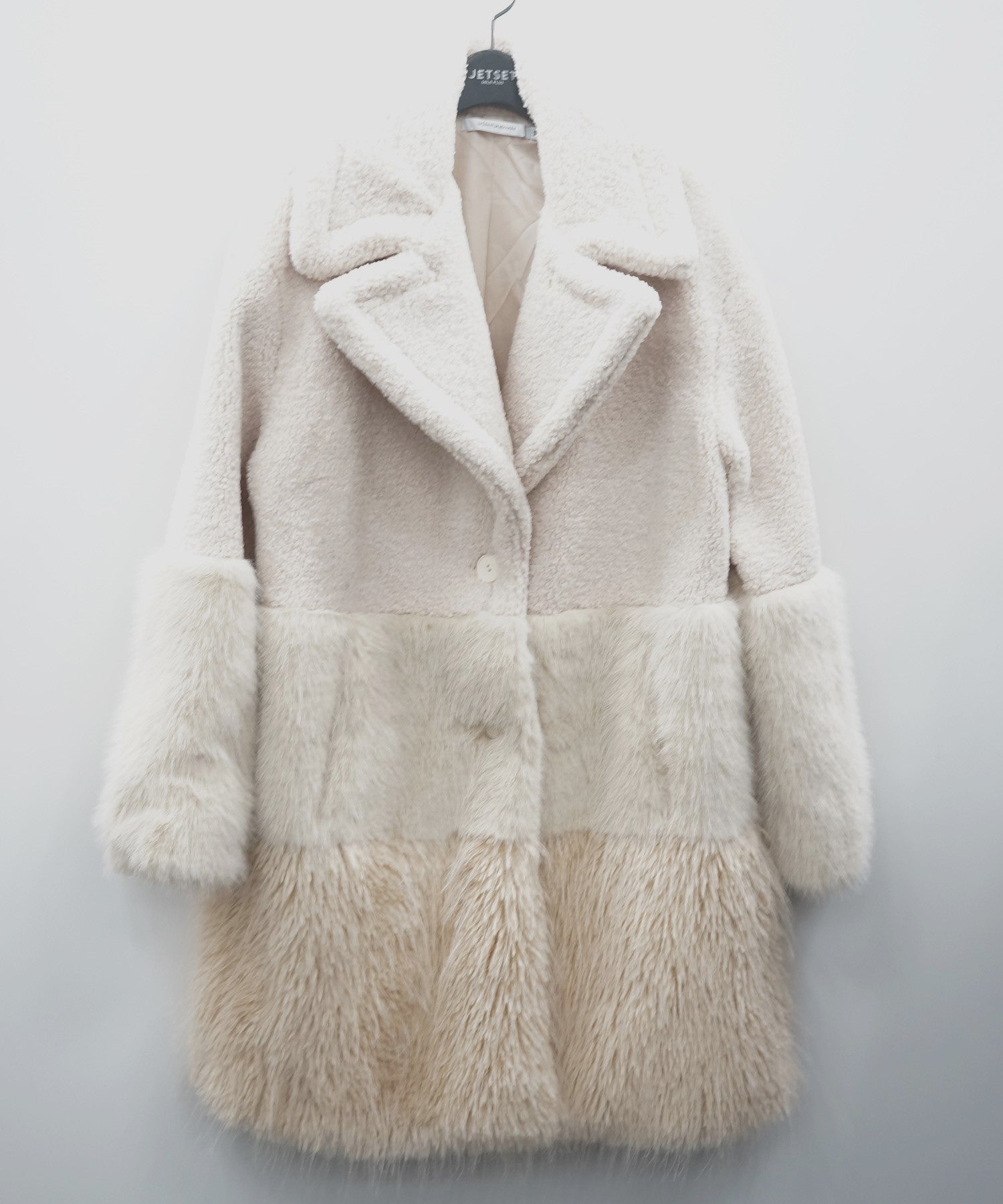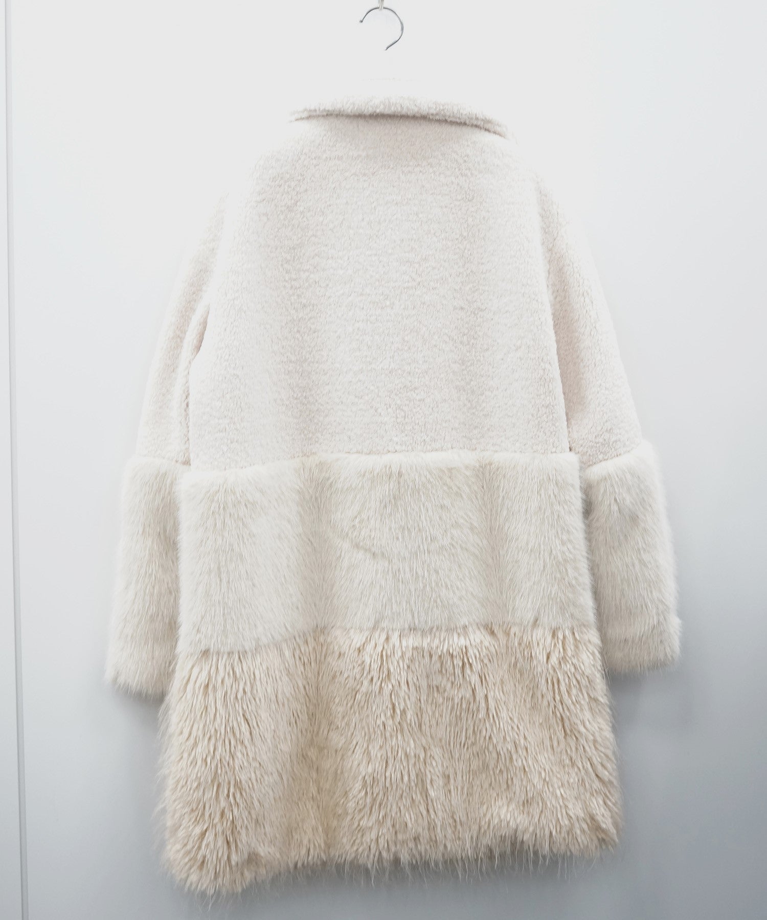 ふんわりとしたファーを切り替えにあしらった、存在感抜群のコート。