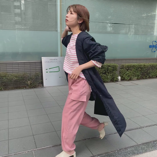 ナイロン100%(レース部分:ポリエステル100%)で、今年らしくワッシャー感のある質感です。シワも気になりづらく軽量のため、脱ぎ着・持ち運びがしやすいのがポイント。