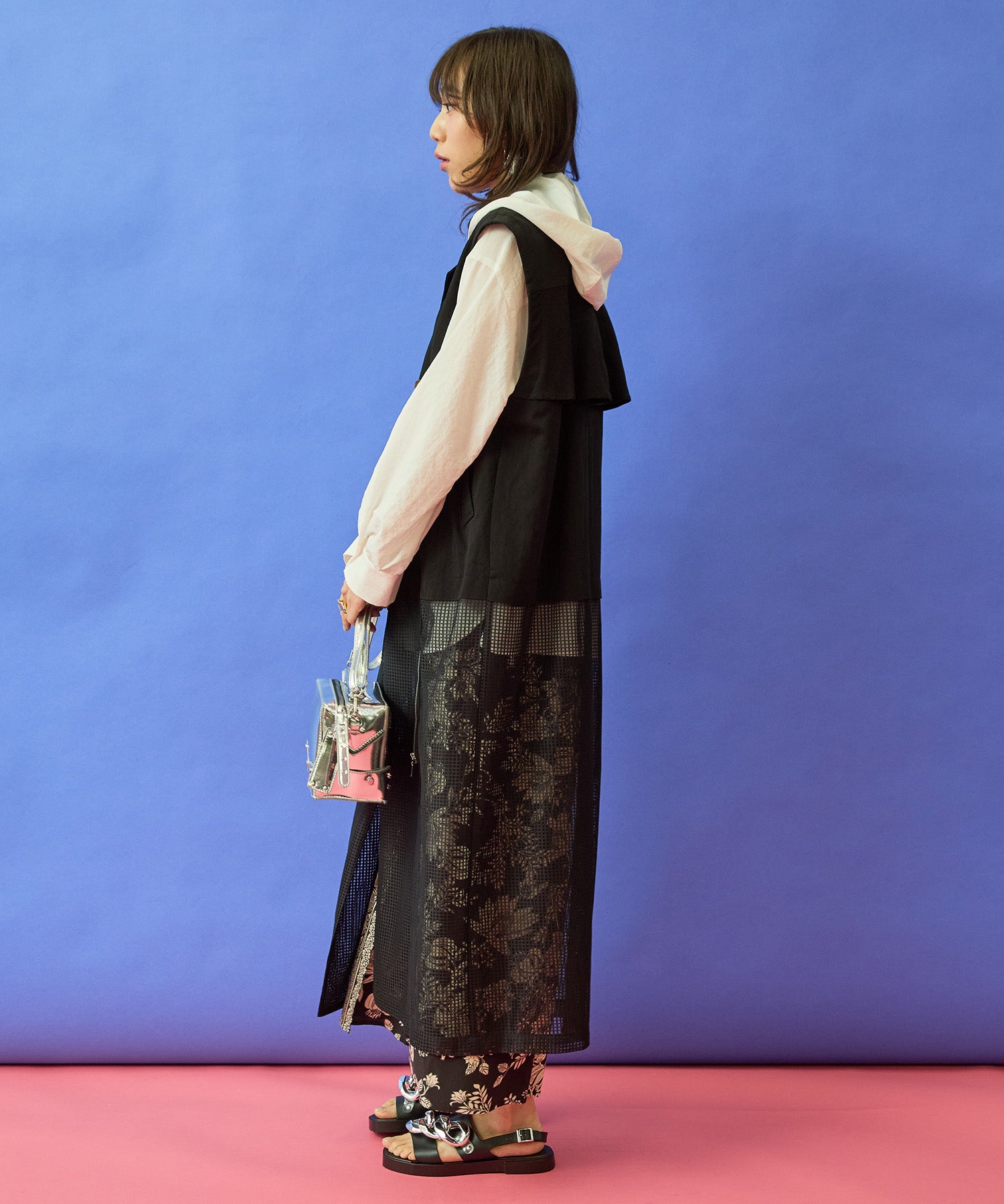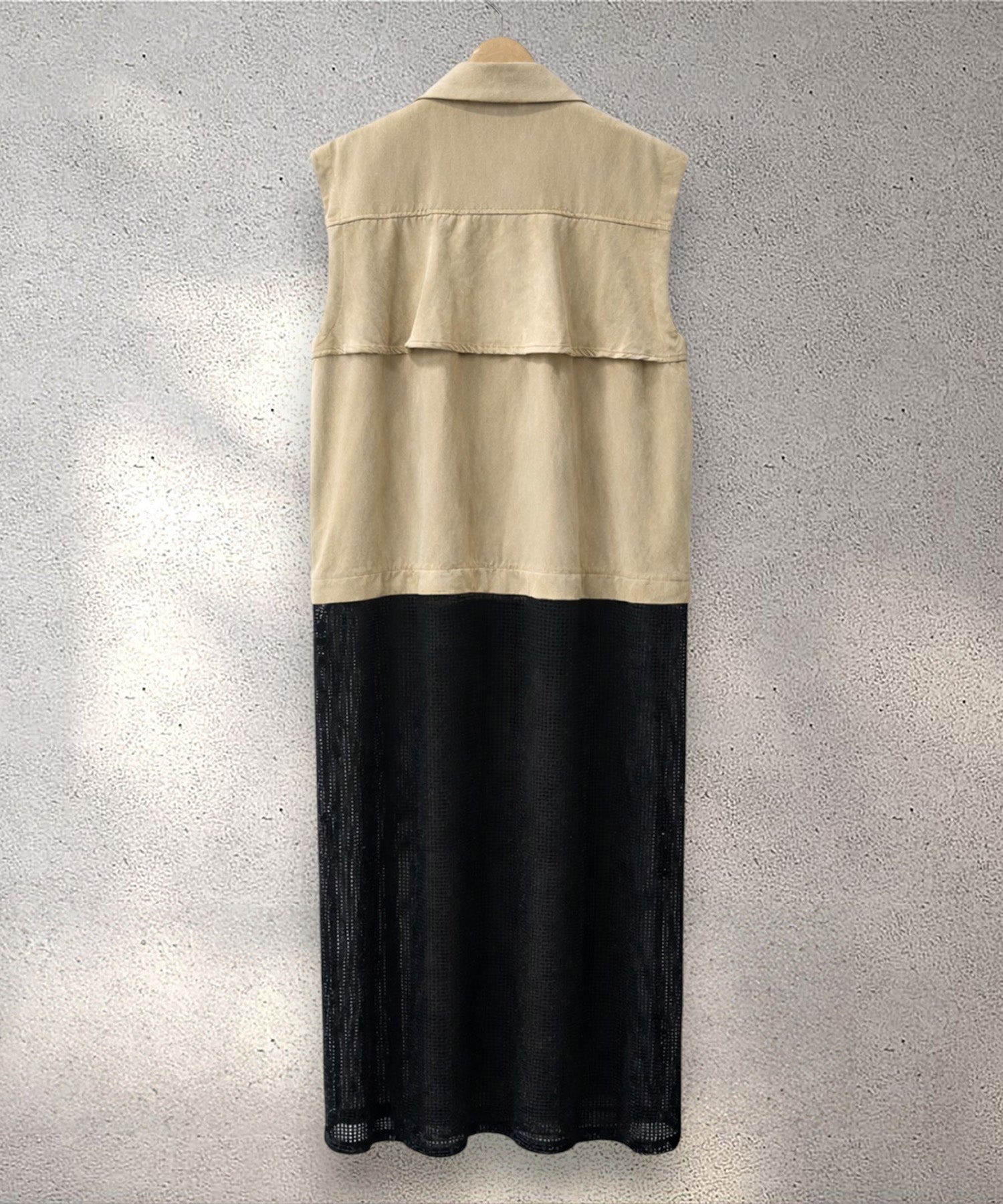 トレンチ風の端正なデザインに、メッシュ素材を組み合わせたコンビジレ。