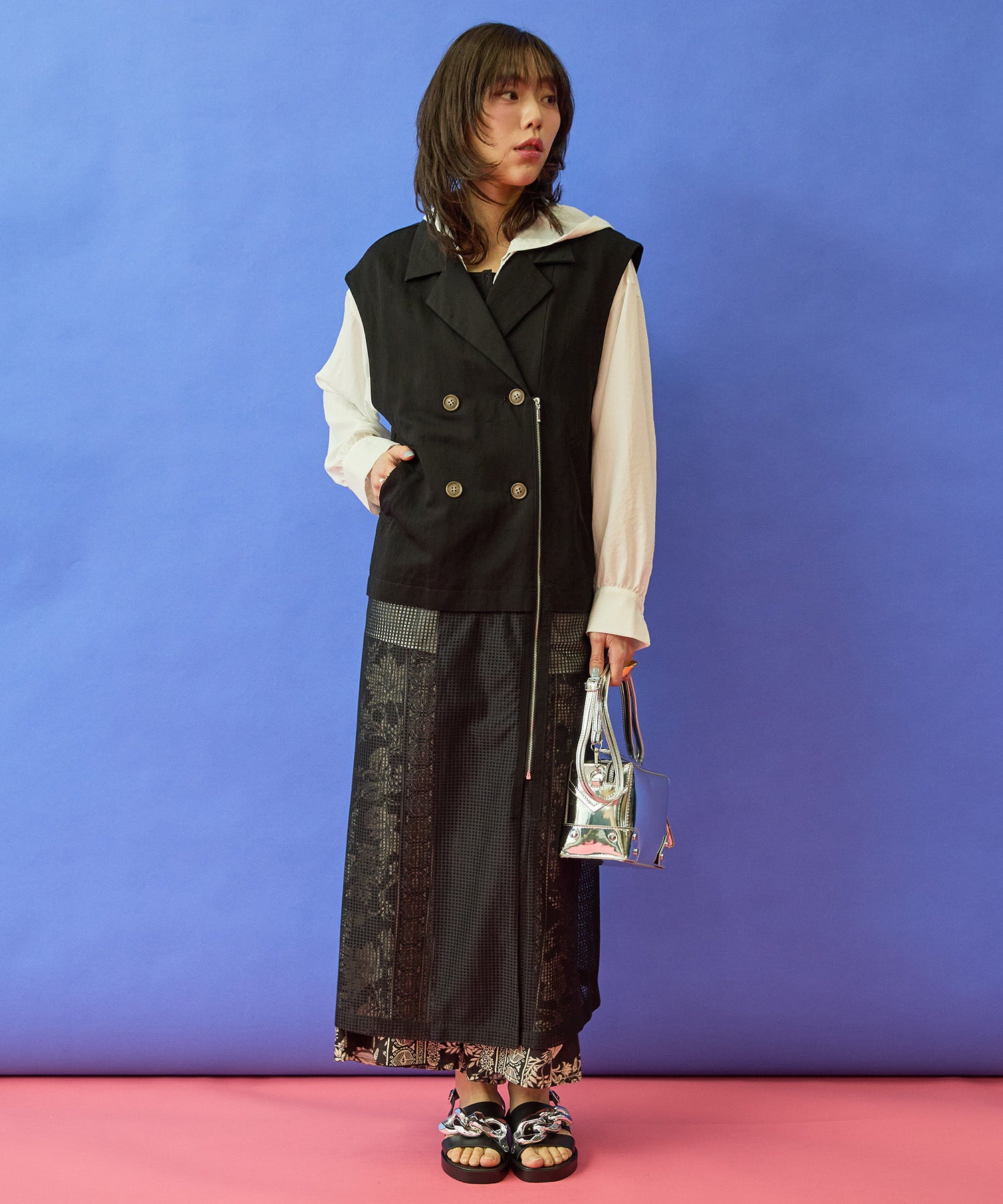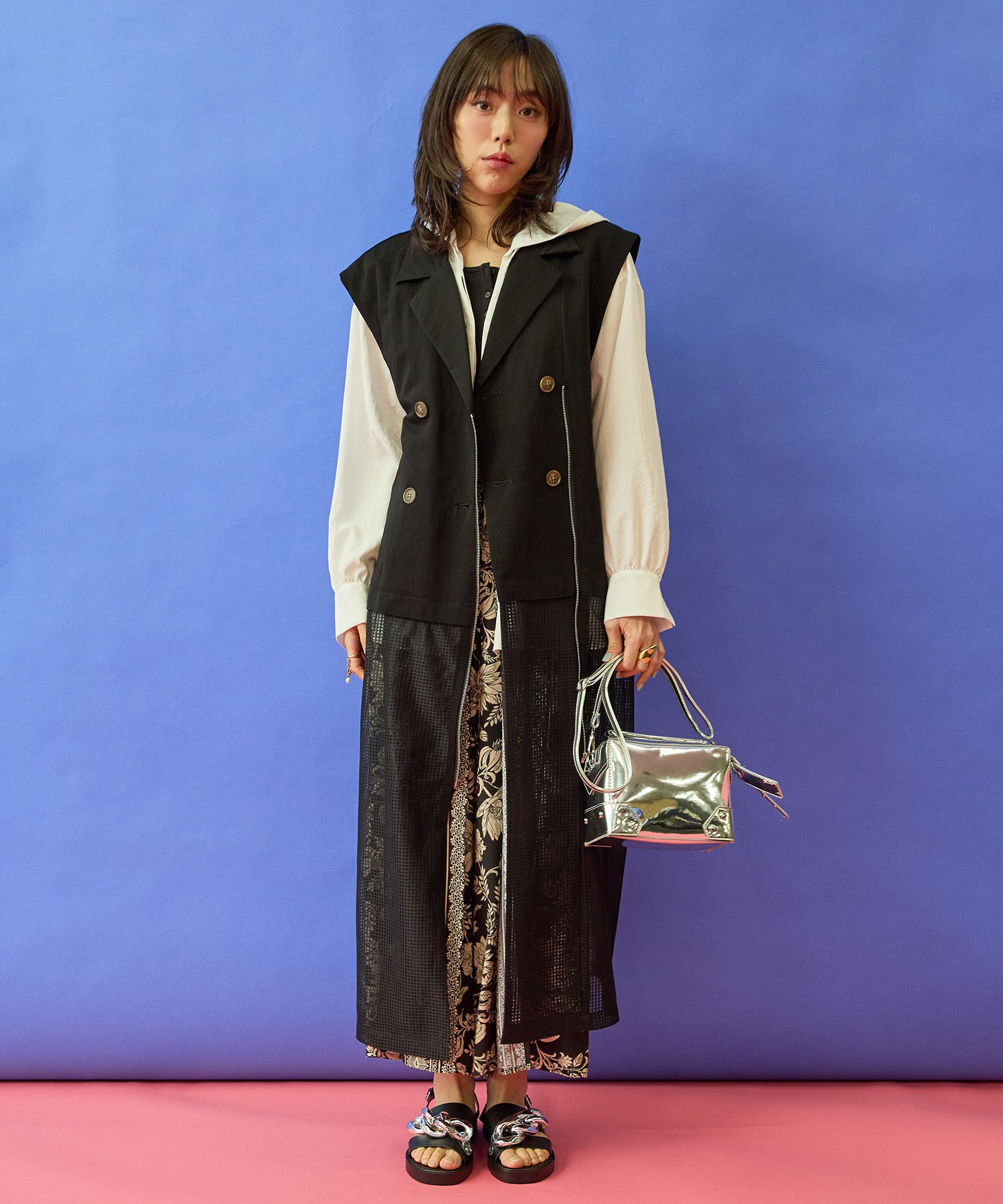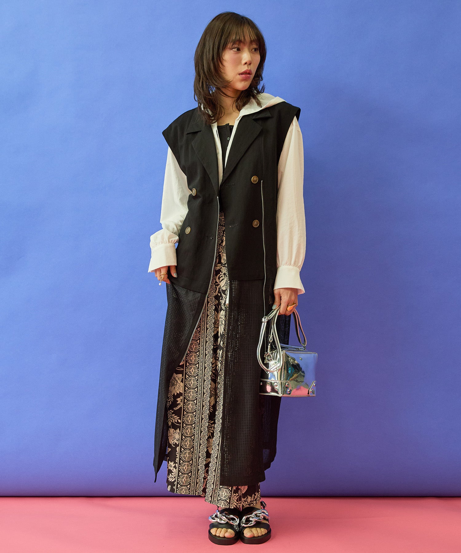 ワンピースの上に羽織れば、縦ラインが際立つ上品な着こなしに仕上がります。