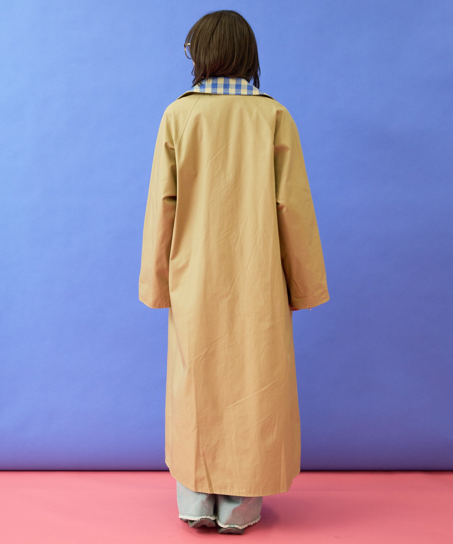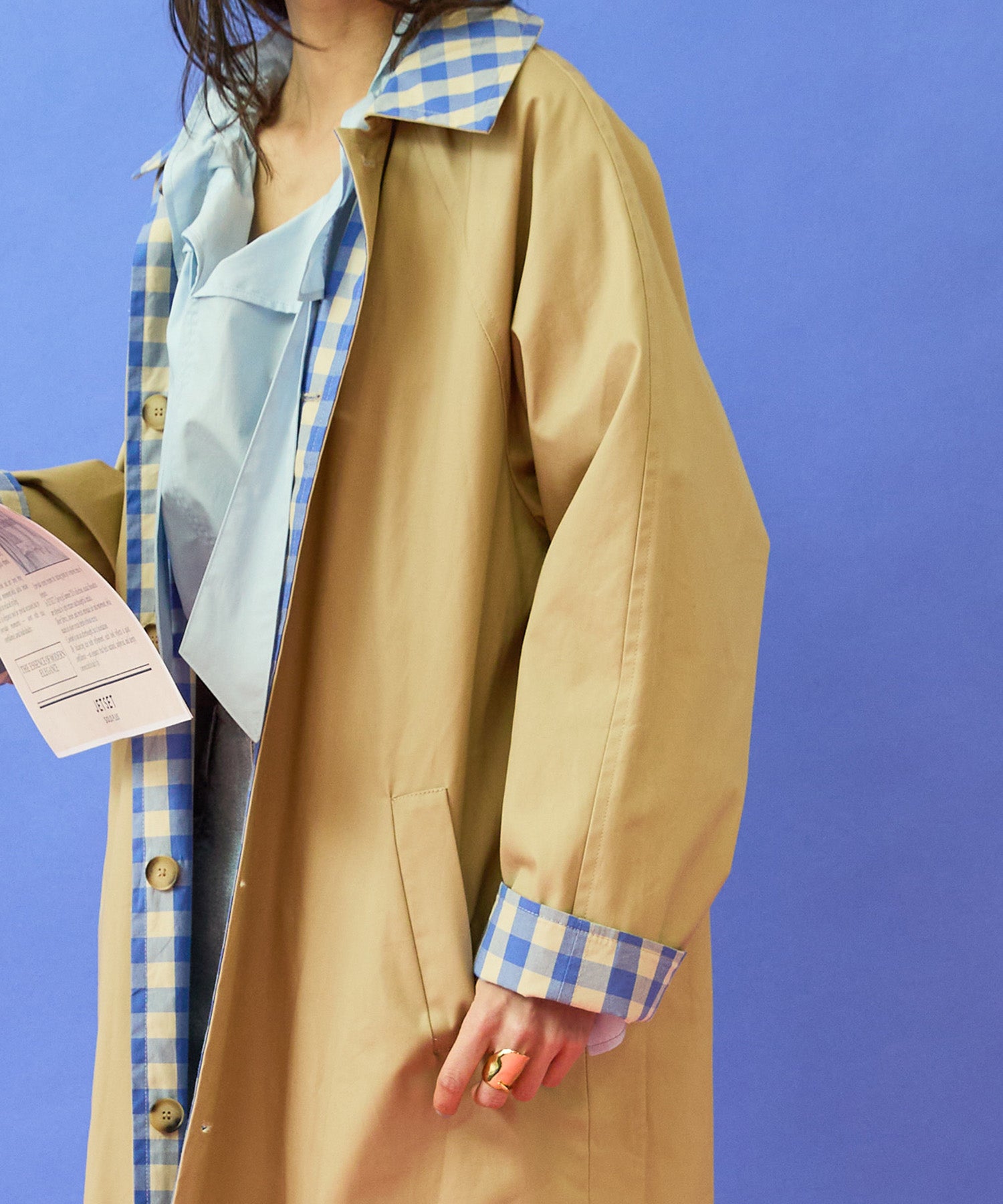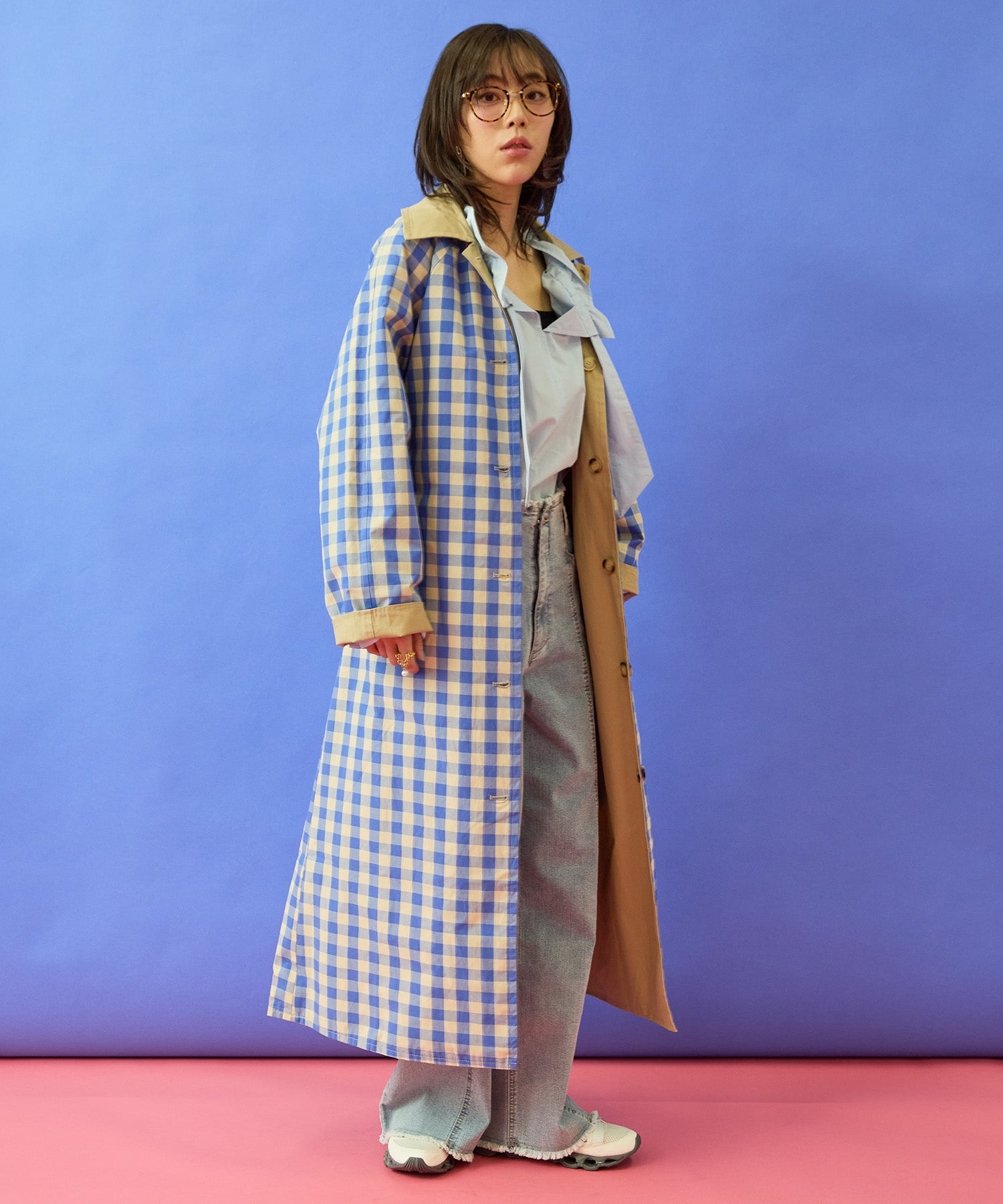 チェック柄と無地面、両面で異なる印象が楽しめるリバーシブル仕様のマキシコート。