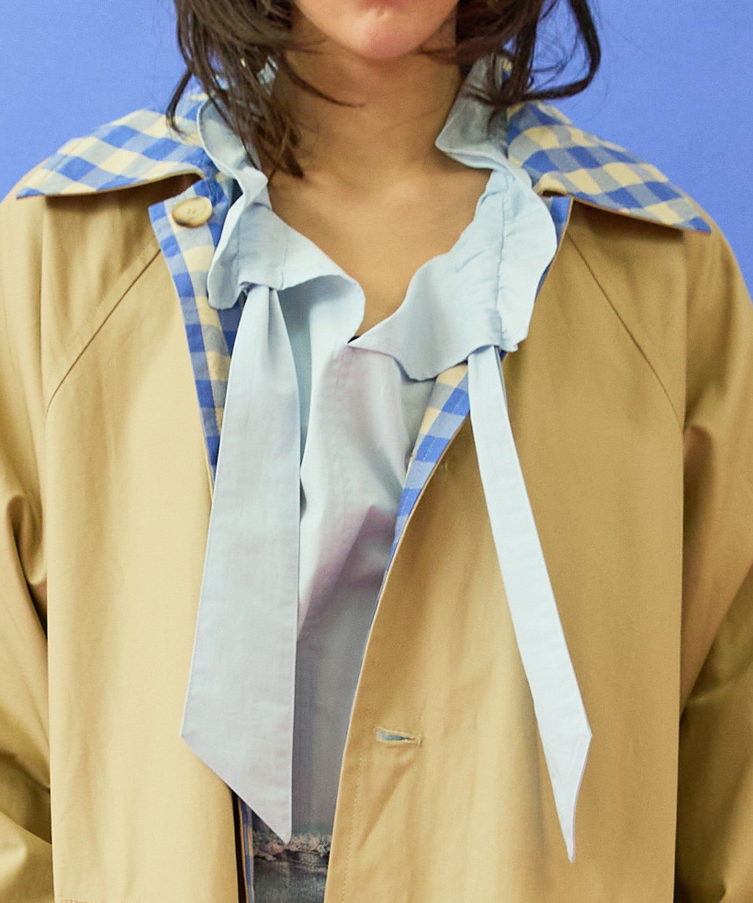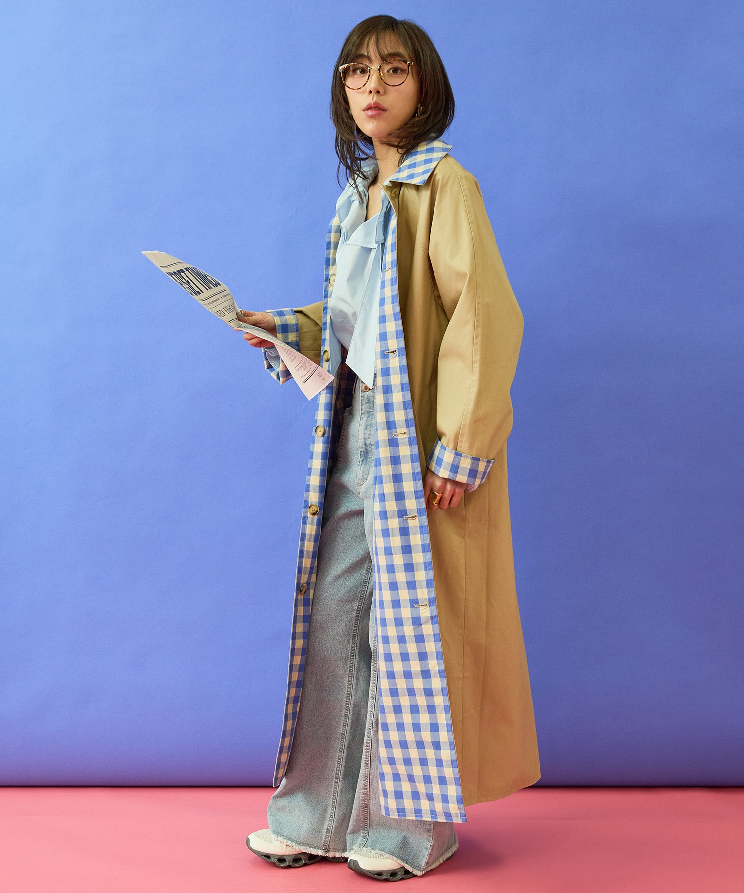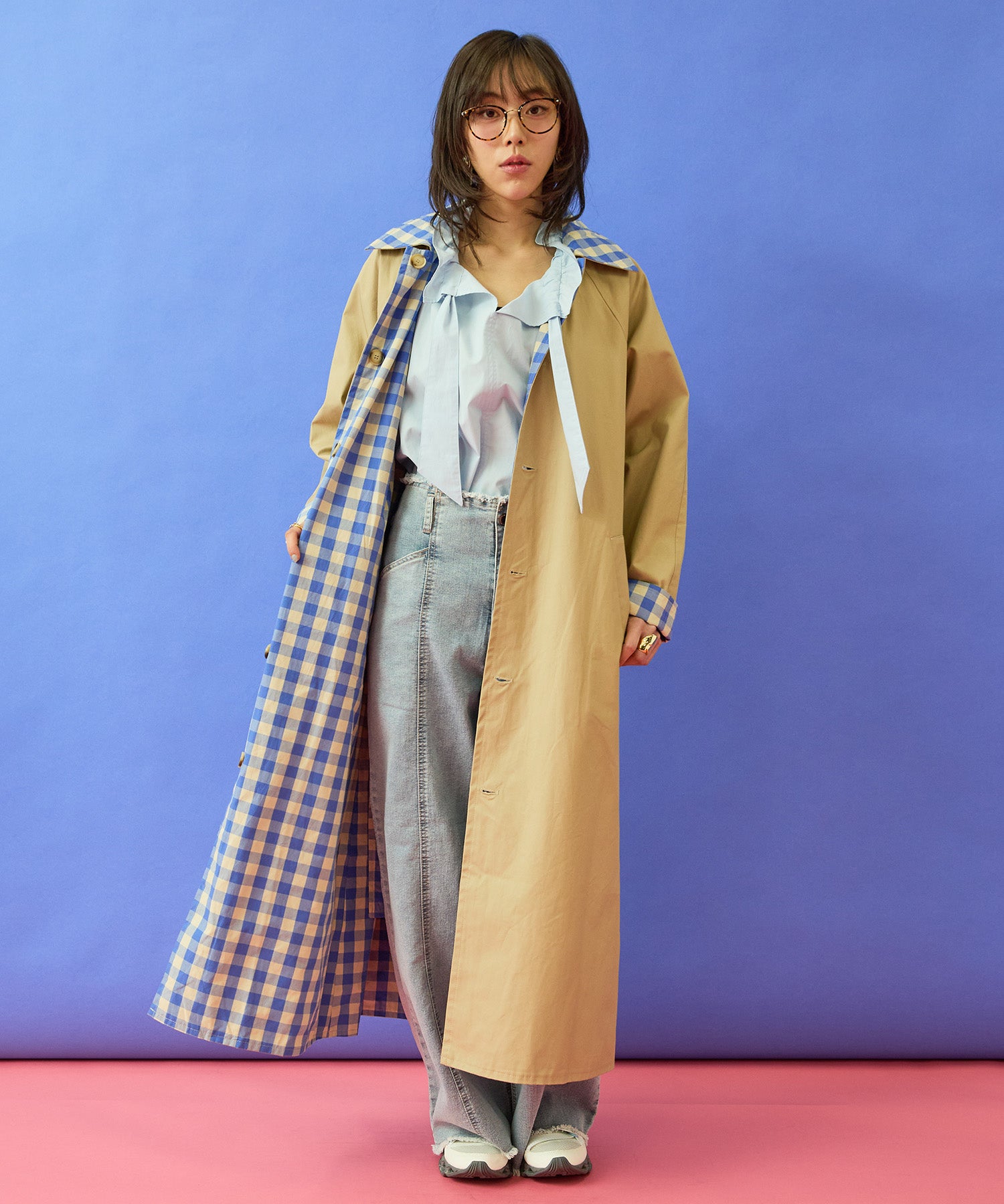 チェック柄と無地面、両面で異なる印象が楽しめるリバーシブル仕様のマキシコート。