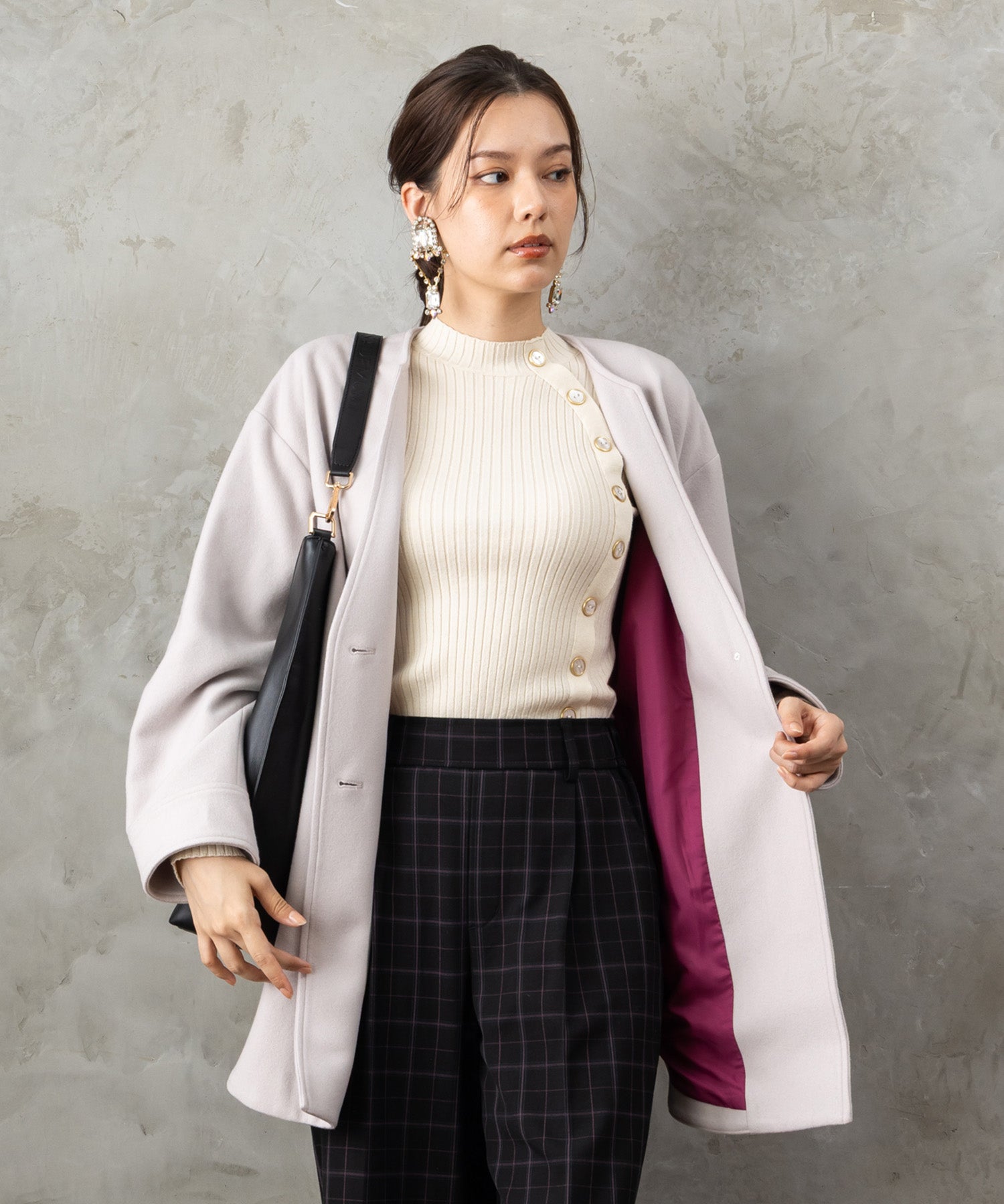 上質なSuper140×ロイヤルジーロンメルトンを使用したミドル丈コート。滑らかな手触りと軽やかな着心地が魅力で、キーネックデザインが洗練された大人の雰囲気を演出します。ジャケット感覚で羽織れるデザインは、オンからオフまで幅広く活躍。