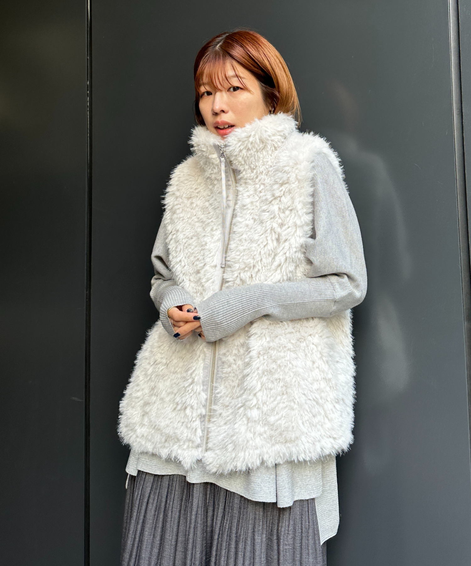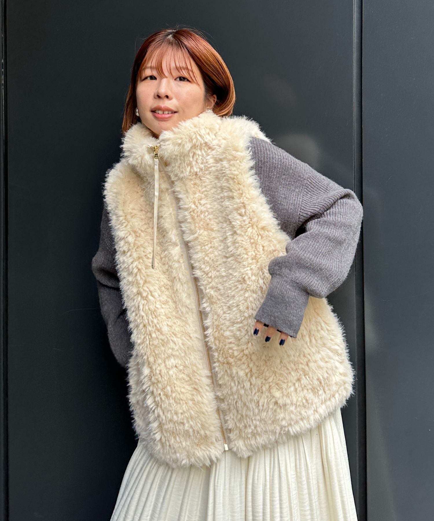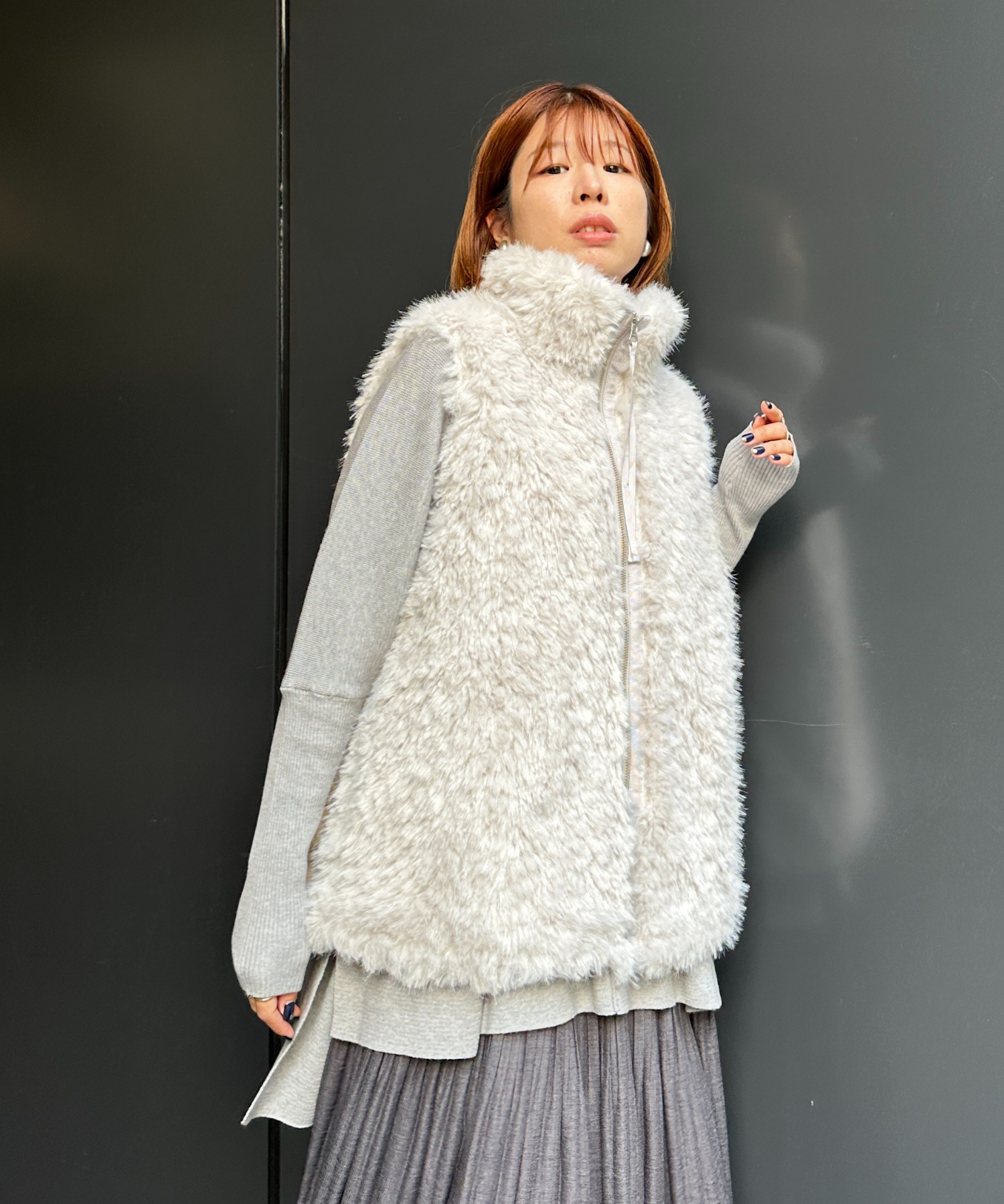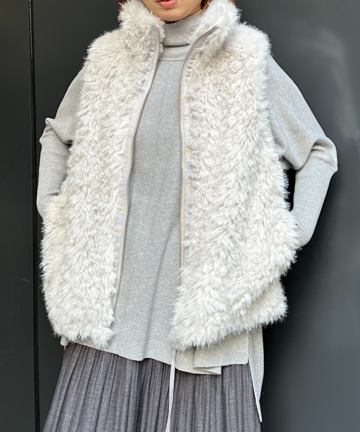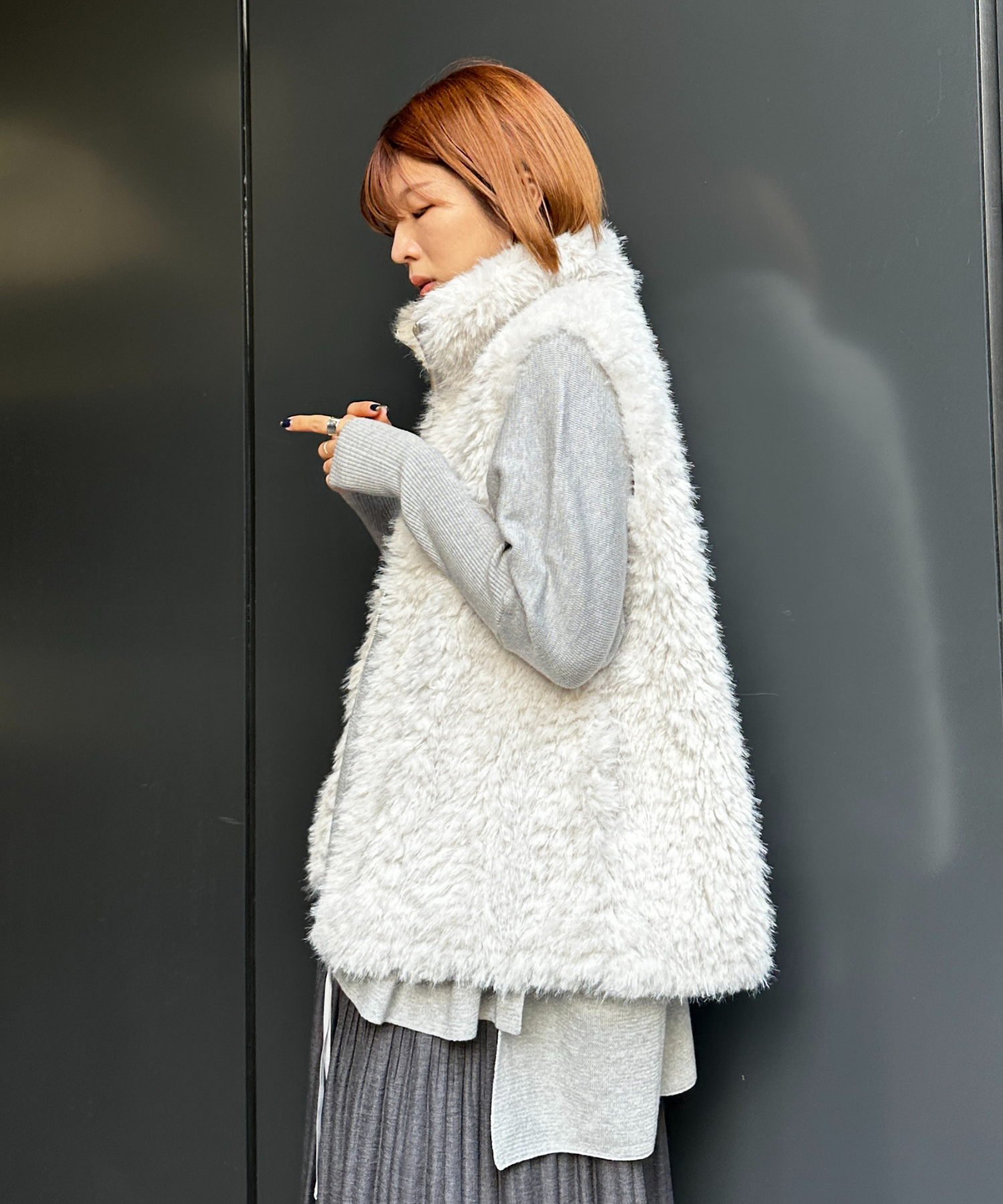 エアリーなフェイクファーが冬のスタイルにぴったりな秋冬ベスト。ハイネックデザインで、ジップを閉じて着れば簡単にこなれ見えが叶う、トレンドコーデの完成です。ふんわりとした空気感を演出しながら着膨れしにくいロングミックスファーを採用しています。またジップ部分に施した長めの光沢テープリボンがアクセントになっています。