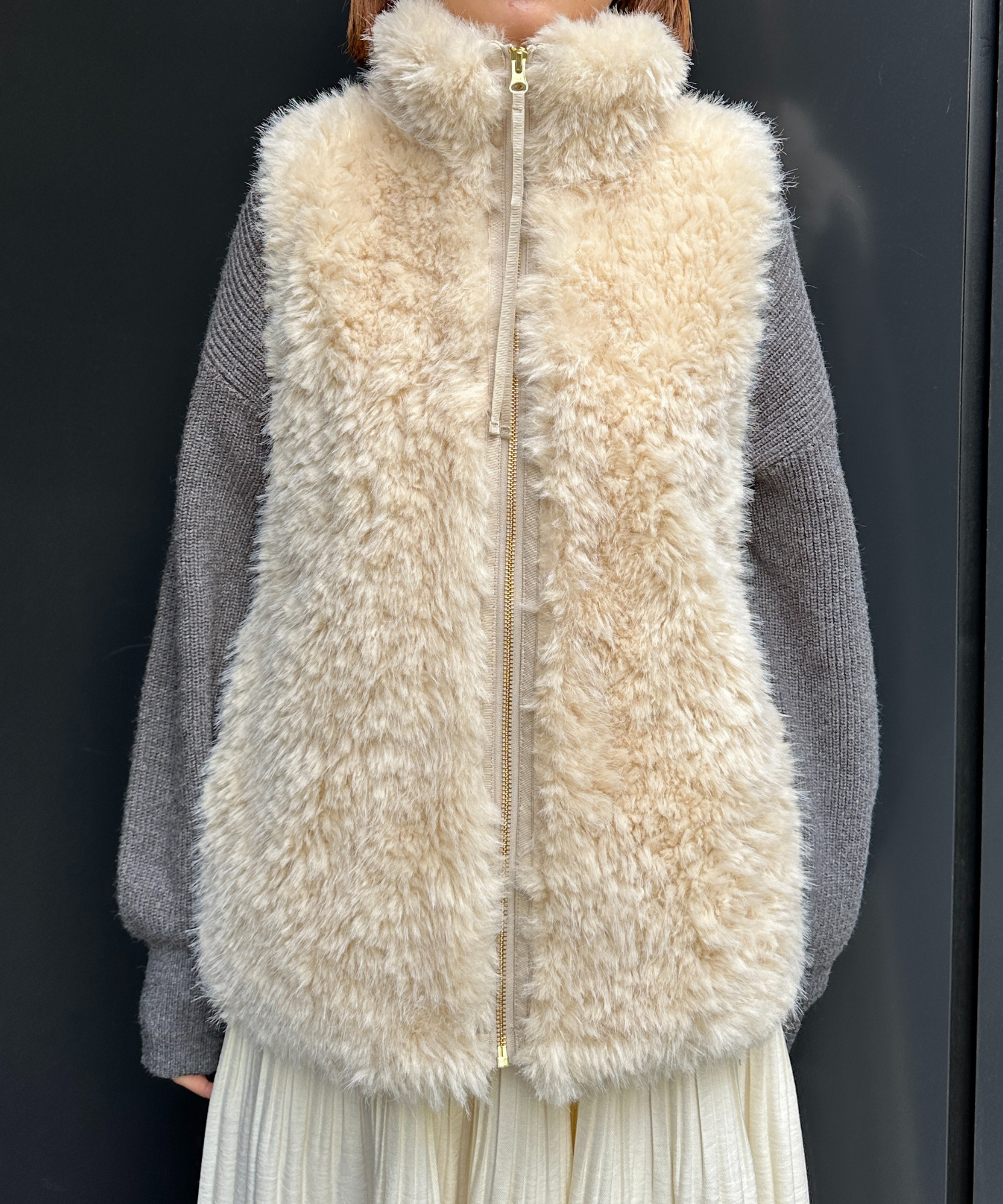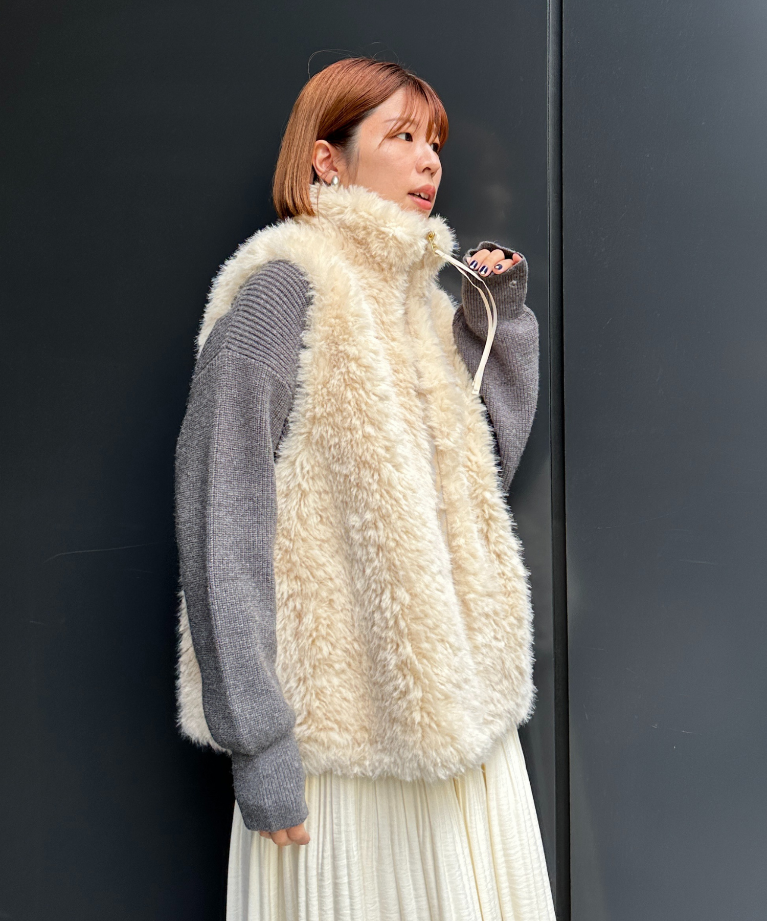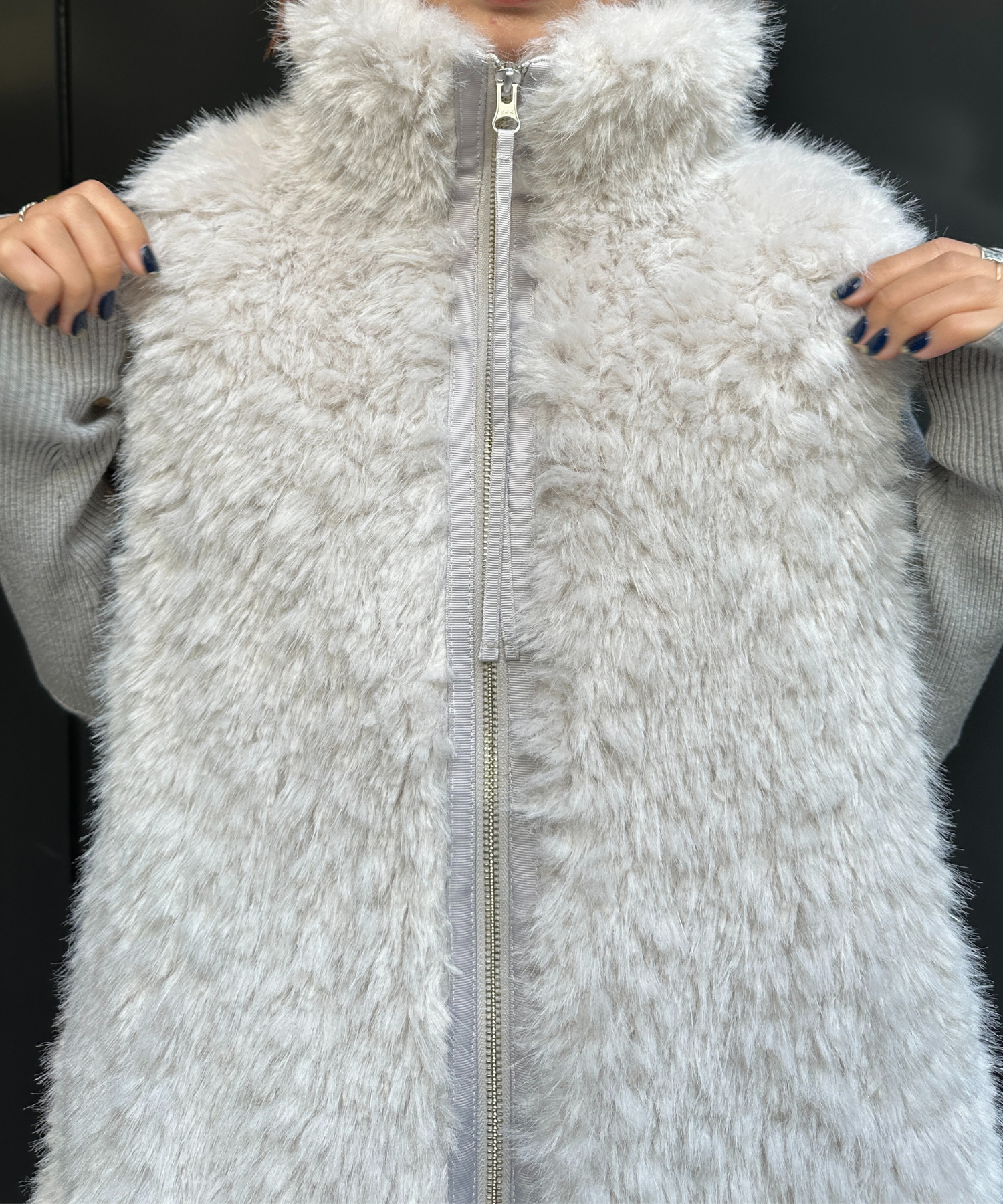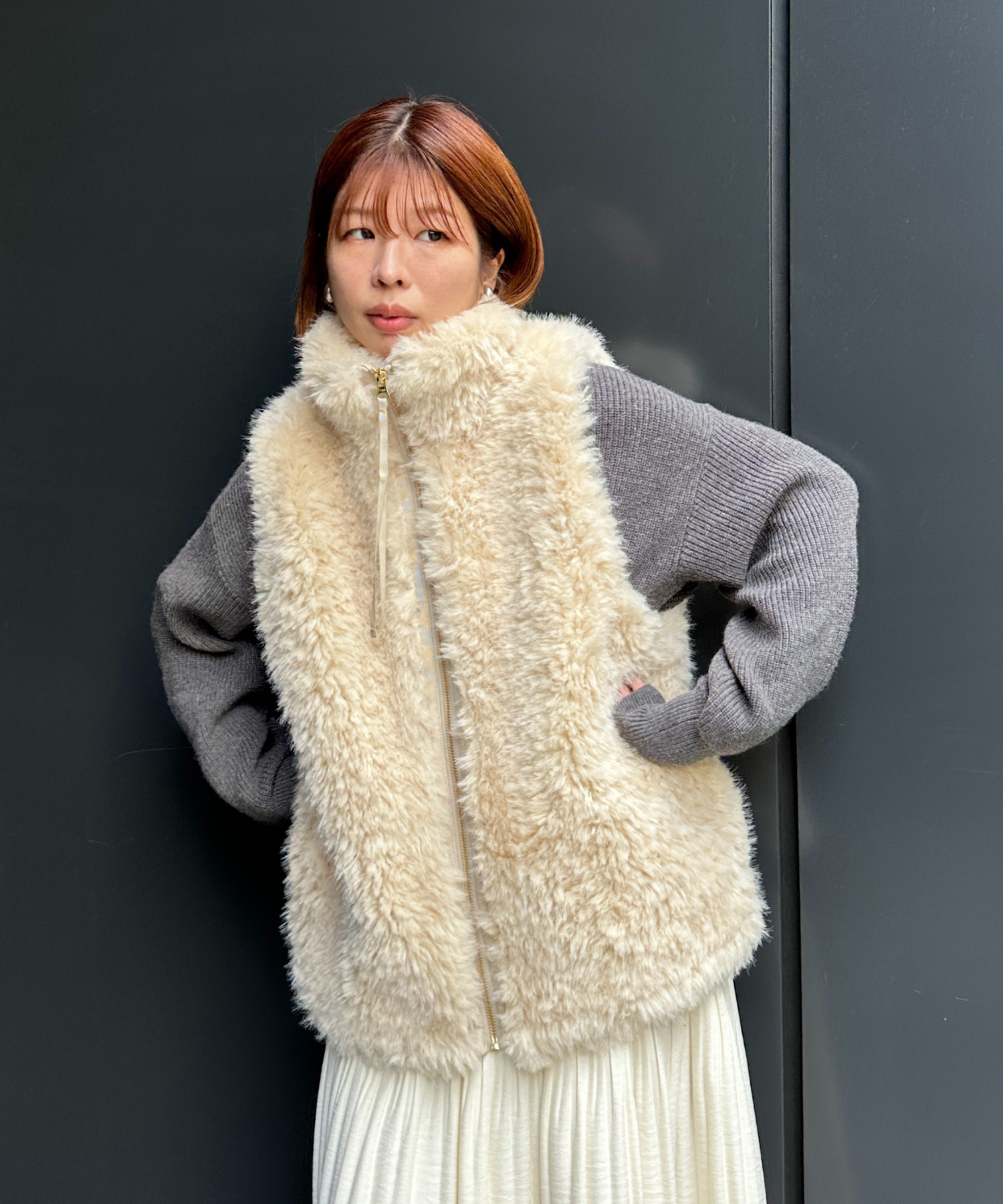 エアリーなフェイクファーが冬のスタイルにぴったりな秋冬ベスト。ハイネックデザインで、ジップを閉じて着れば簡単にこなれ見えが叶う、トレンドコーデの完成です。ふんわりとした空気感を演出しながら着膨れしにくいロングミックスファーを採用しています。またジップ部分に施した長めの光沢テープリボンがアクセントになっています。