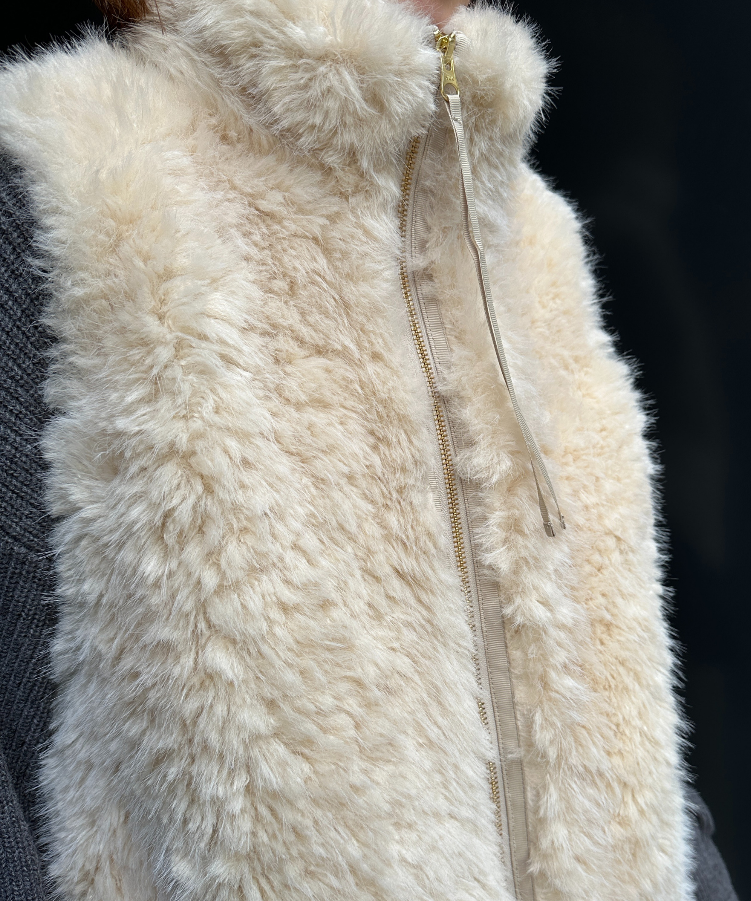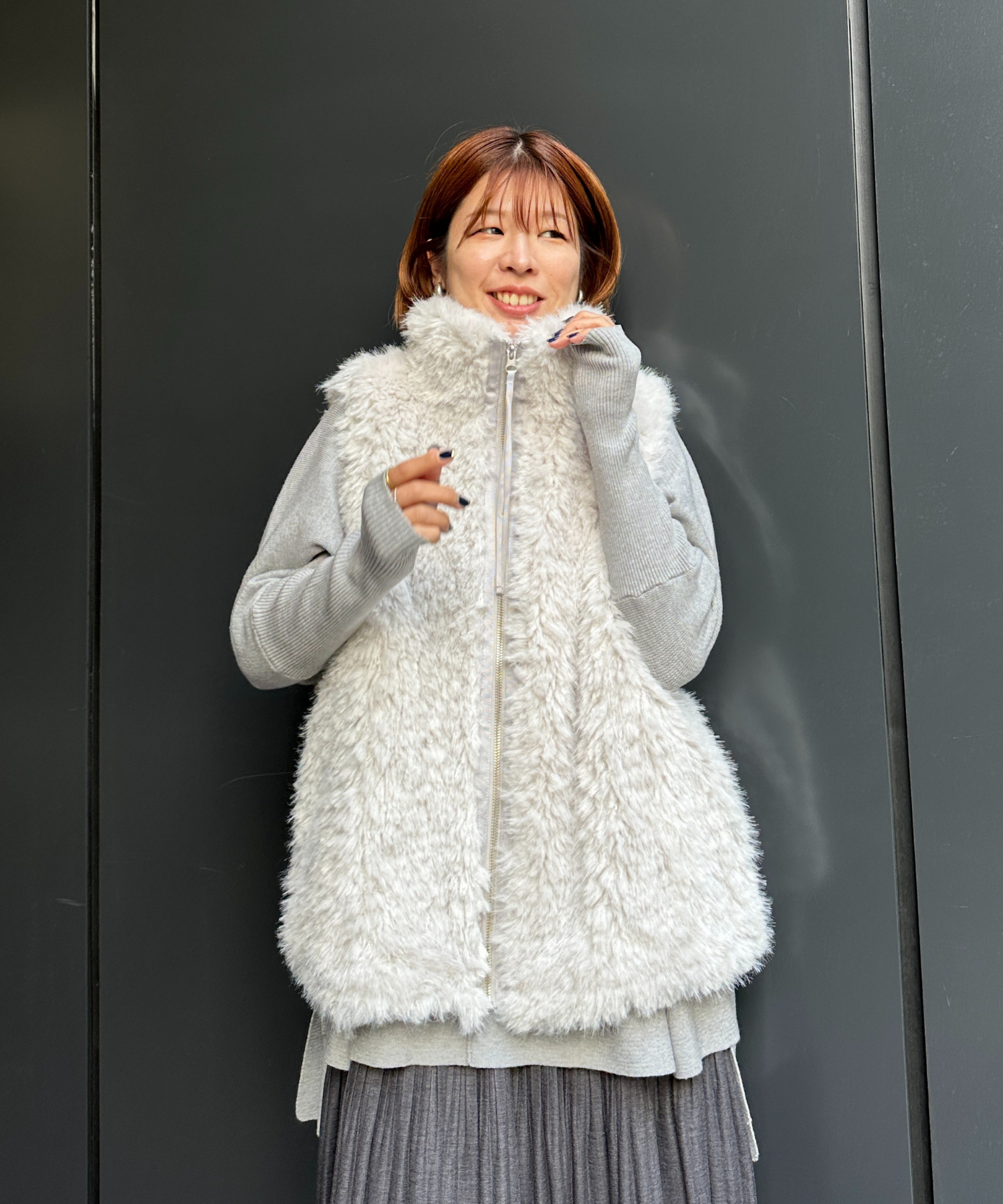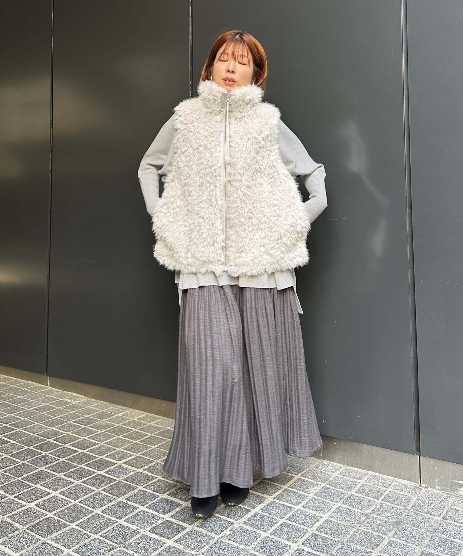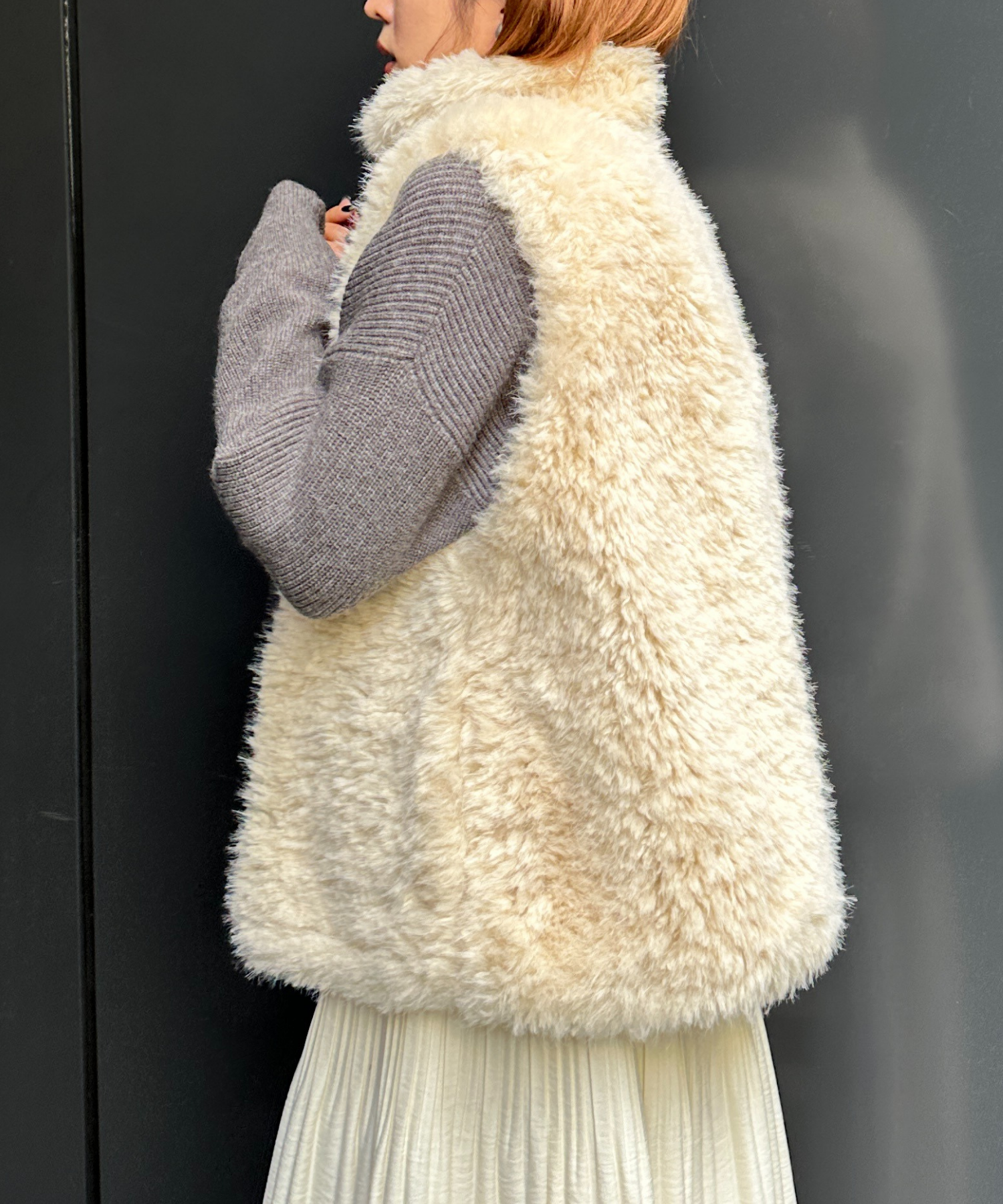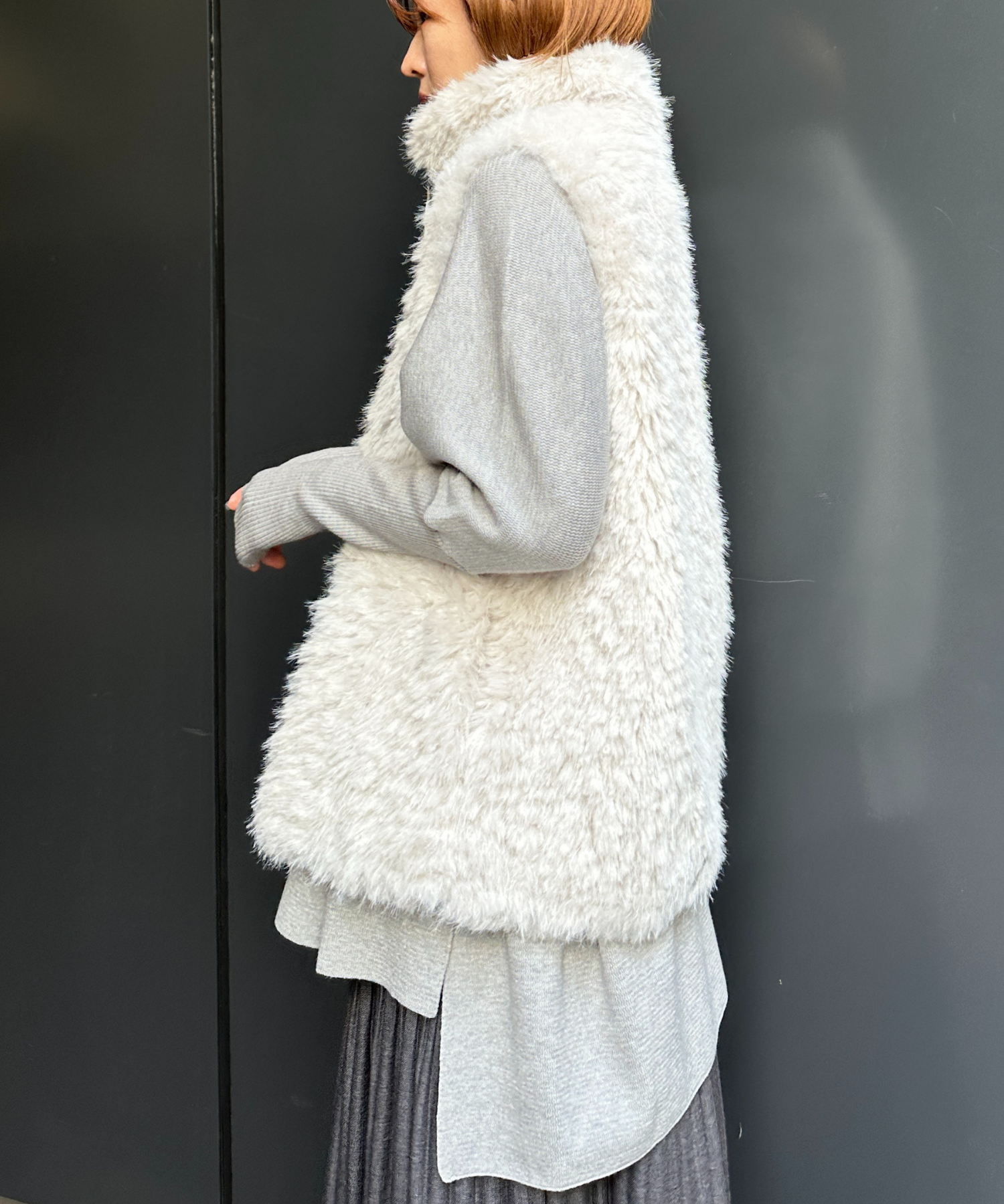 エアリーなフェイクファーが冬のスタイルにぴったりな秋冬ベスト。ハイネックデザインで、ジップを閉じて着れば簡単にこなれ見えが叶う、トレンドコーデの完成です。ふんわりとした空気感を演出しながら着膨れしにくいロングミックスファーを採用しています。またジップ部分に施した長めの光沢テープリボンがアクセントになっています。