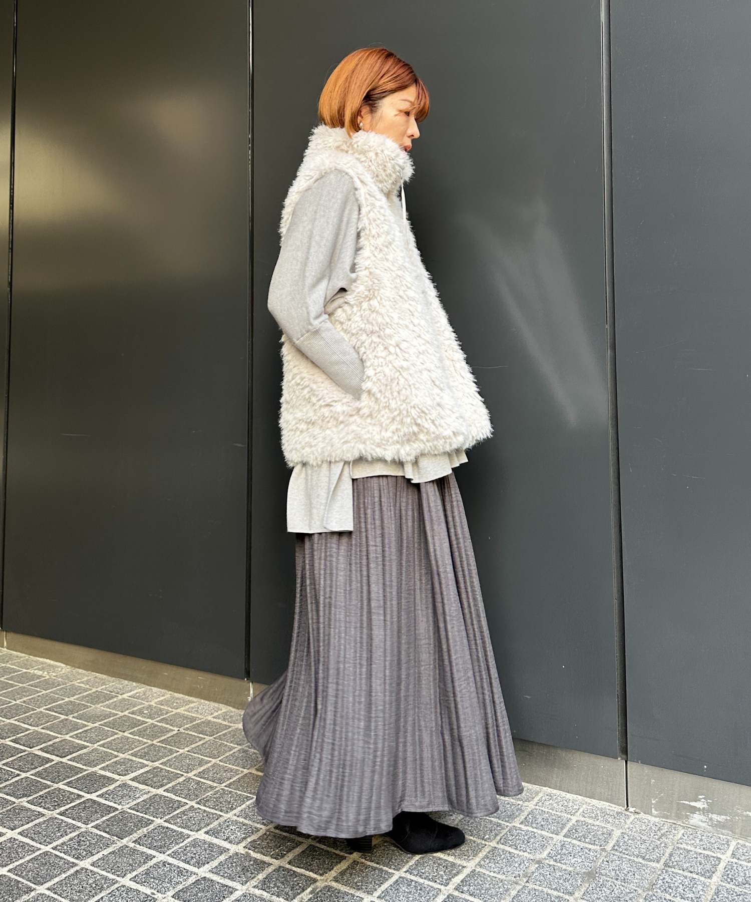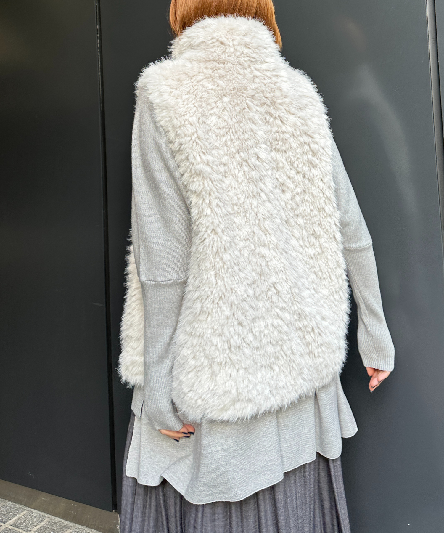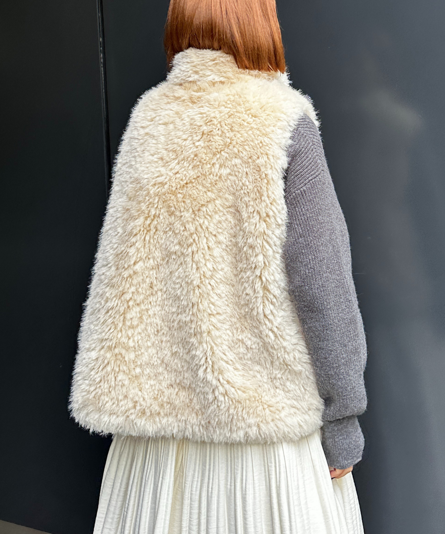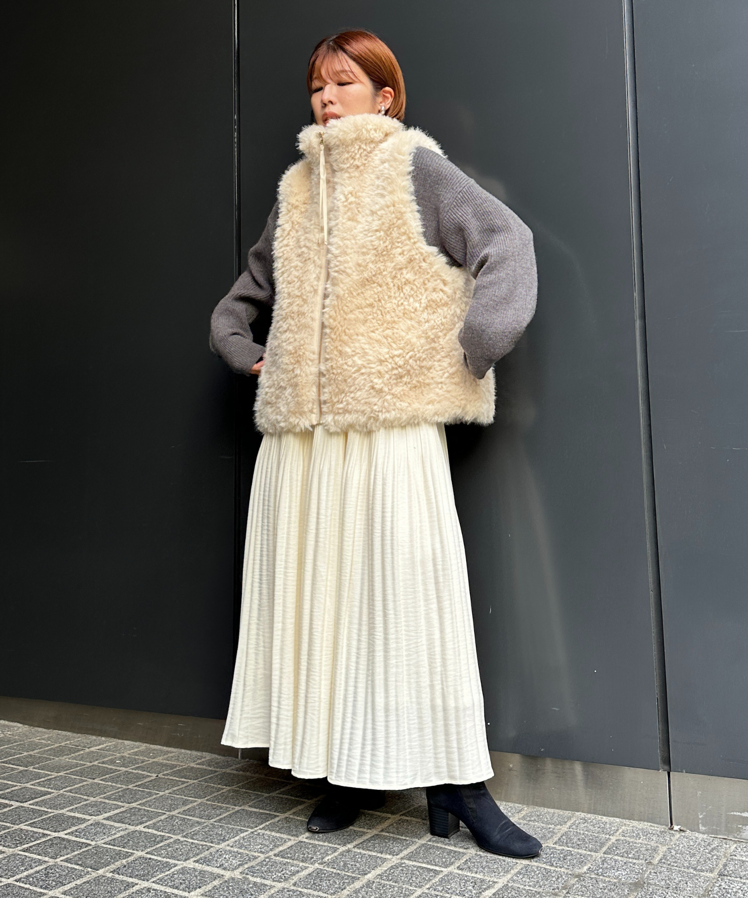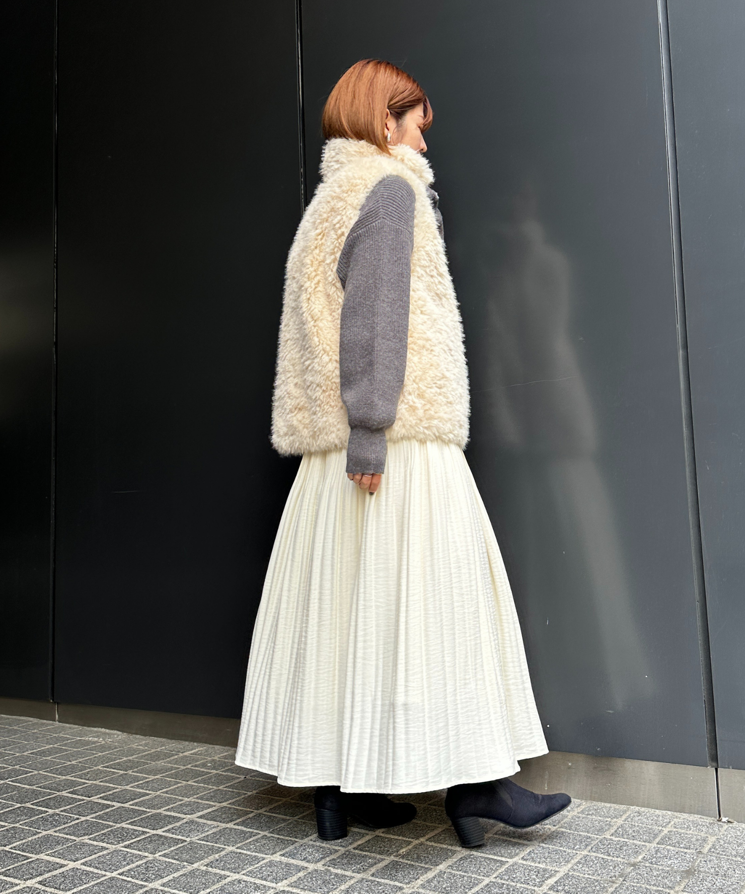 エアリーなフェイクファーが冬のスタイルにぴったりな秋冬ベスト。ハイネックデザインで、ジップを閉じて着れば簡単にこなれ見えが叶う、トレンドコーデの完成です。ふんわりとした空気感を演出しながら着膨れしにくいロングミックスファーを採用しています。またジップ部分に施した長めの光沢テープリボンがアクセントになっています。