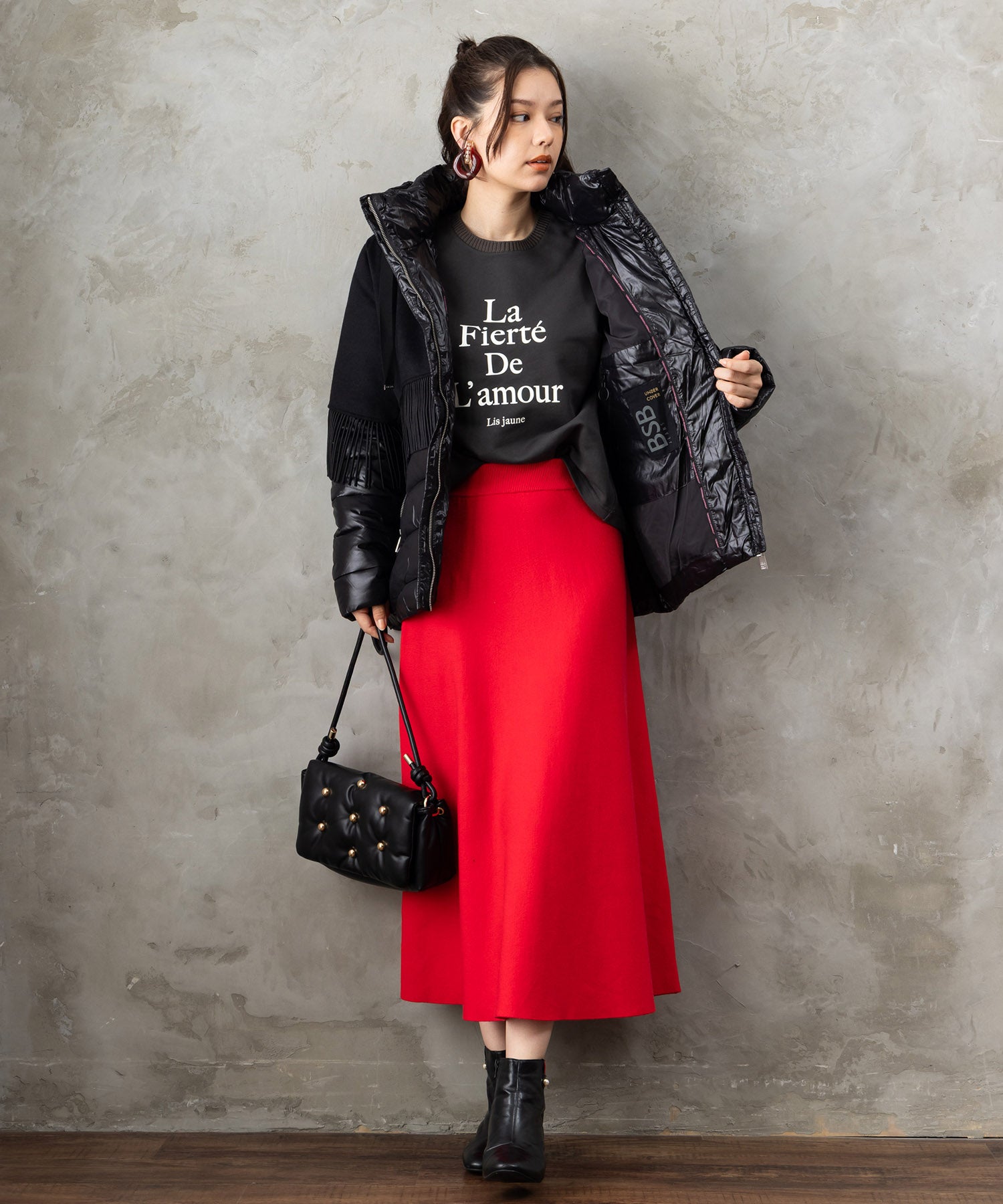 ワイドパンツやロングスカートと合わせても、バランス良く決まります。