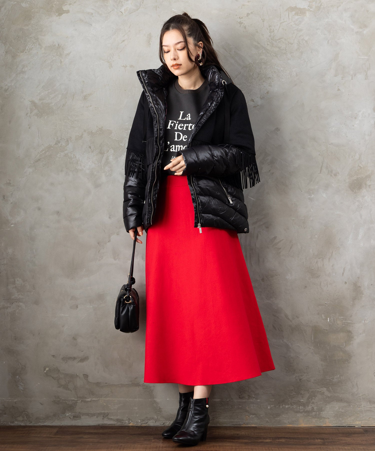 カジュアルな中綿コートにモードなアクセントをプラスし、大人らしい存在感を演出します。