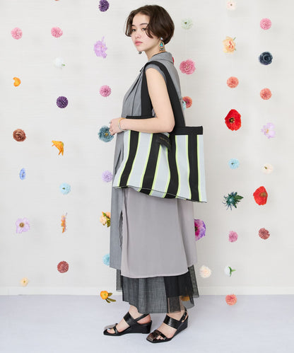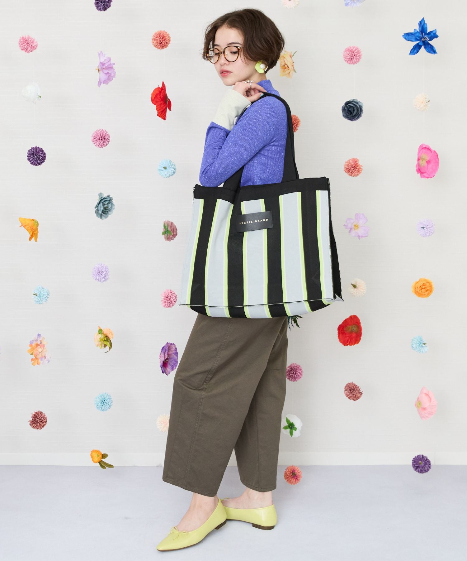 カラフルなマルチストライプ柄が目を惹く、大容量のニットバッグ。
