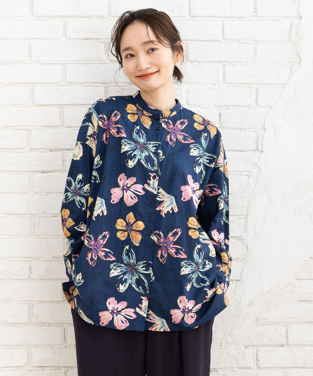 フラワープリントがカラフルなホワイトとネイビー、落ち着いた印象のグリーンの3色展開です。