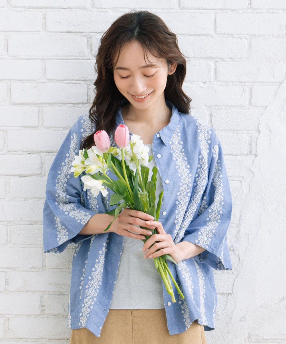 カジュアルなのに華やかなエンブロイダリーレースデニムシャツ。