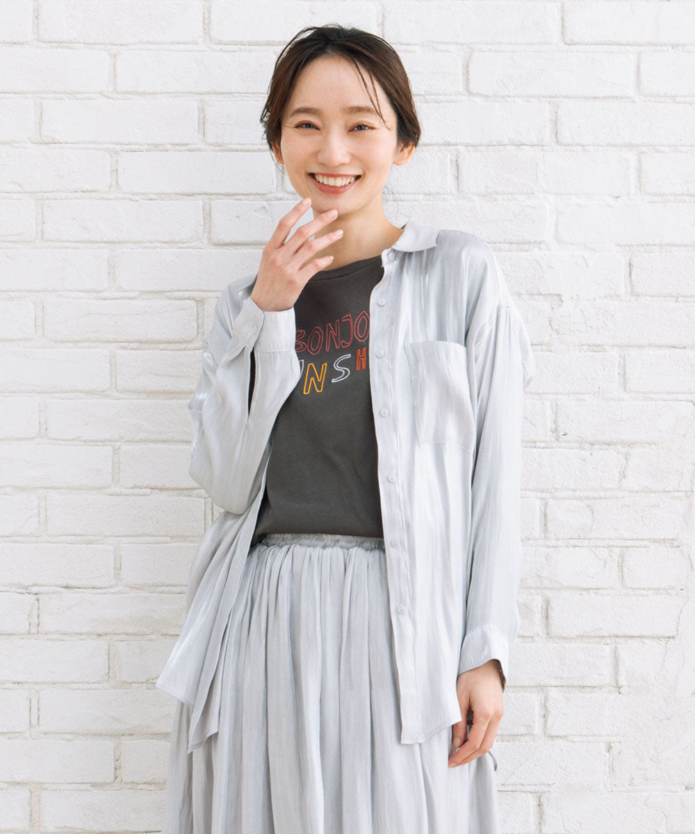 上品な光沢を放つシャイニーサテン素材に、ワッシャー加工でニュアンスを加えたブラウス。
