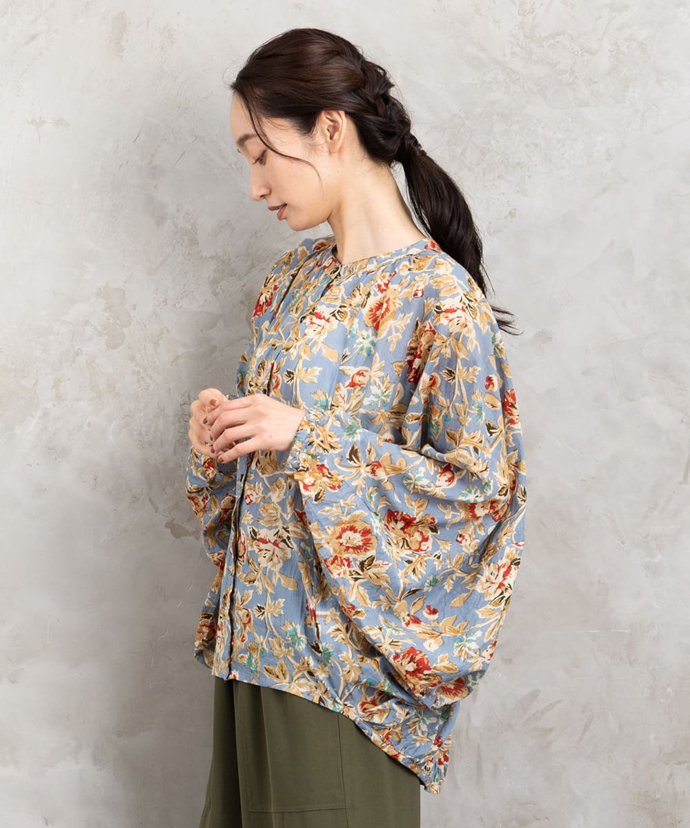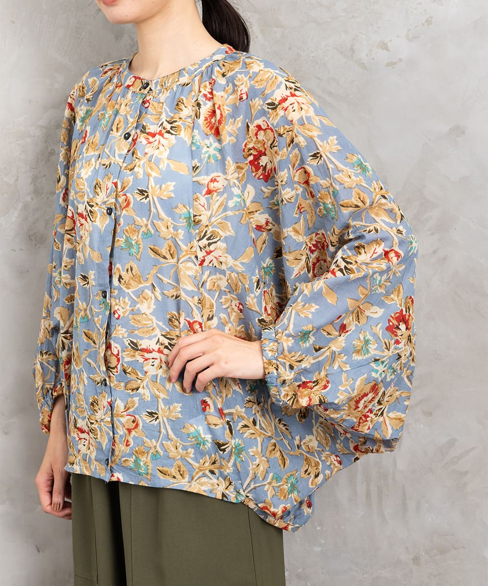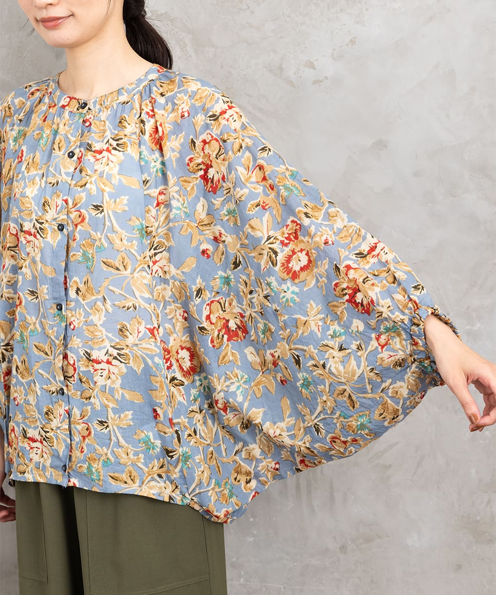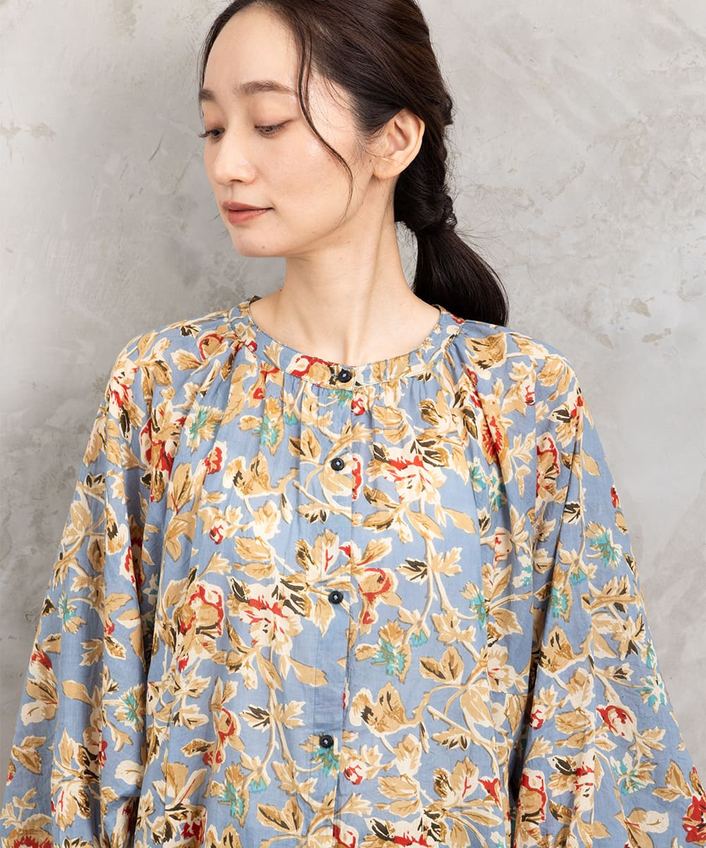 ・デザインポイント:クラシカルなフラワープリント、ギャザー入りネック、袖口タック