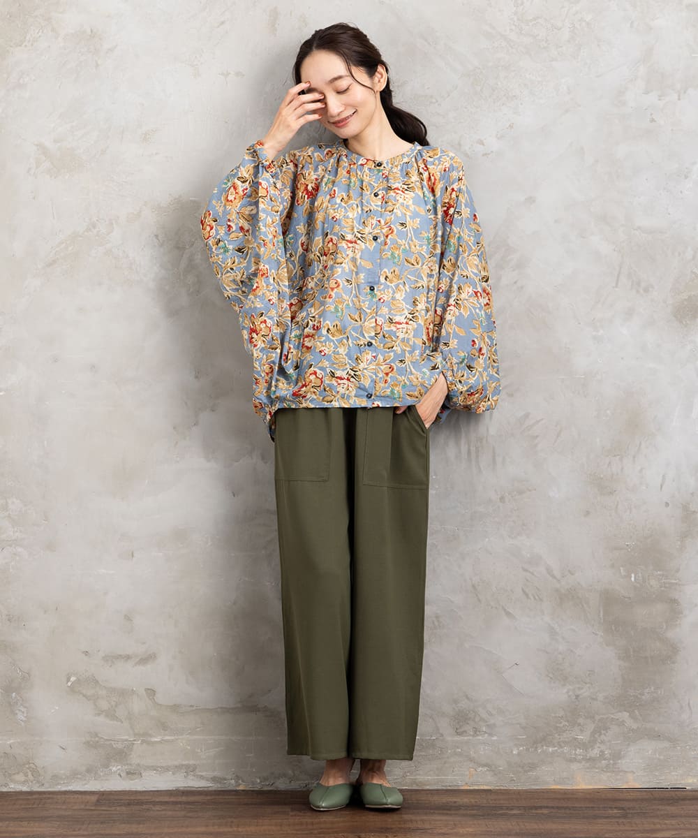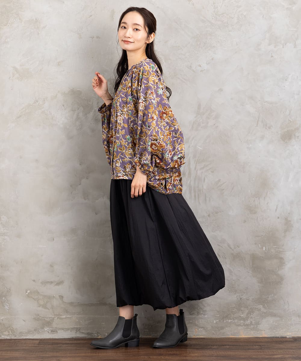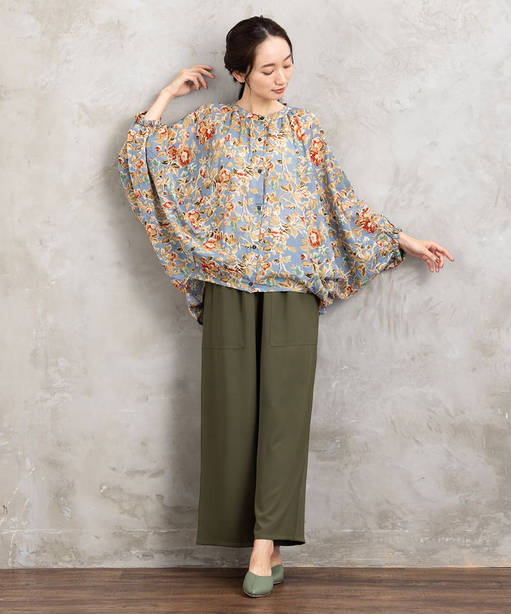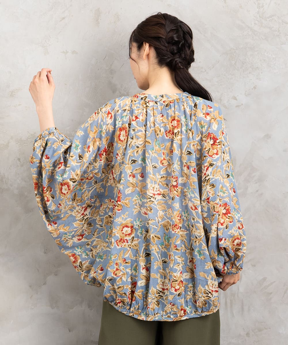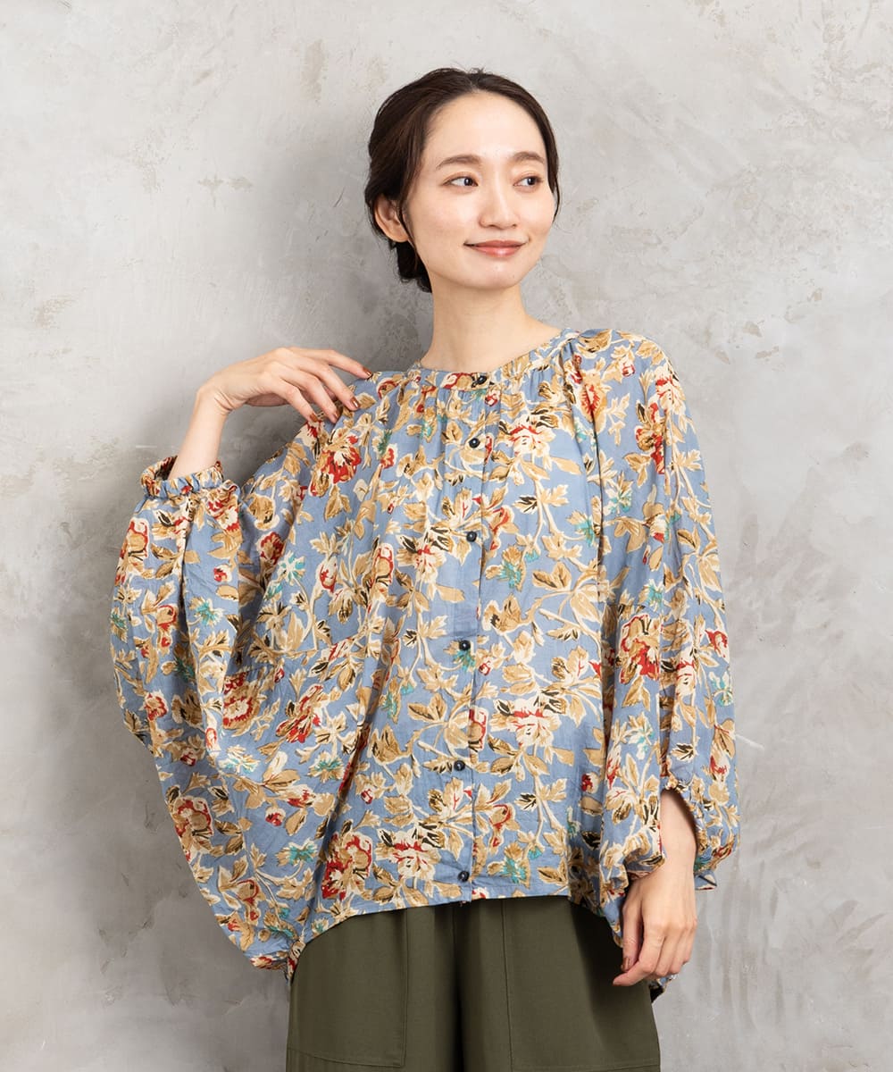 ・デザインポイント:クラシカルなフラワープリント、ギャザー入りネック、袖口タック