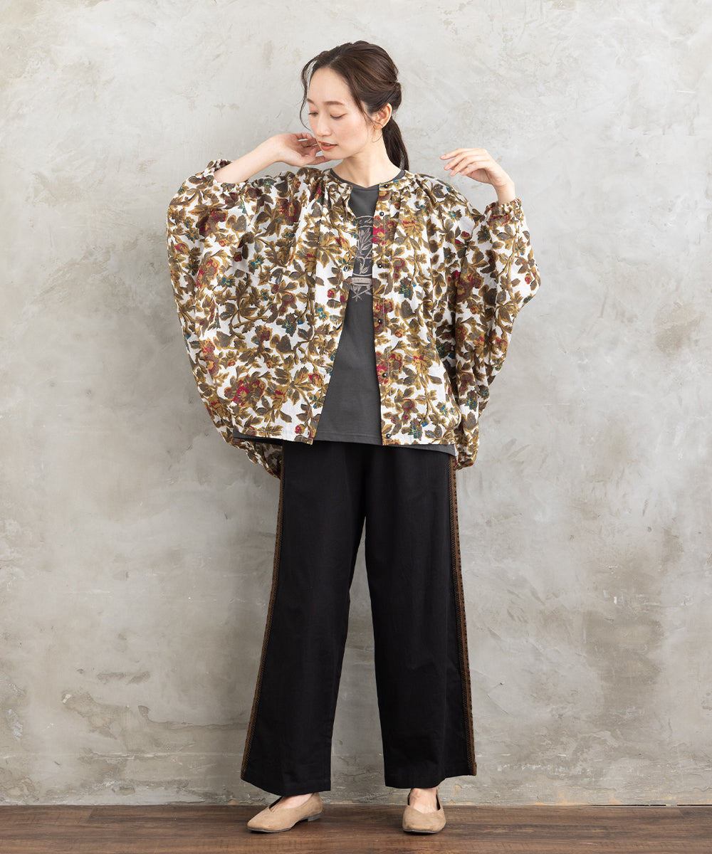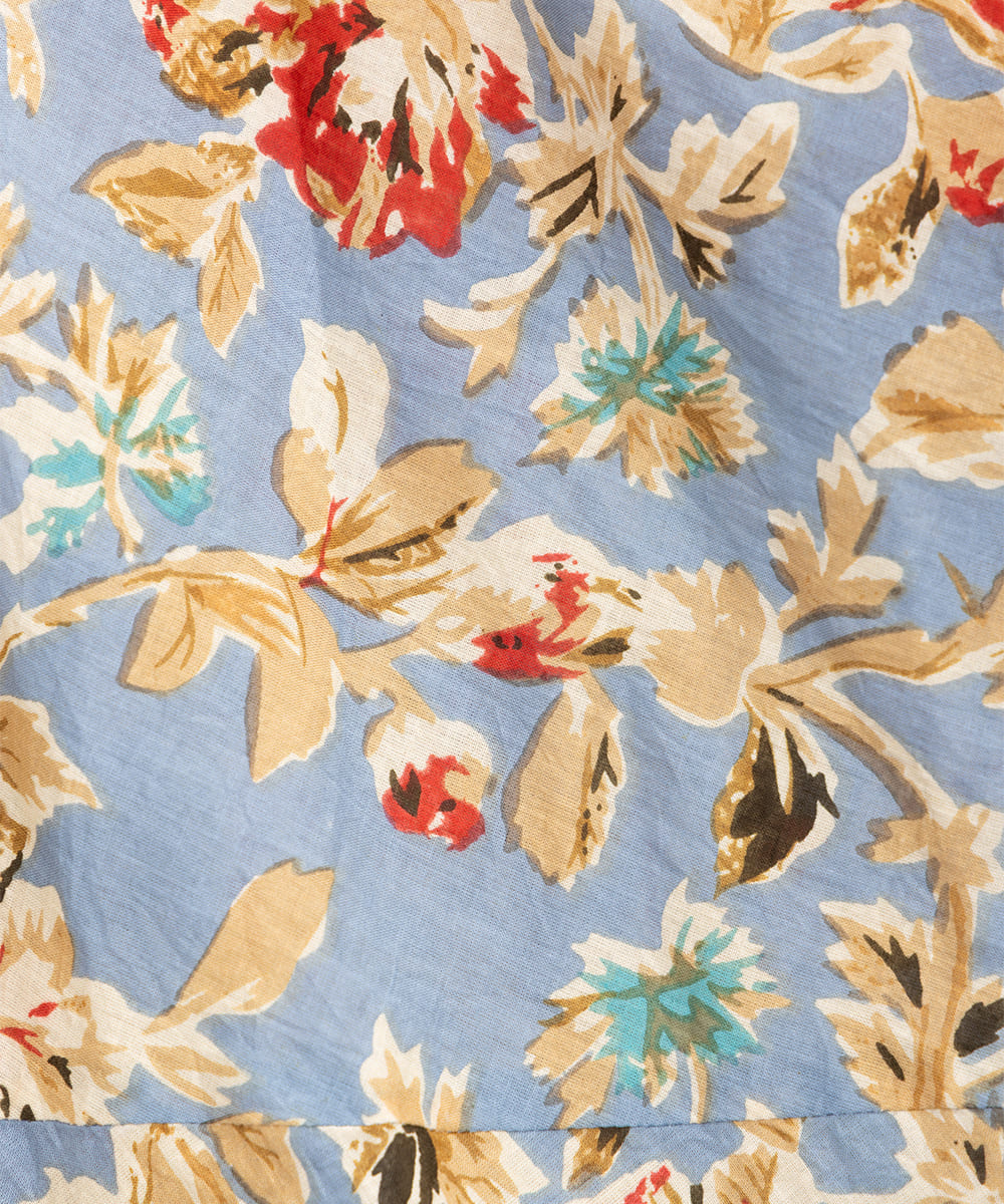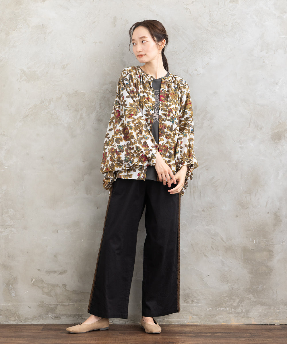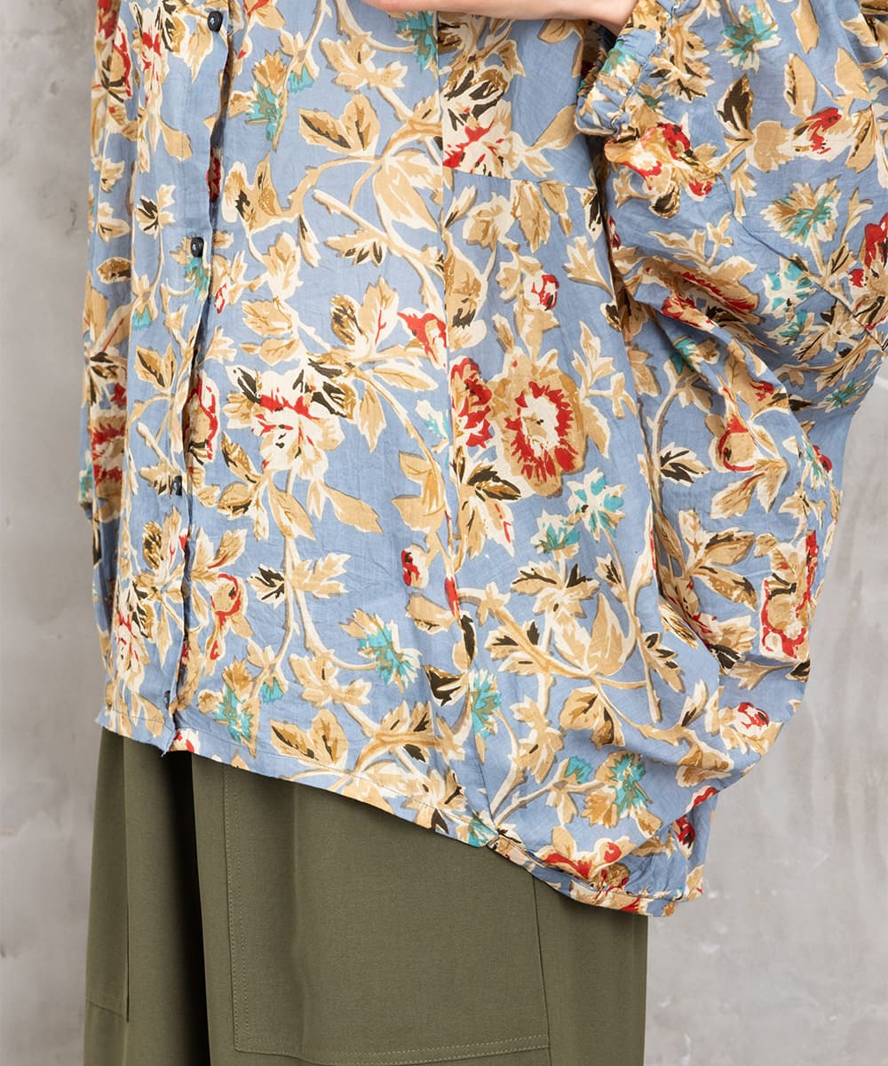 ・デザインポイント:クラシカルなフラワープリント、ギャザー入りネック、袖口タック