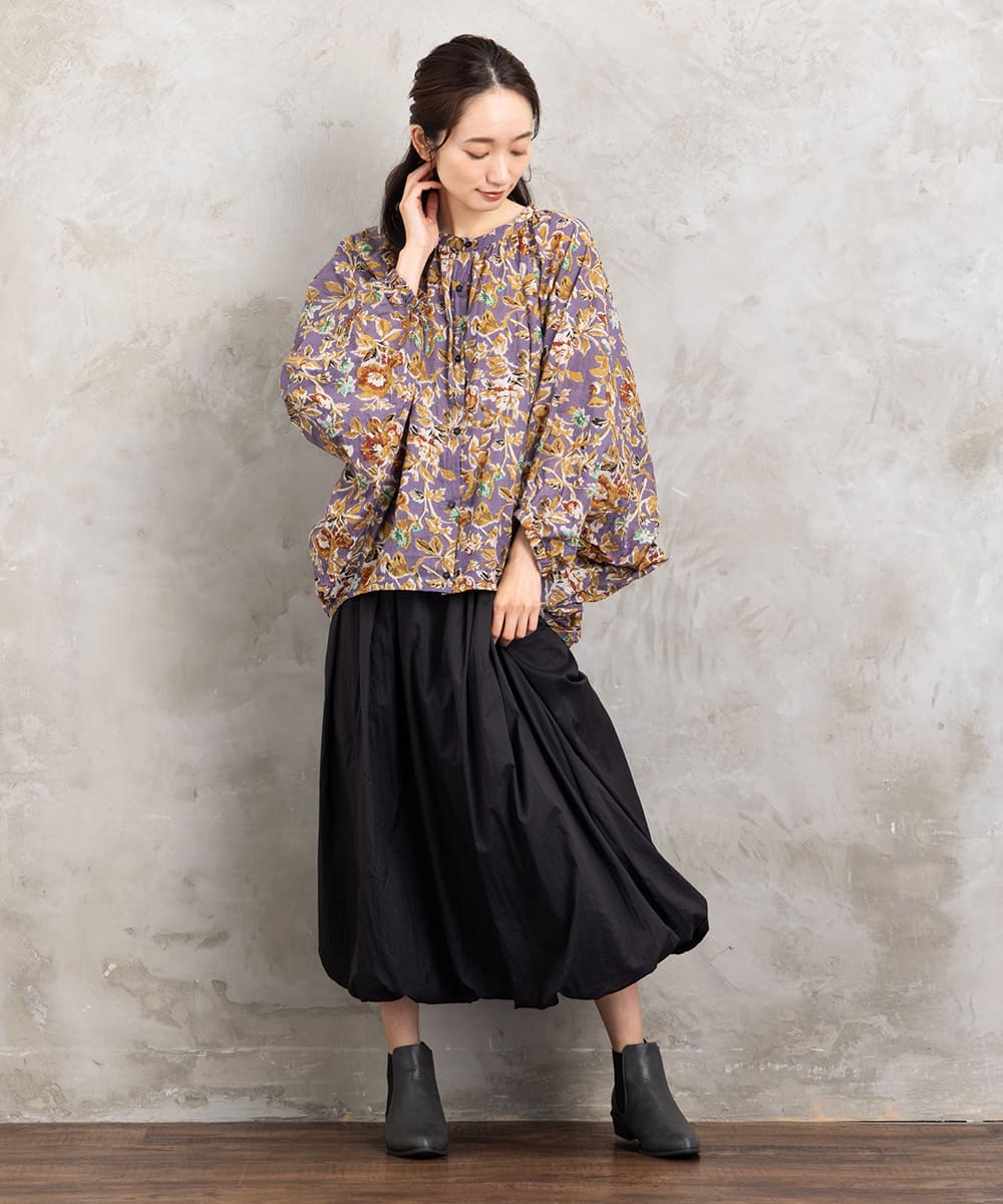 ロングスカートと合わせてワンピース風にまとめれば、リラックス感のある華やかスタイルに。