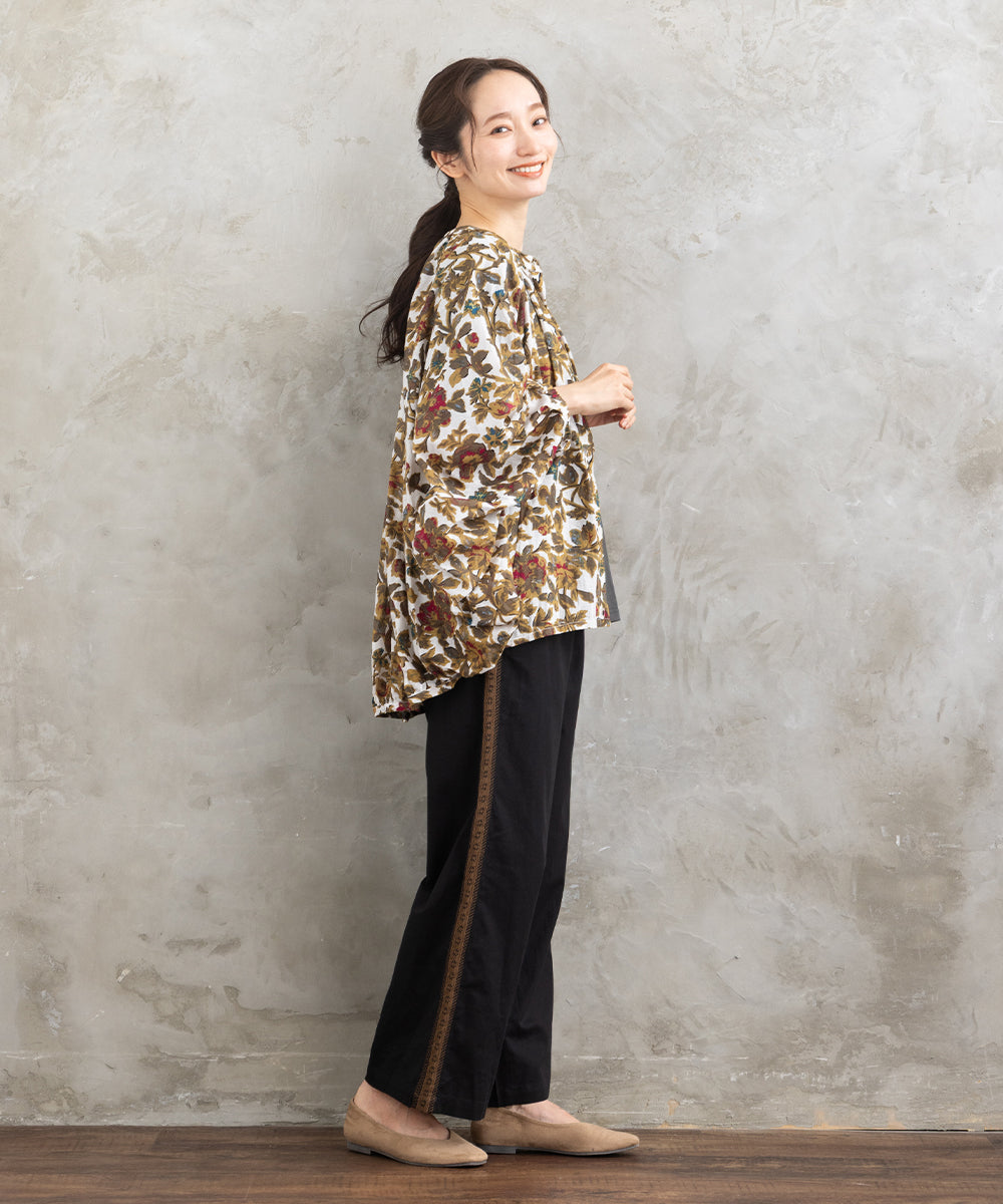 ・デザインポイント:クラシカルなフラワープリント、ギャザー入りネック、袖口タック
