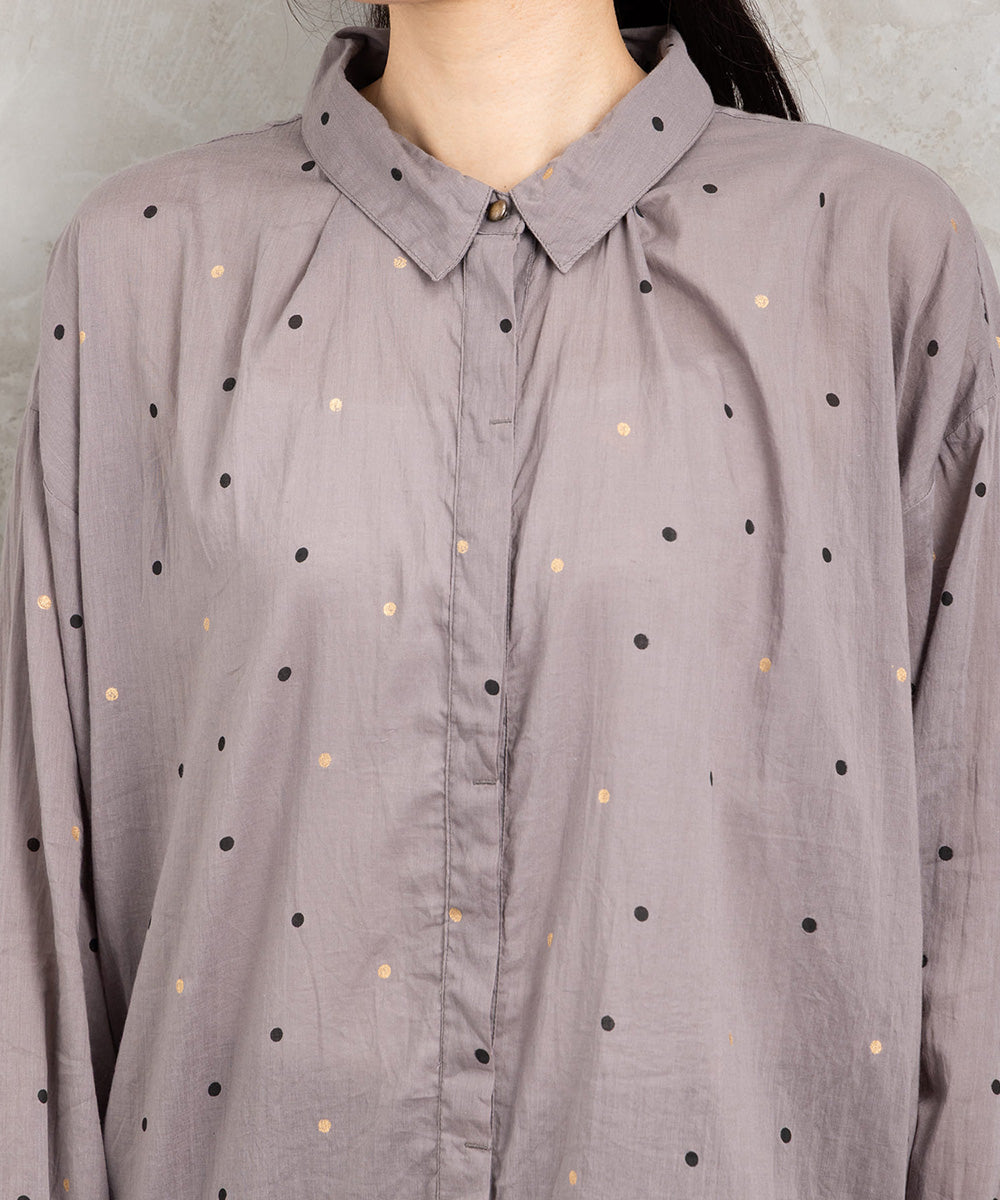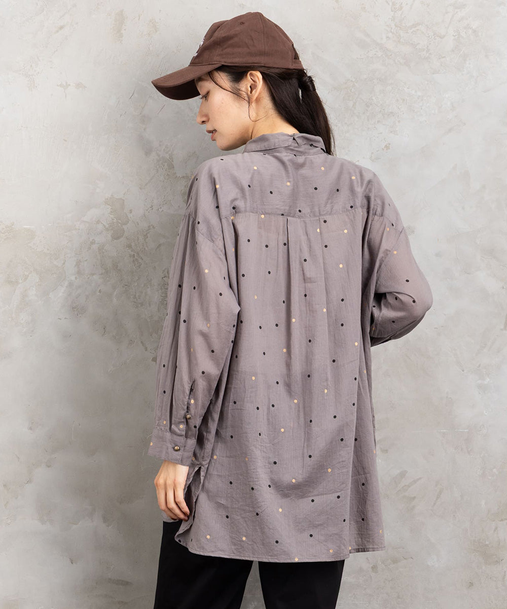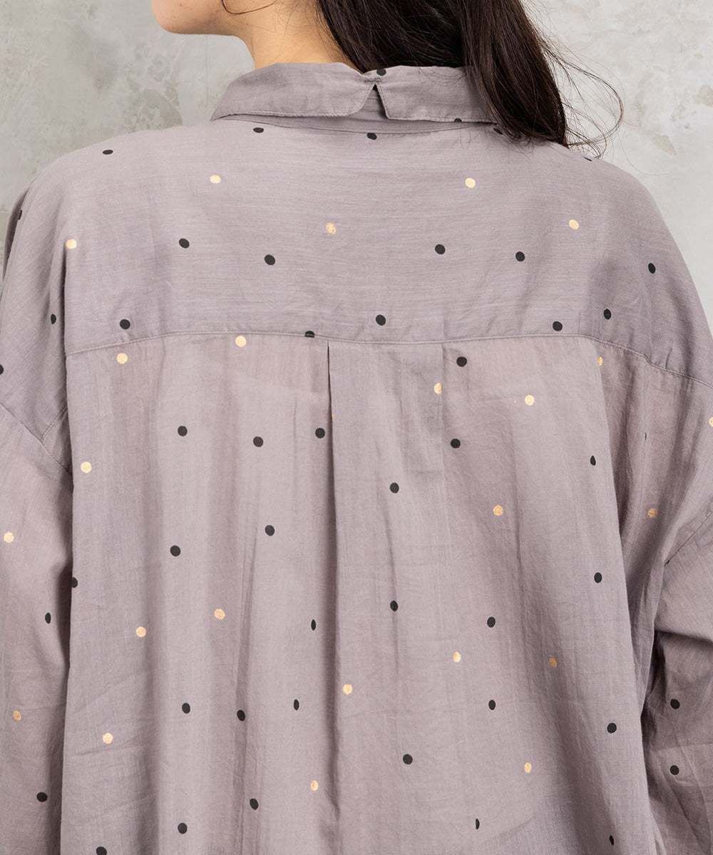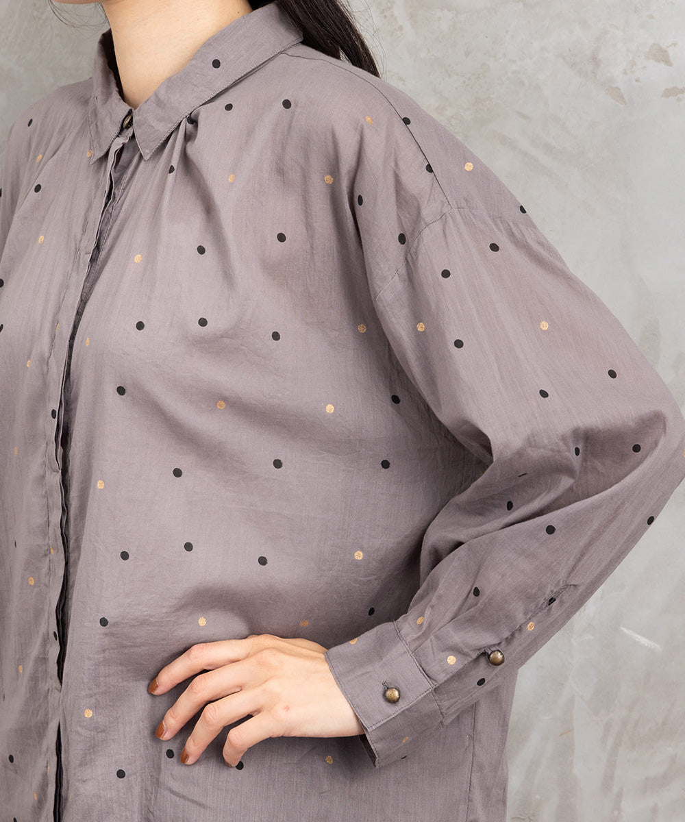 ランダムに配された小さなドットが、シンプルなグレートーンにさりげない遊び心を添えるロングシャツブラウス。