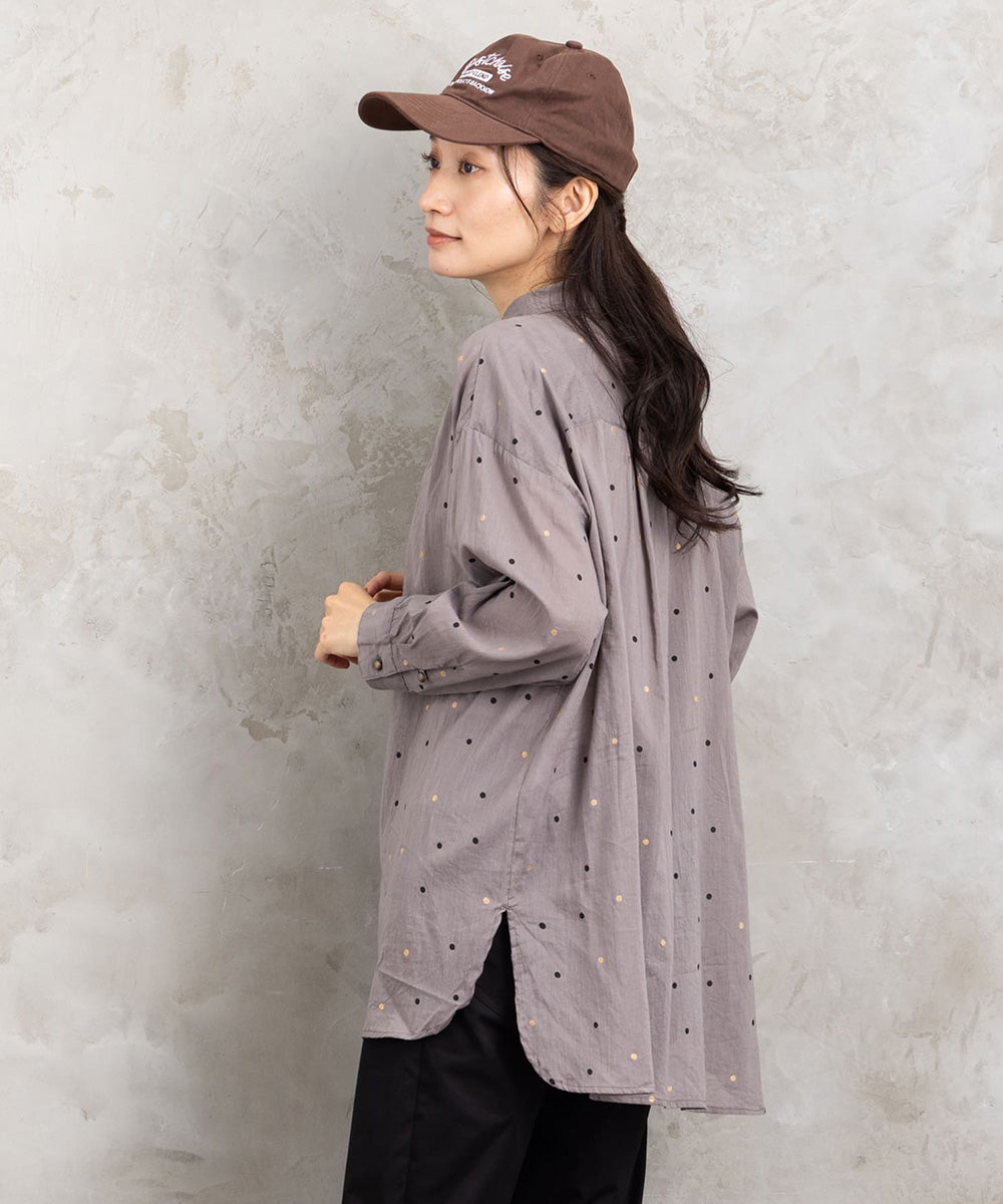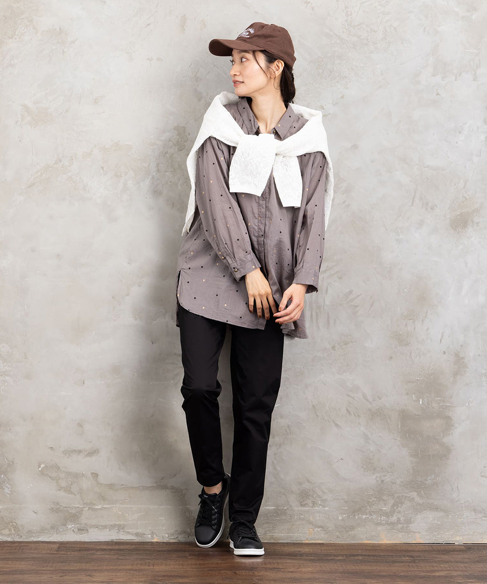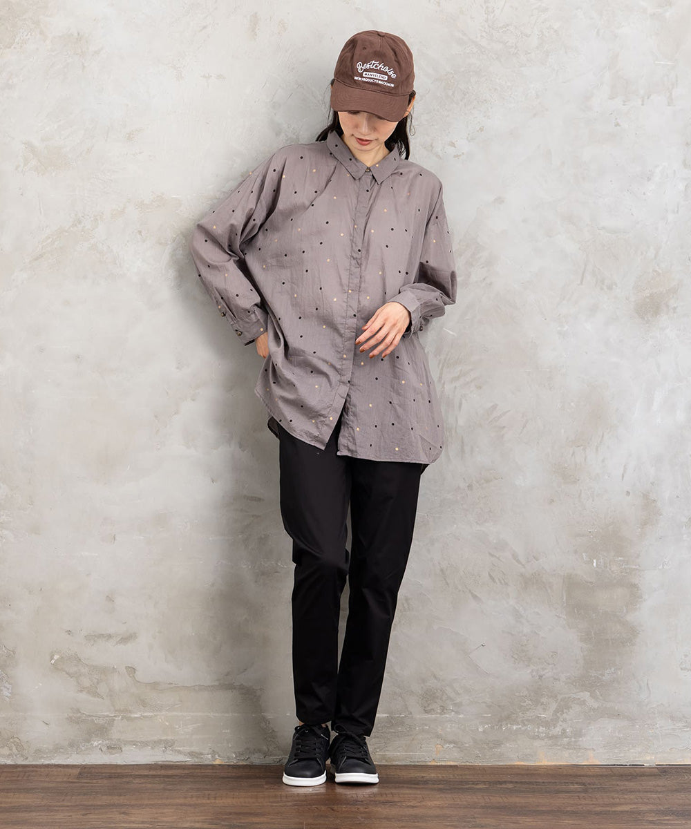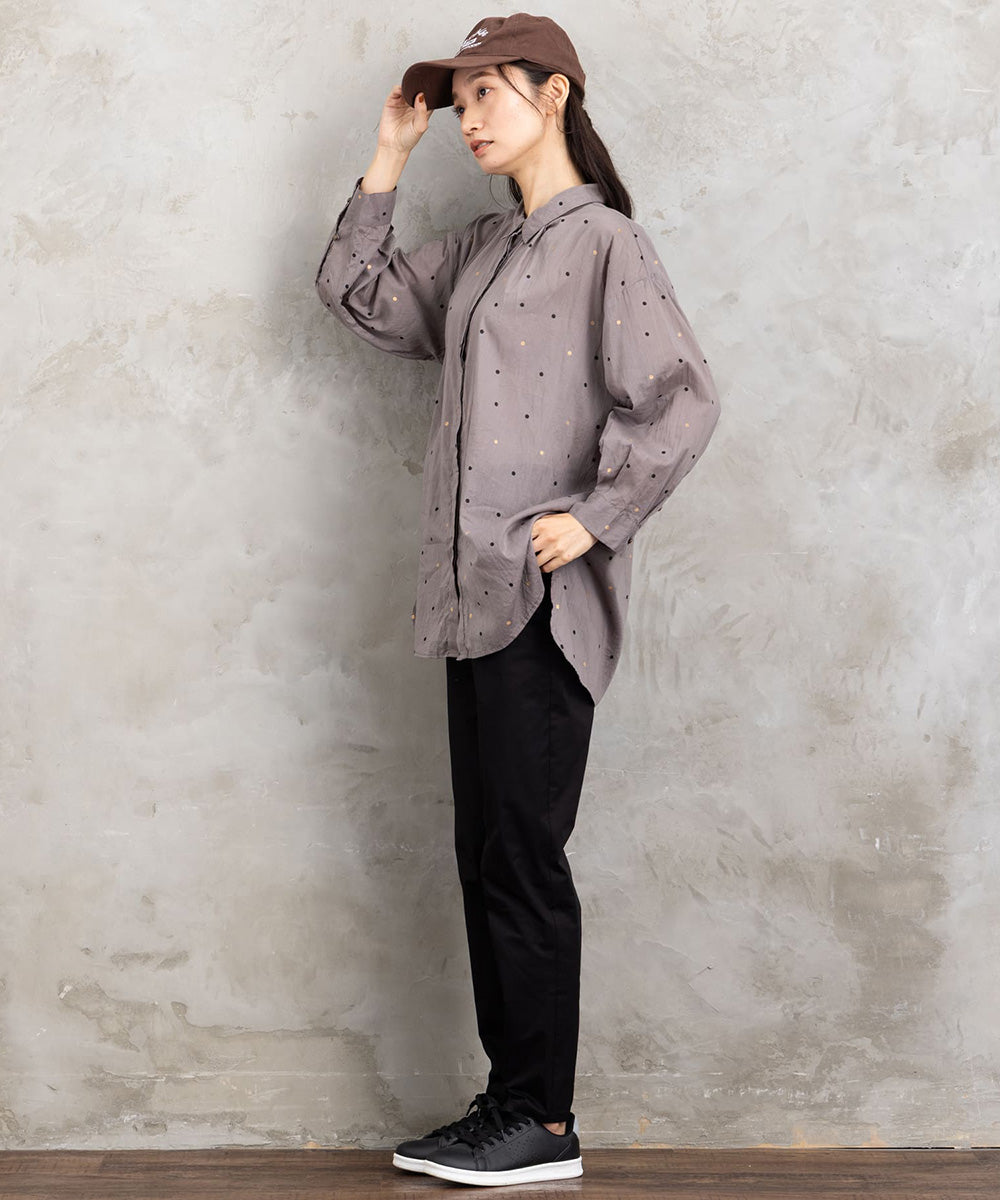 ランダムに配された小さなドットが、シンプルなグレートーンにさりげない遊び心を添えるロングシャツブラウス。
