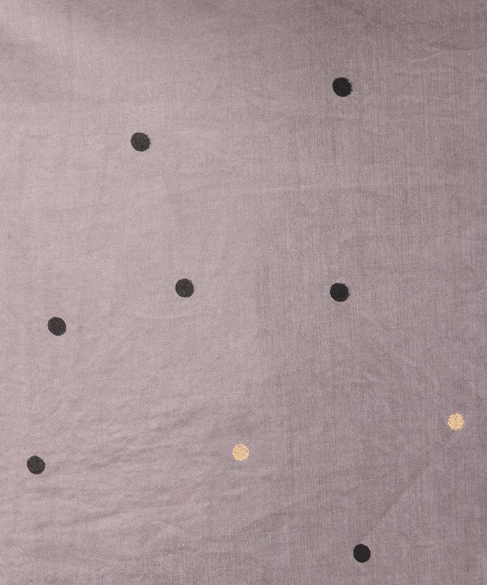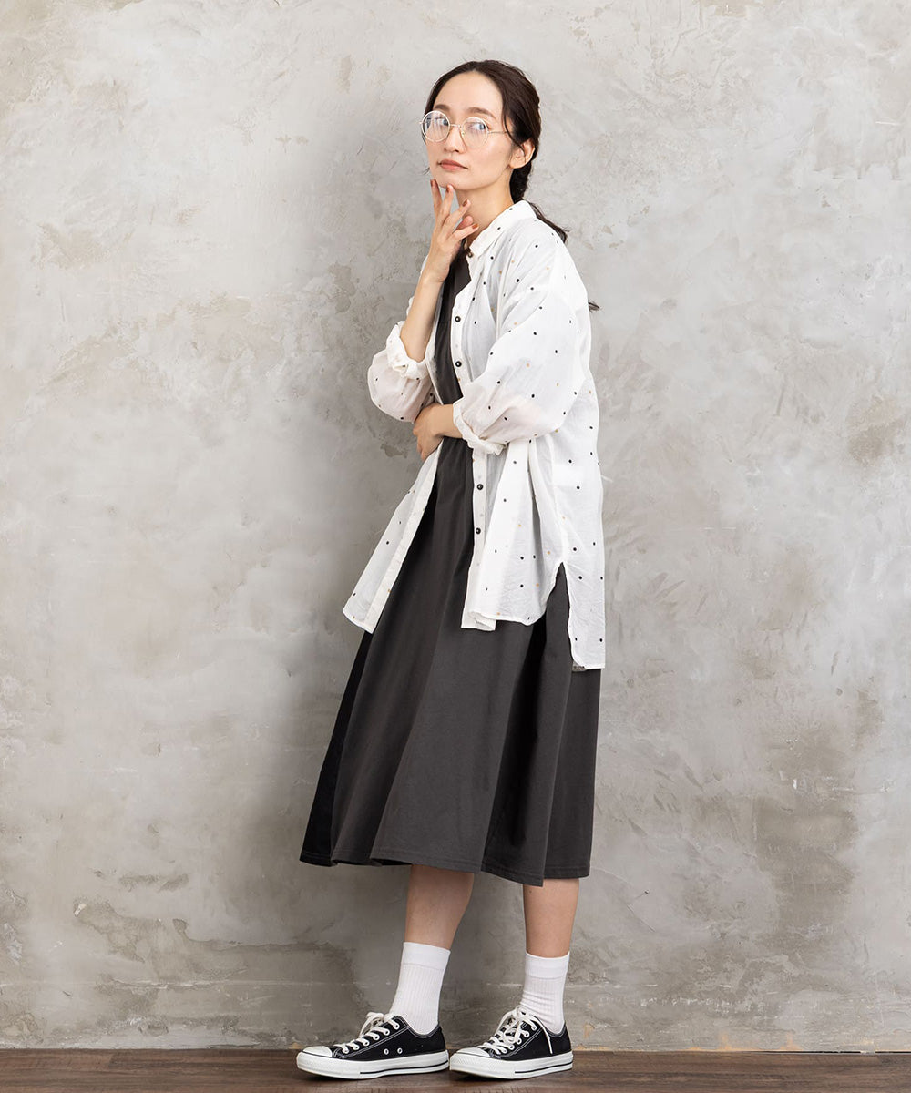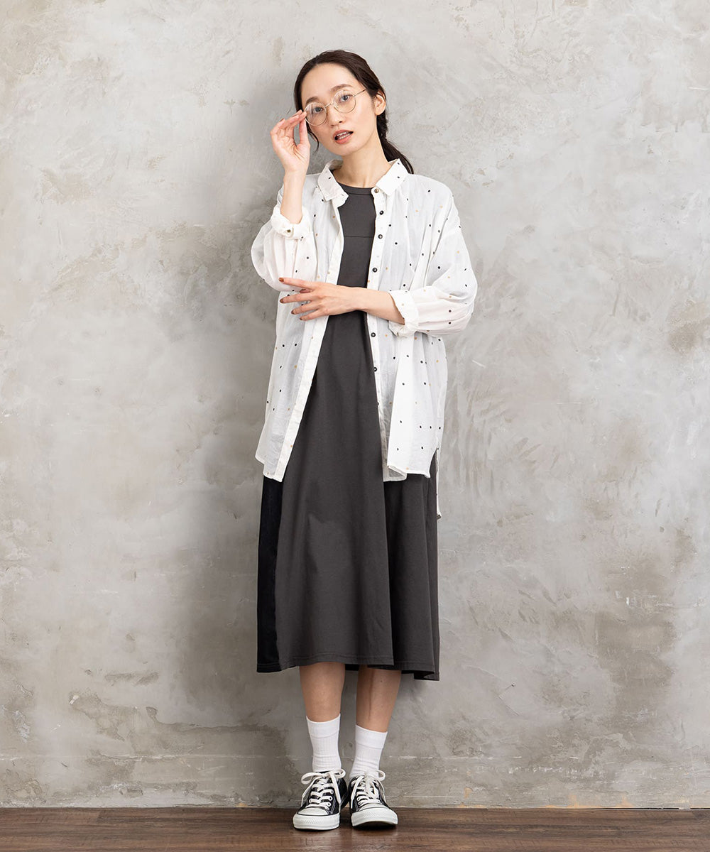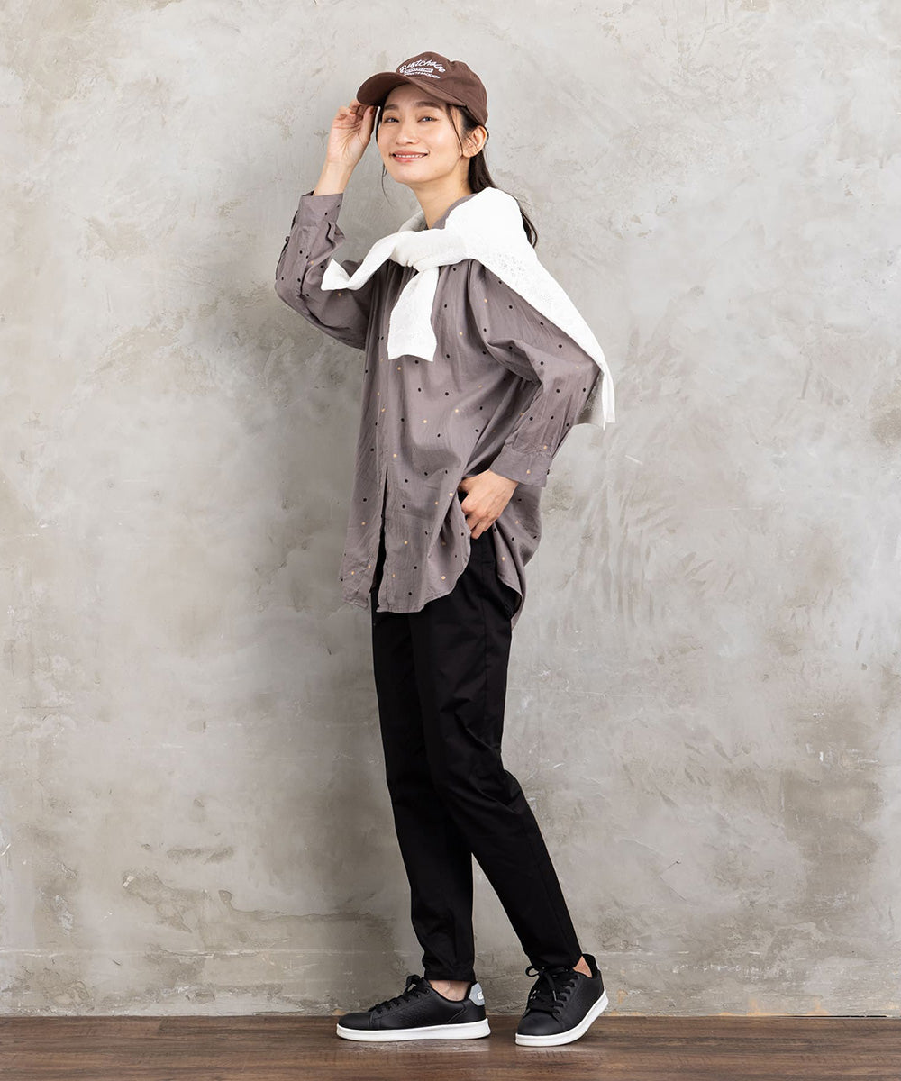 ランダムに配された小さなドットが、シンプルなグレートーンにさりげない遊び心を添えるロングシャツブラウス。