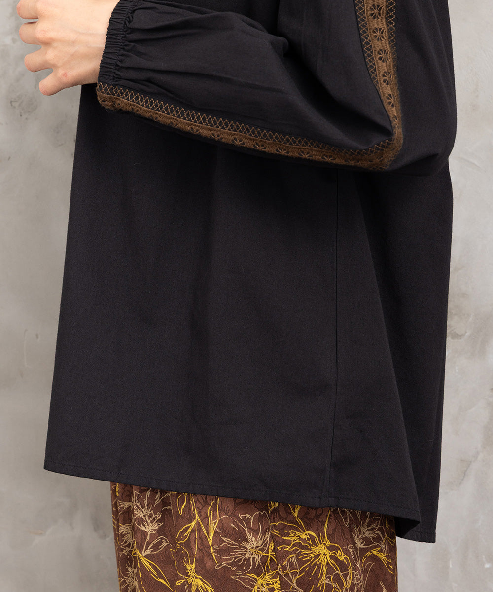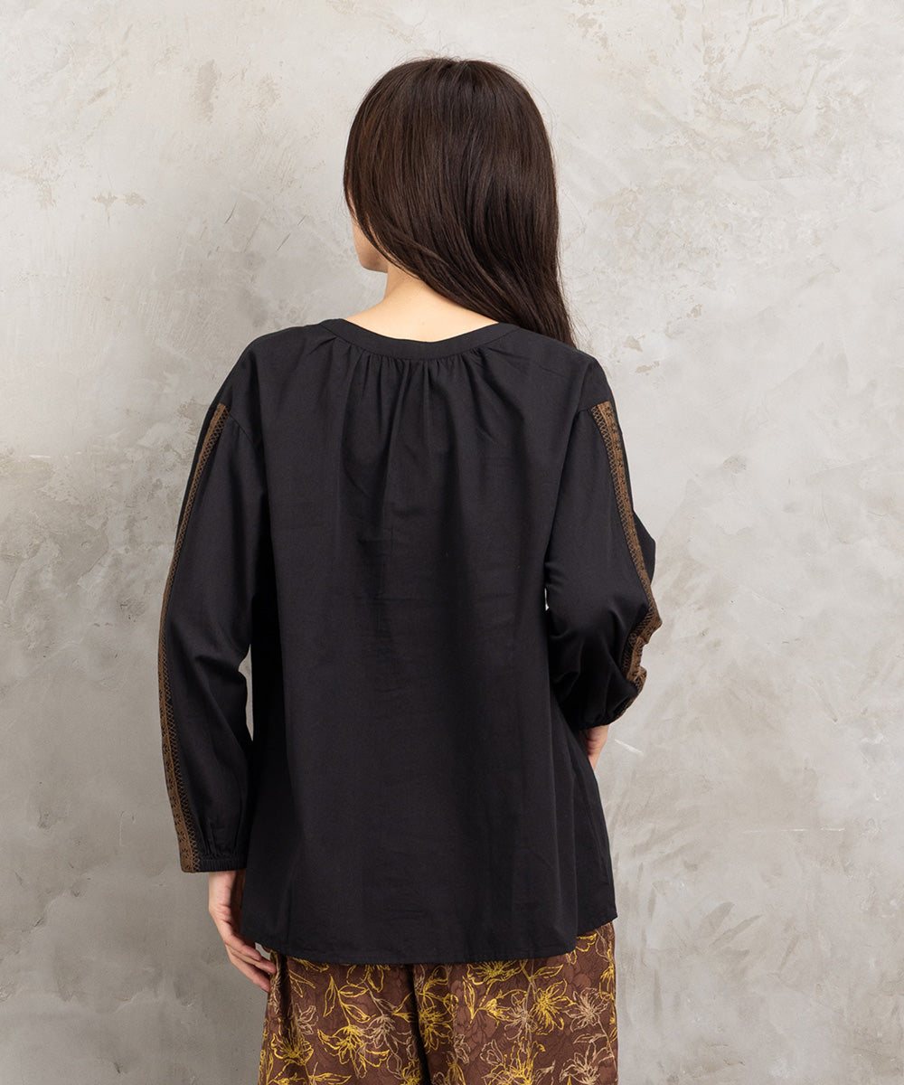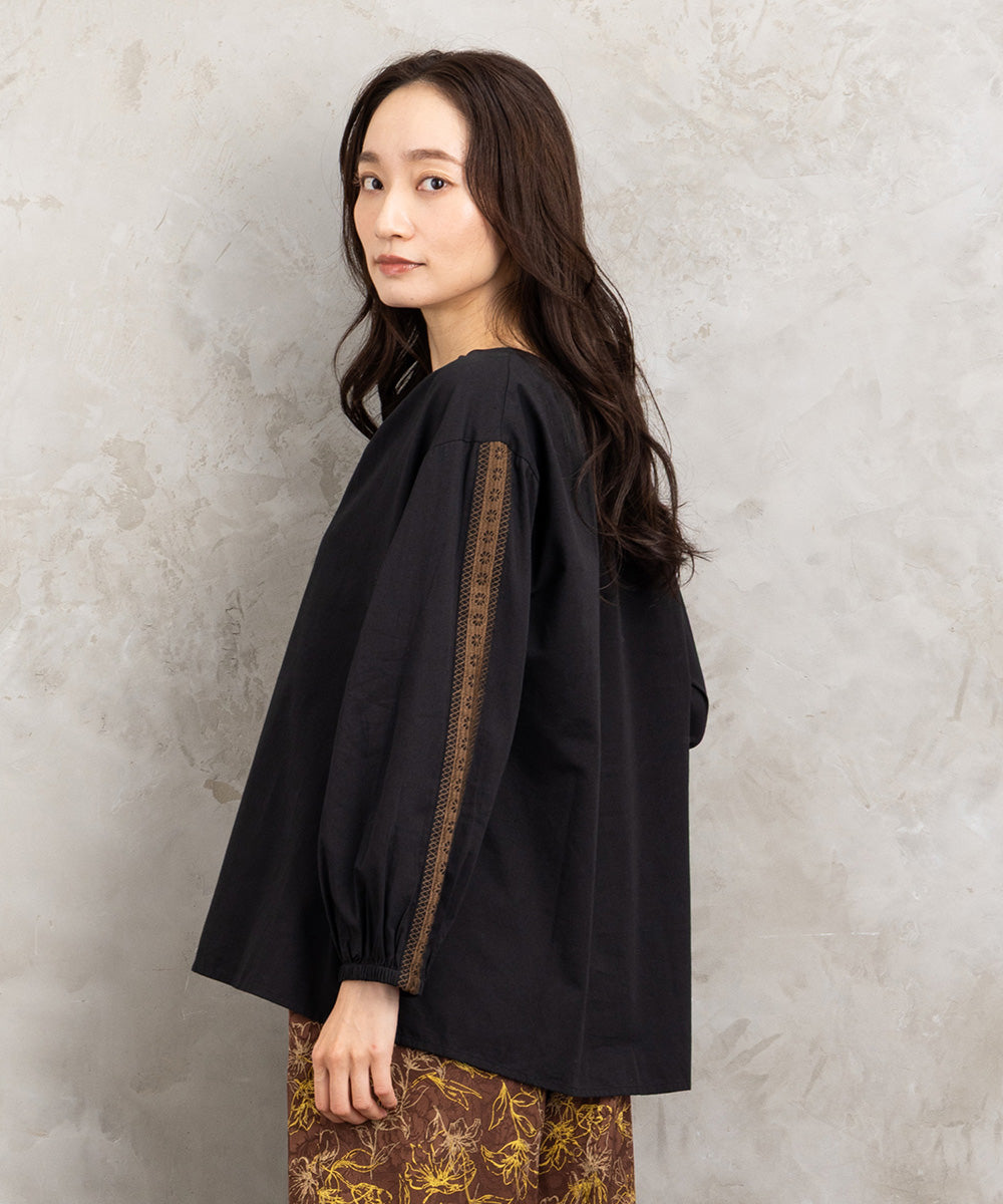 ゆったりとしたシルエットに、袖のチロリアンテープのような刺しゅうがさりげないアクセントを添えるブラウス。