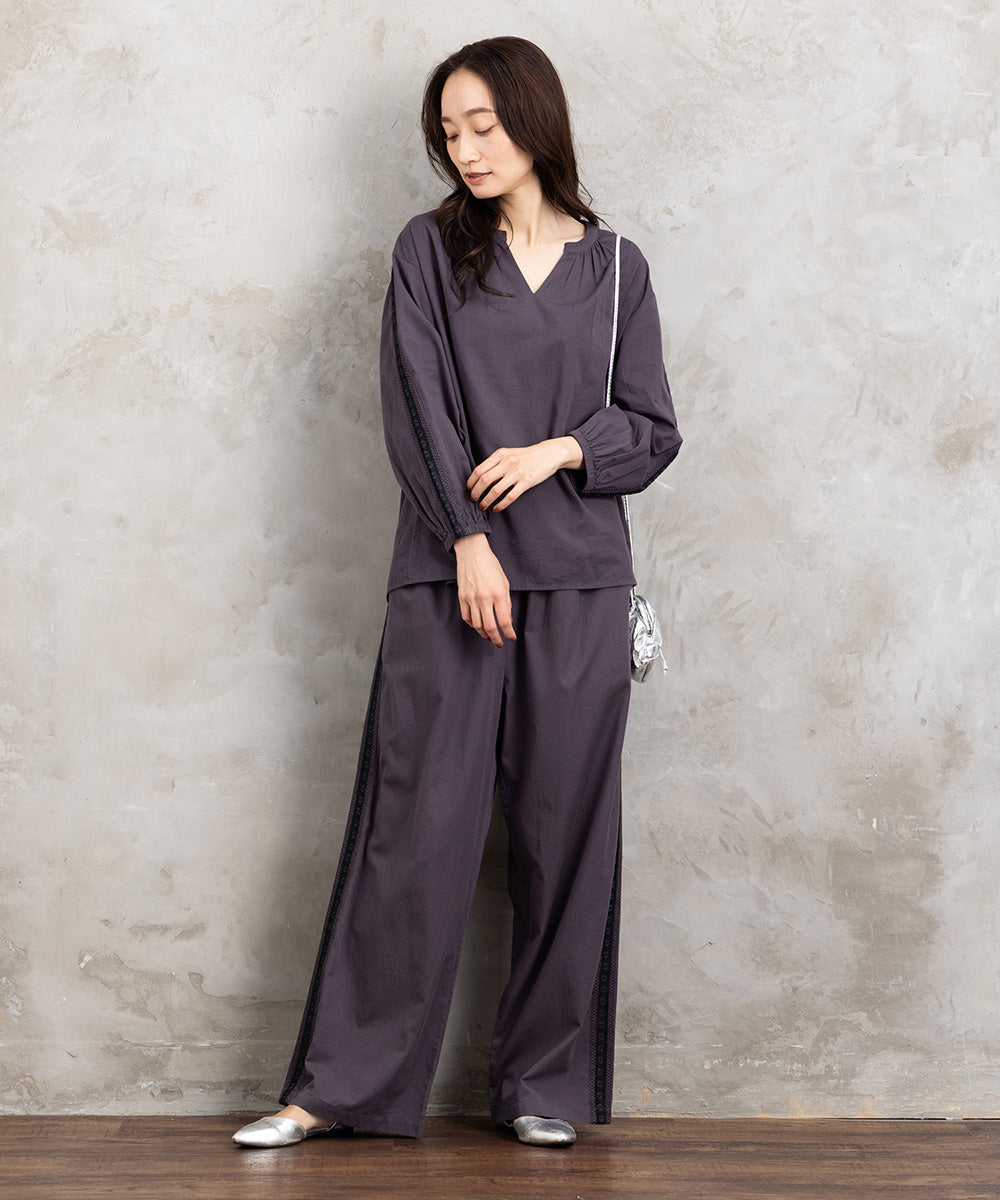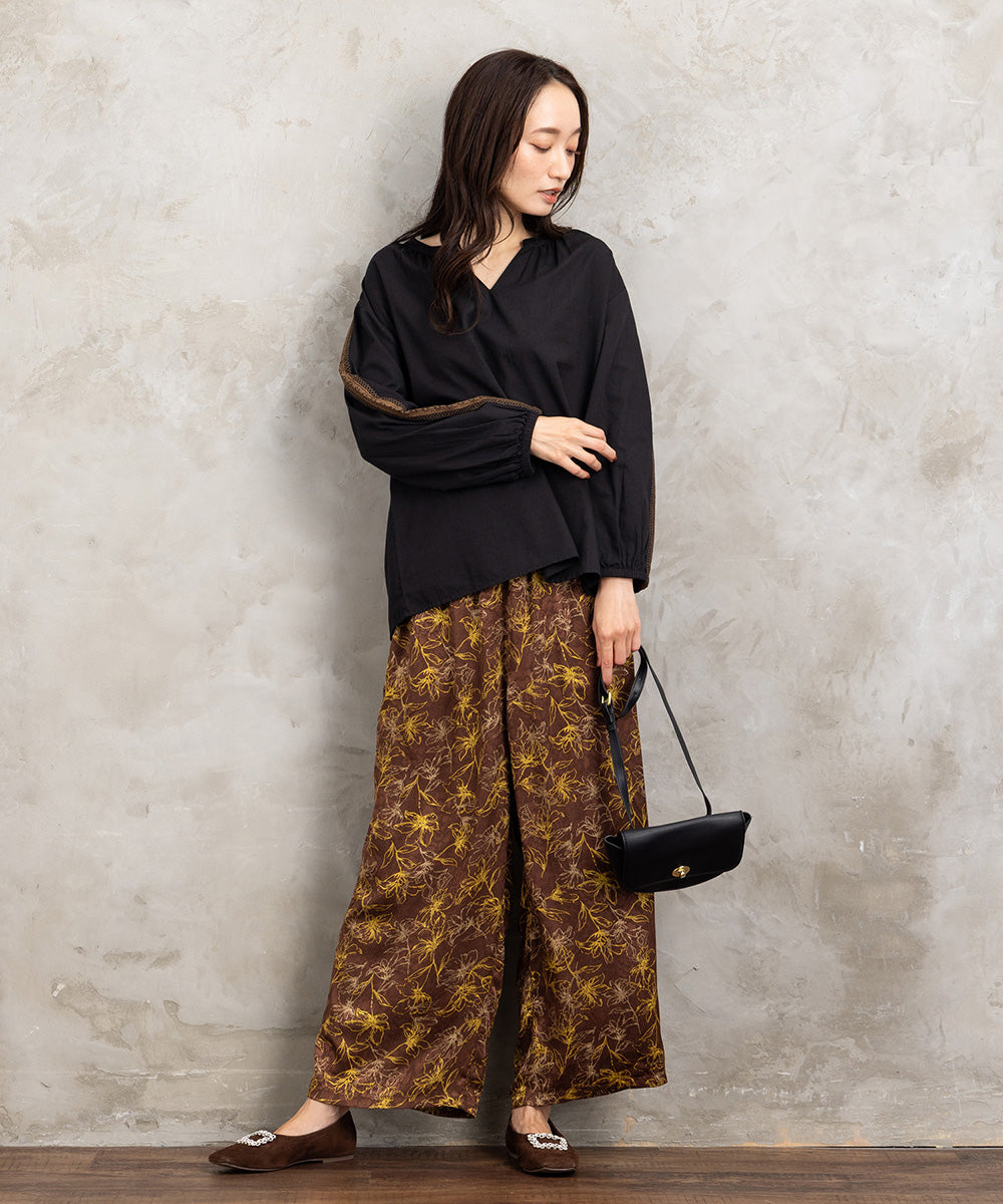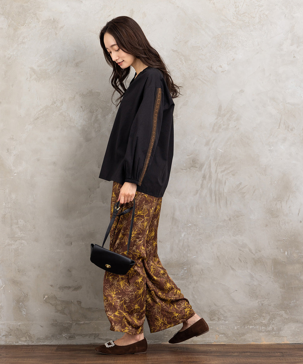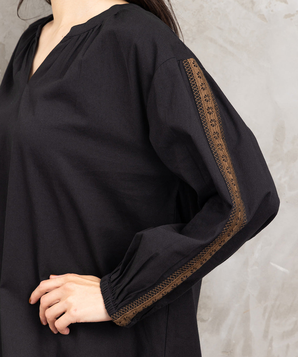 ゆったりとしたシルエットに、袖のチロリアンテープのような刺しゅうがさりげないアクセントを添えるブラウス。