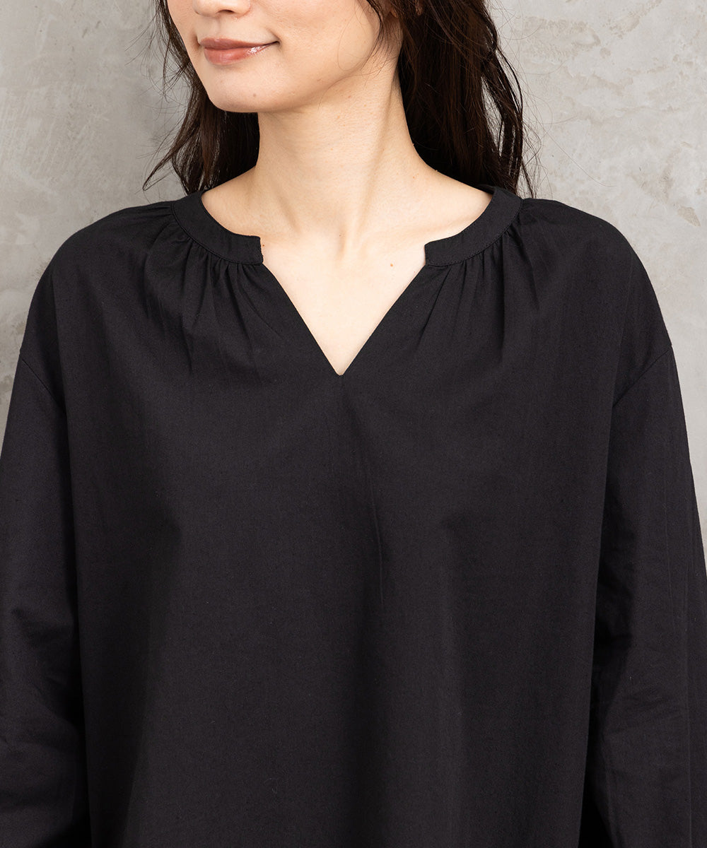 ギャザーの入ったネックラインとスリット風のV開きが顔まわりをすっきりと見せ、ナチュラルな抜け感を演出します。