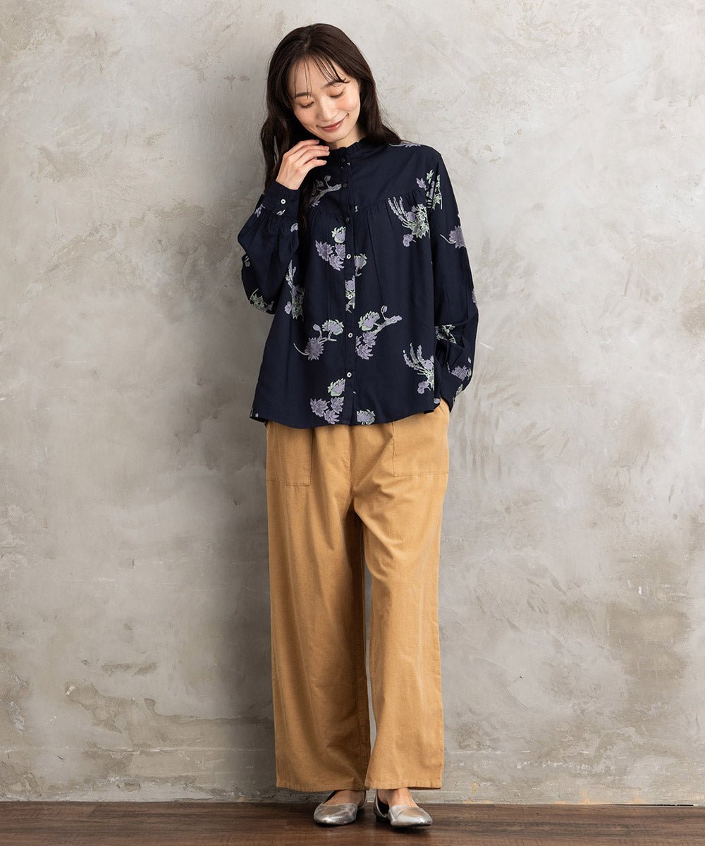 【華やかさと優しさを纏う、フラワープリントフリルカラーブラウス】