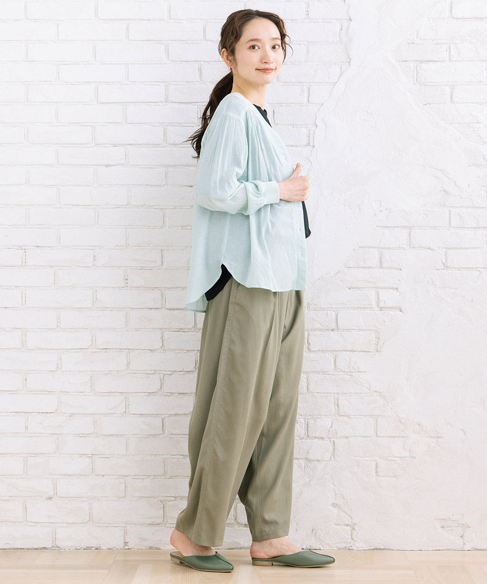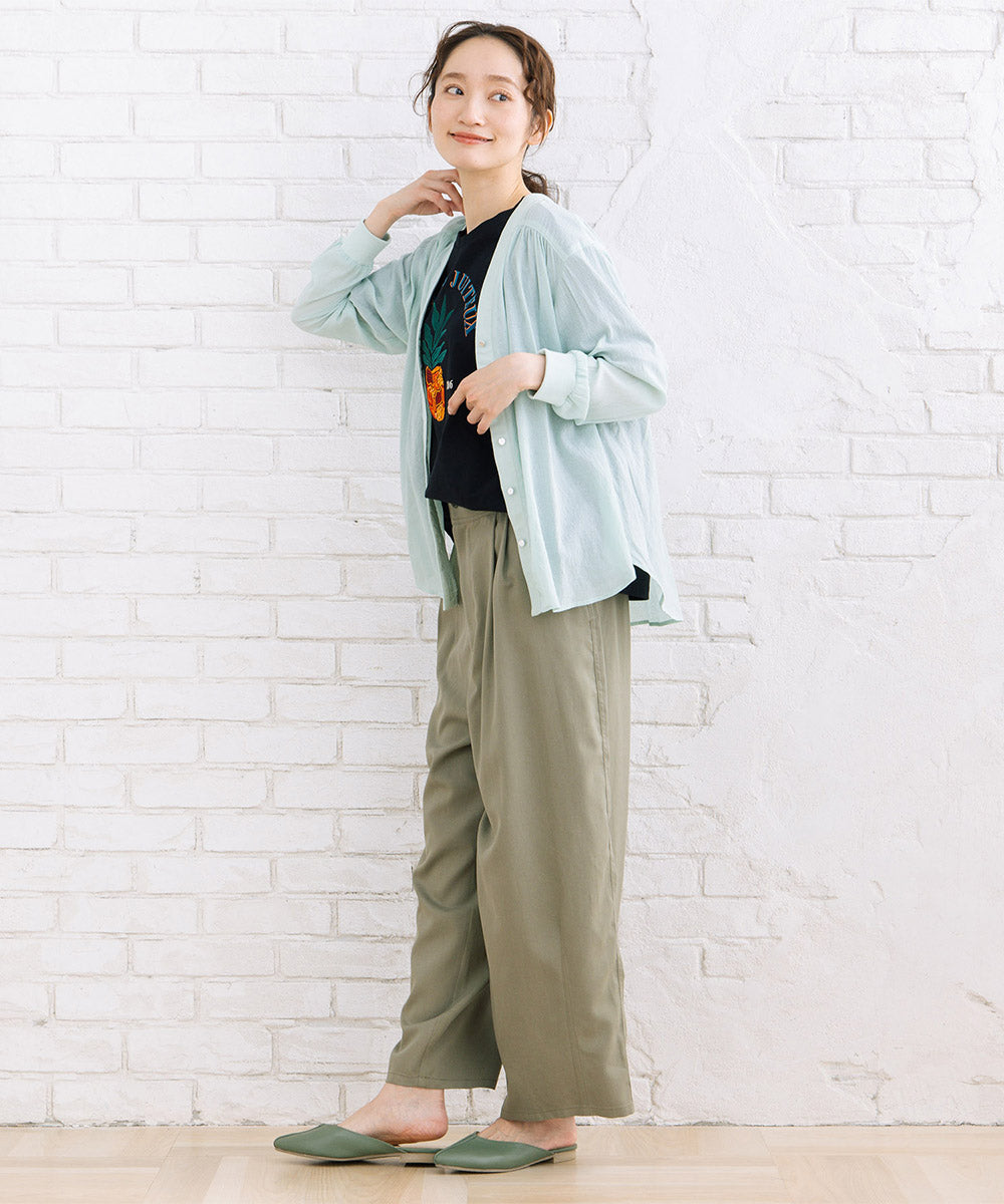 軽やかでさらっと羽織れる着心地が特徴で、シワ感のあるナチュラルな表情がこなれた印象を演出します。