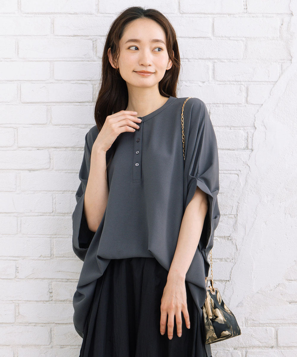 ベーシックなデザインで、オフィスからカジュアルまで幅広いシーンで活躍してくれる着回し力の高いブラウスです。