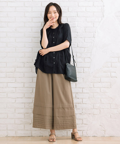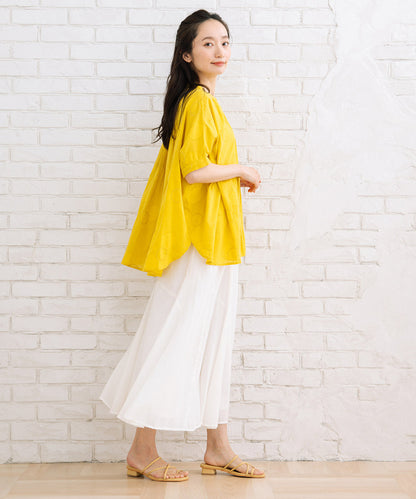 首元をすっきりと見せるバンドカラーと、程よいボリューム感のあるドルマンシルエットが、洗練された大人の女性らしさを演出してくれます。