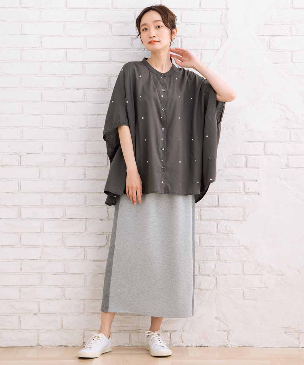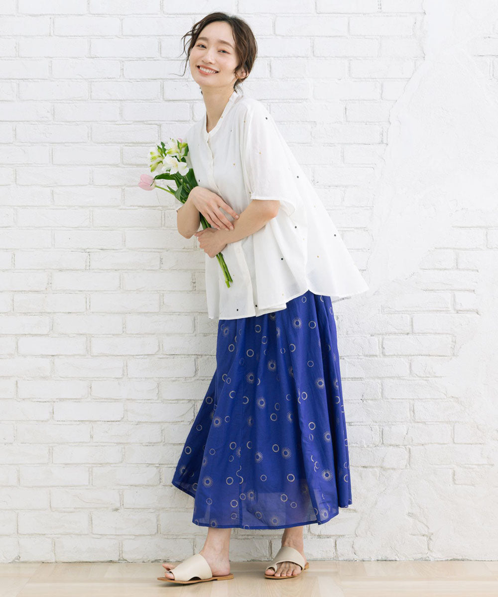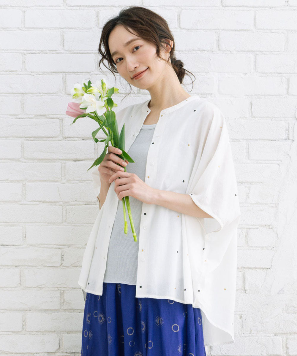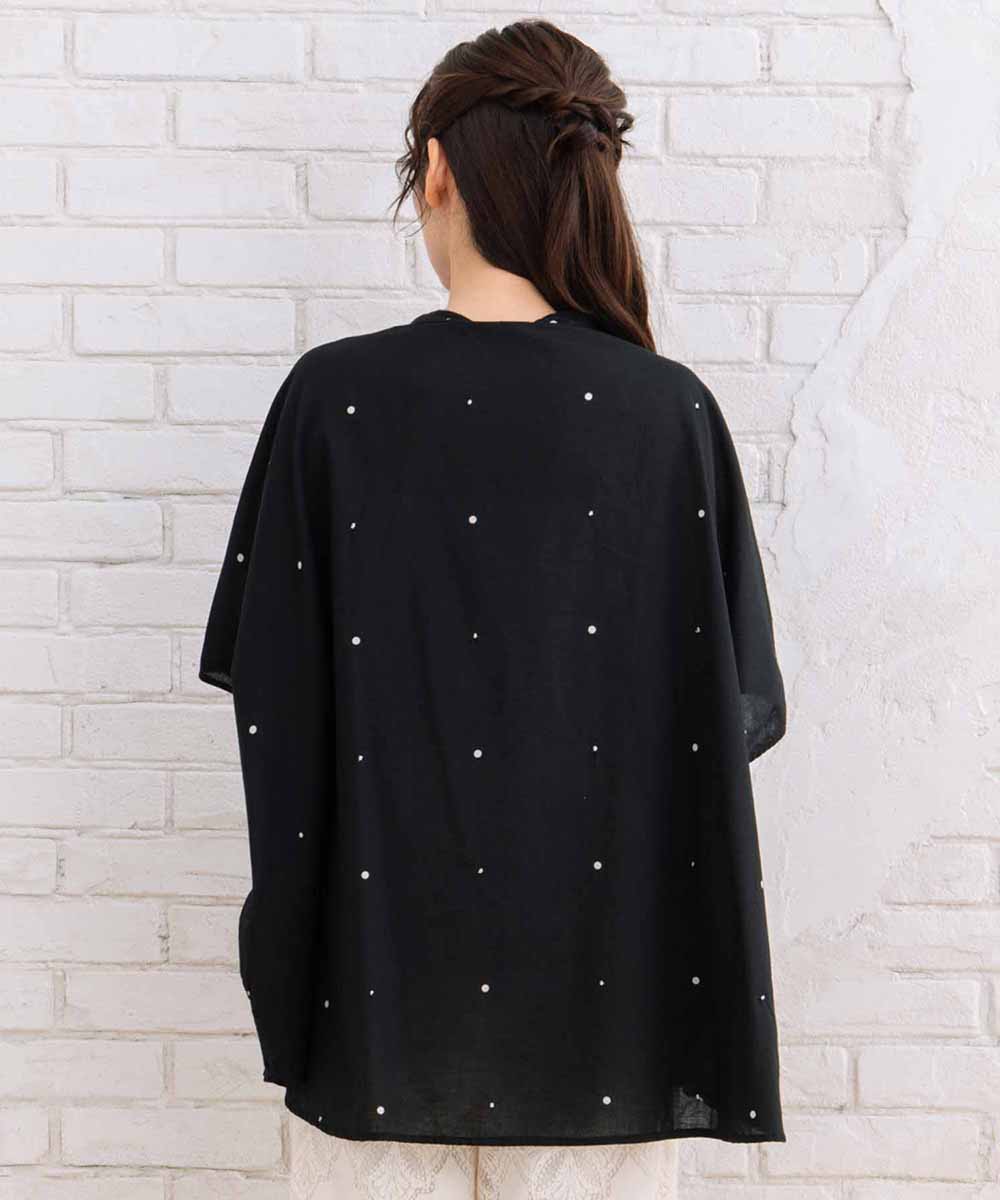 インドコットンの風合いと、表情豊かなドット柄が魅力的なドルマンシャツ。