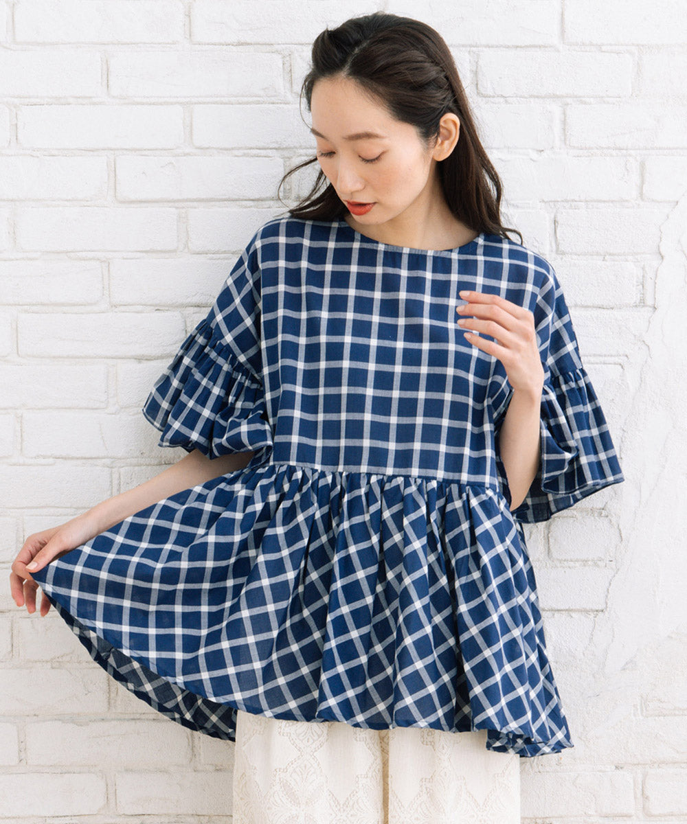 クラシカルなチェック柄を、ボリュームのあるフリル袖とペプラムシルエットは1枚で主役級の存在感。
