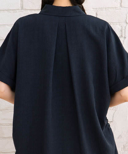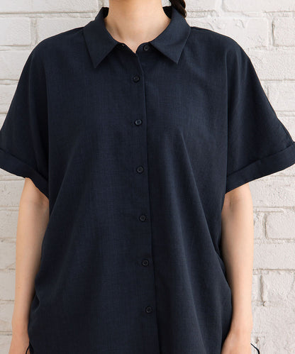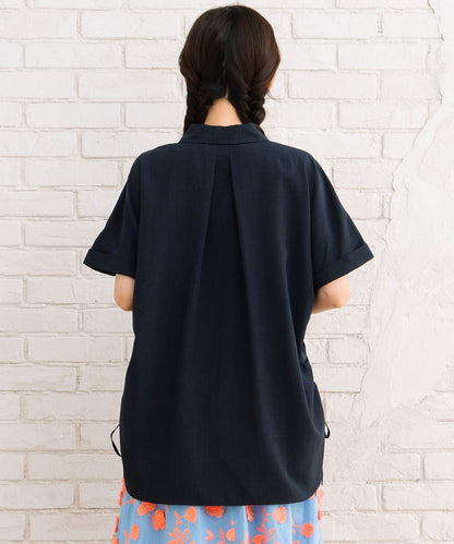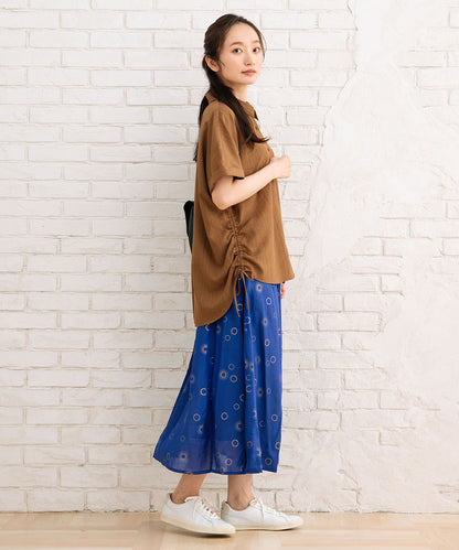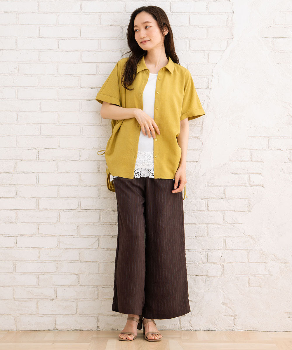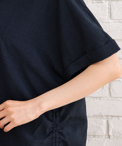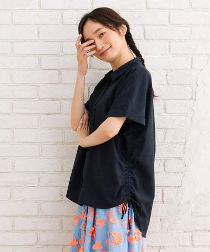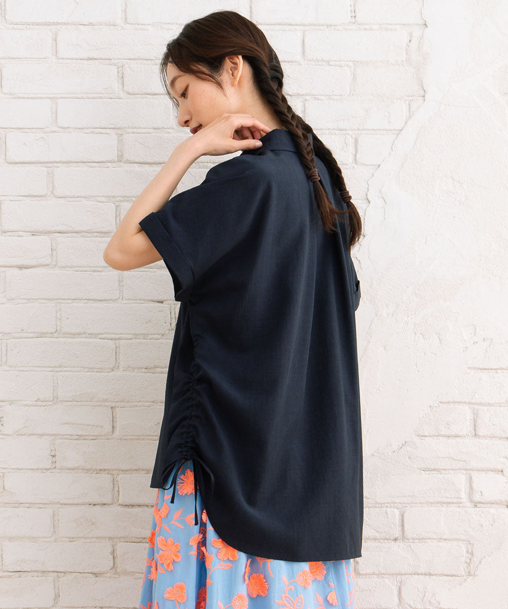 くしゅっと寄せたギャザーとサイドリボンが印象的な、ドローストリングデザインのリネンライクシャツ。