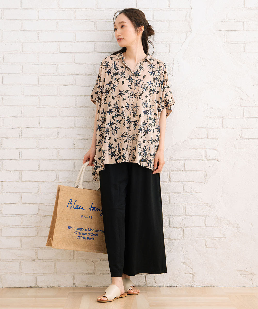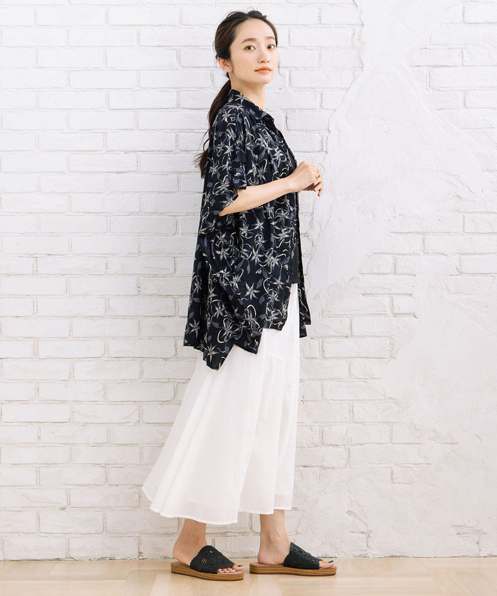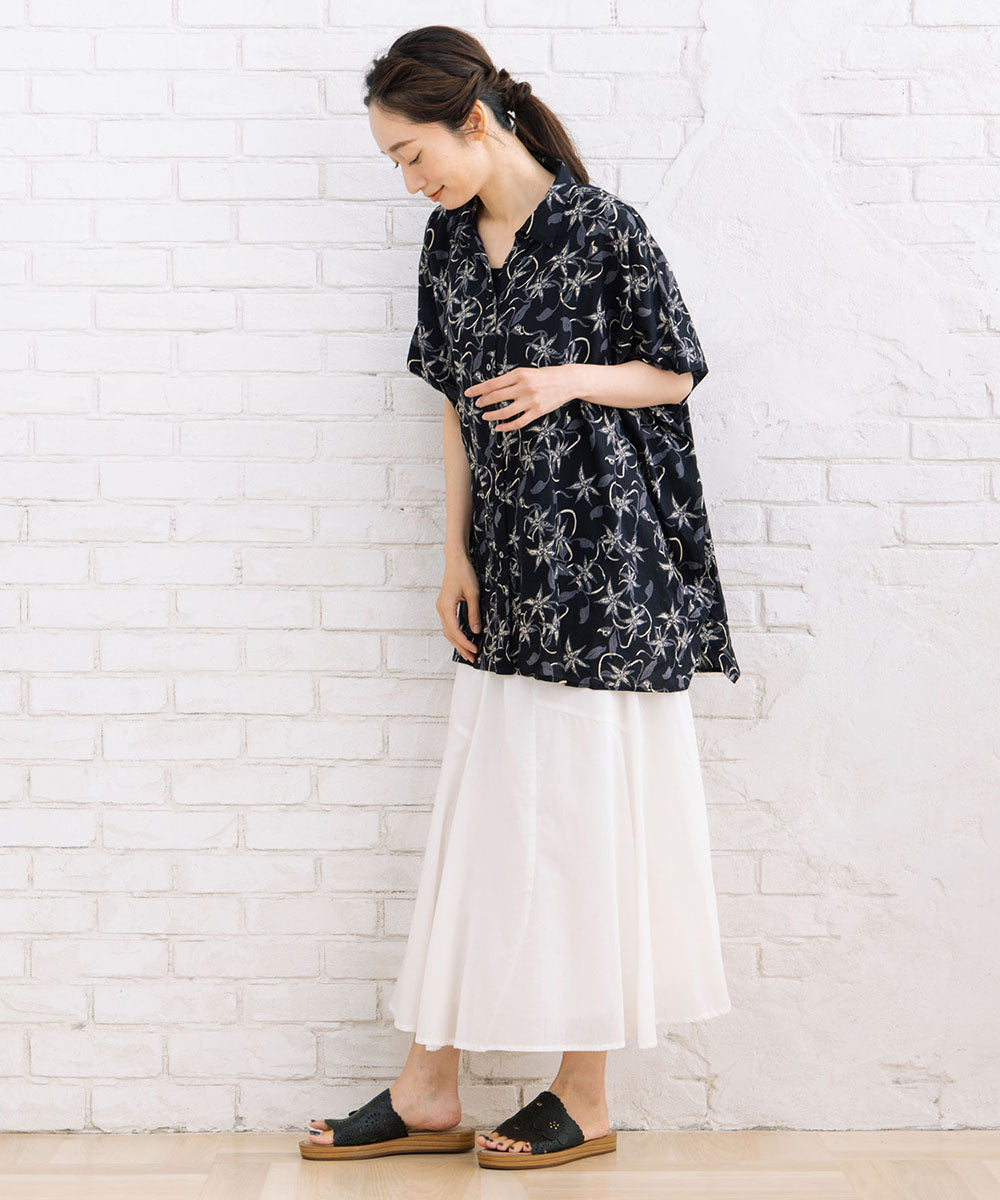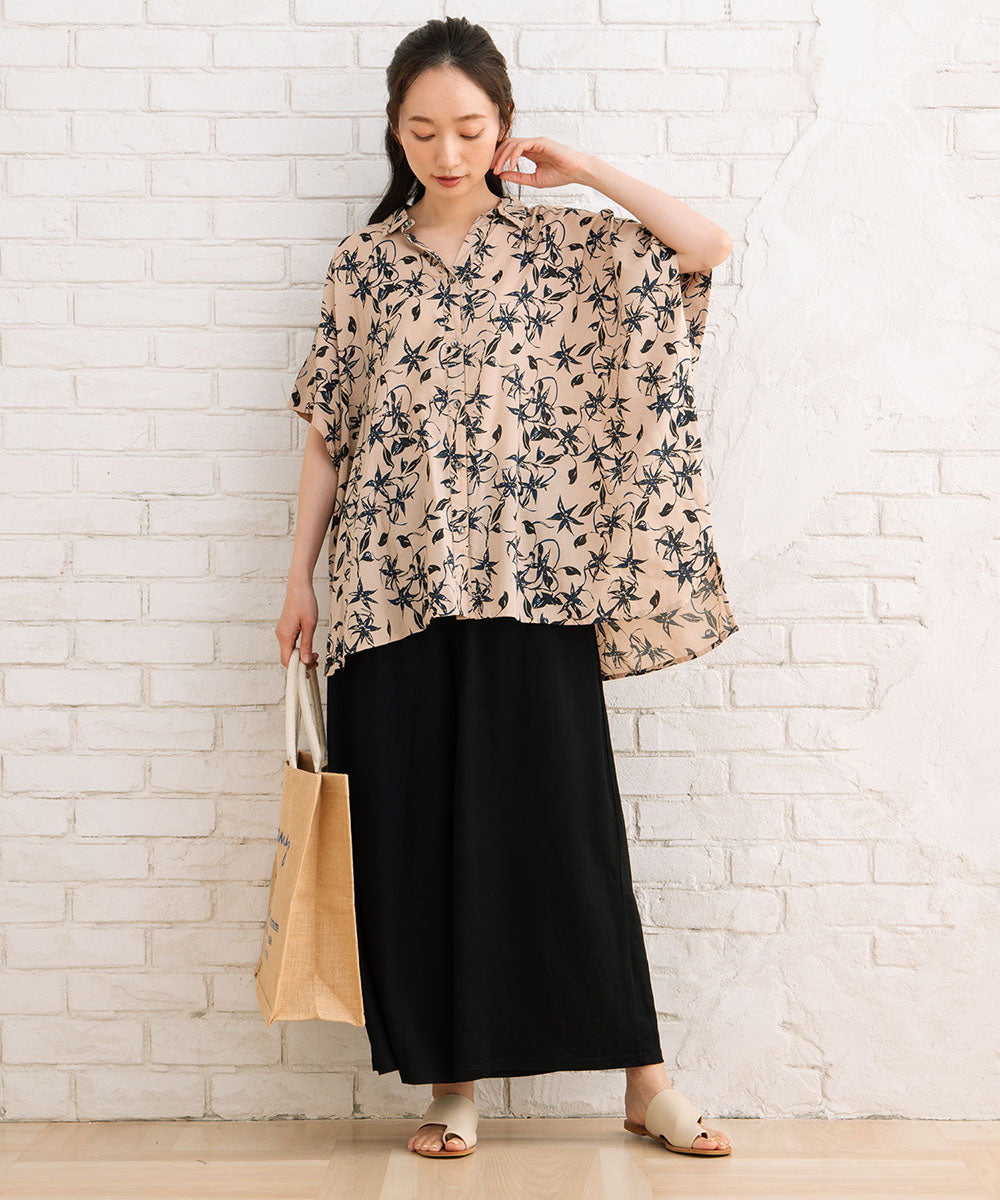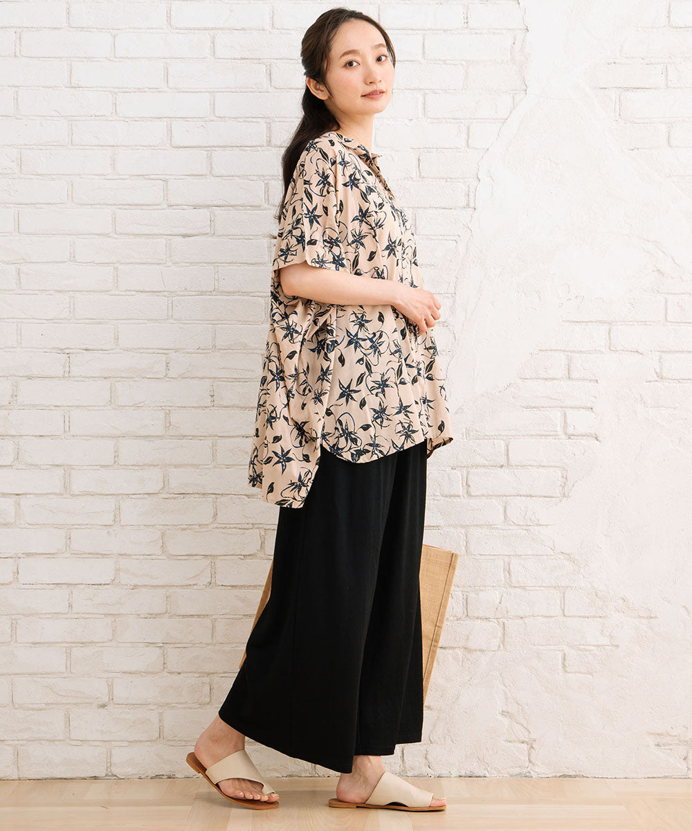 華やかさと抜け感を両立したリーフプリントワイドシャツ。