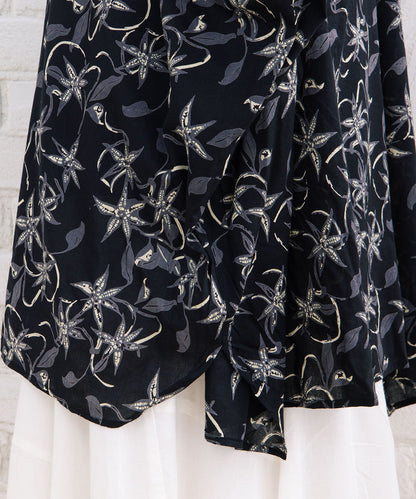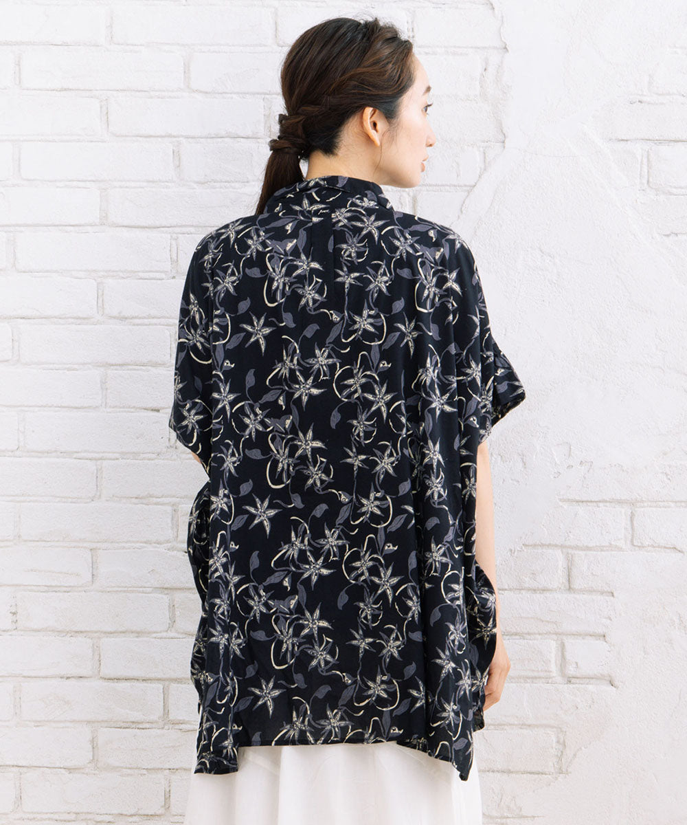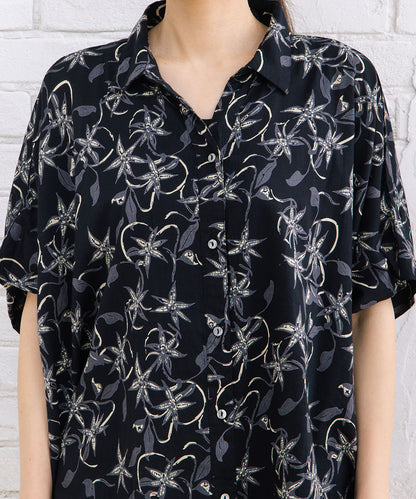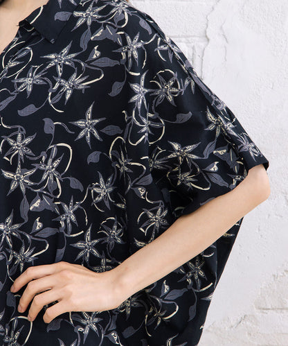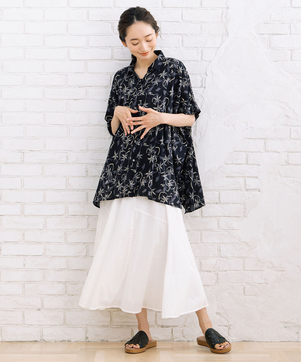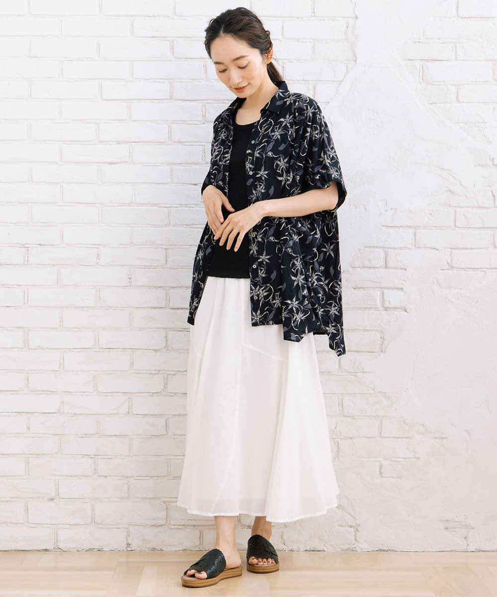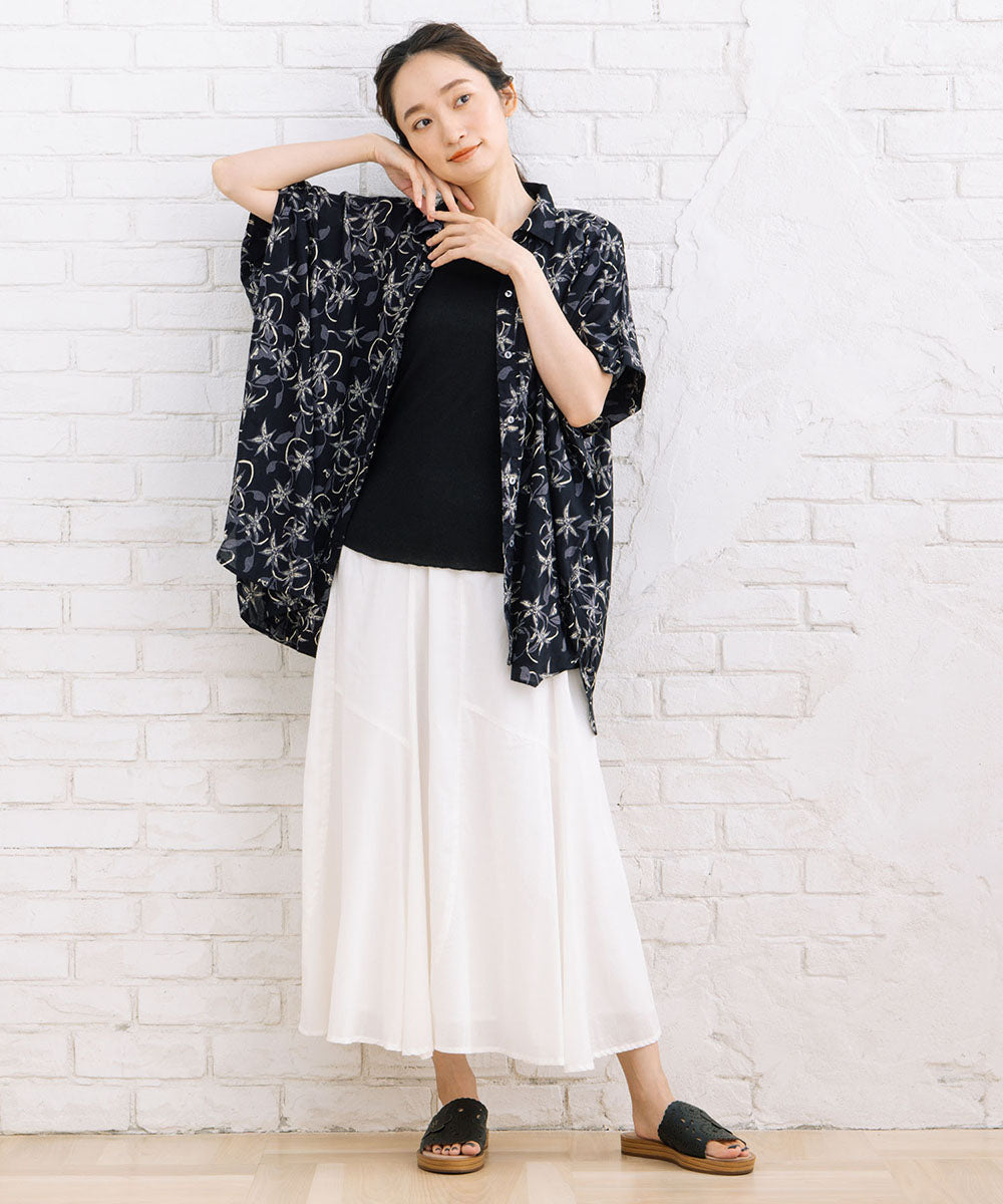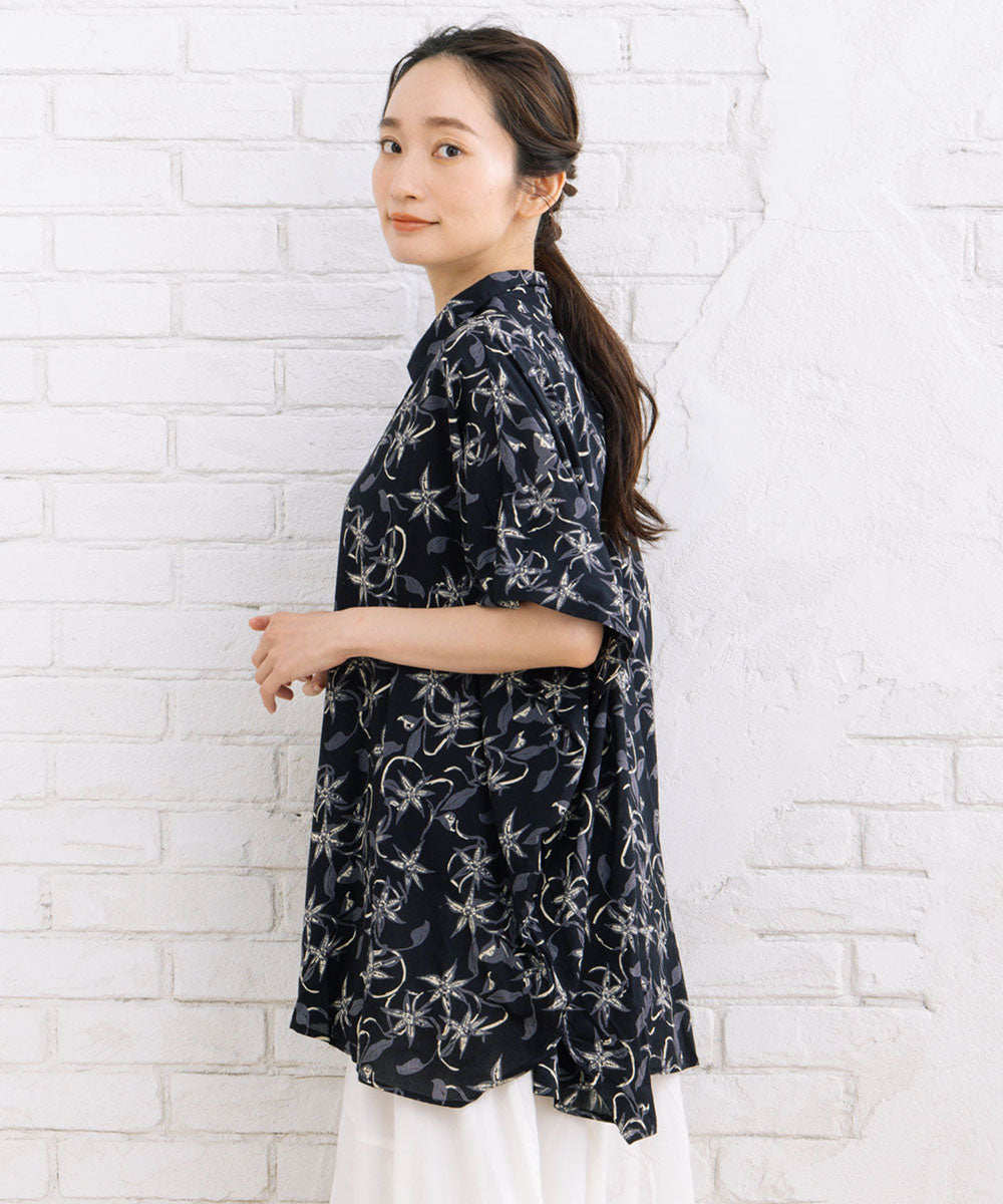華やかさと抜け感を両立したリーフプリントワイドシャツ。